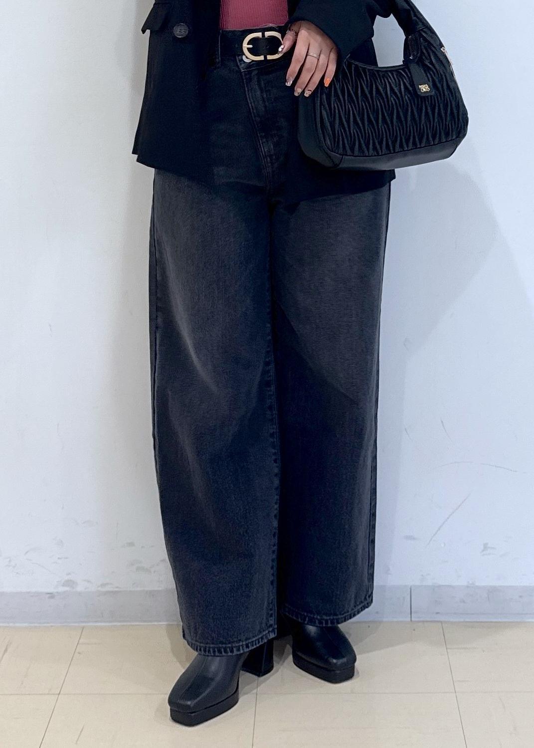 VIS【POLO BCS】VIS別注クロスベルトストレートワイドデニムチャコール / M¥9,900レビュー158cm骨格ウェーブでMサイズ着用しています。ウエストが緩いので、ベルトがないとローウエストになりますが、そのローウエスト感と裾の溜まり具合が可愛くてオシャレです。