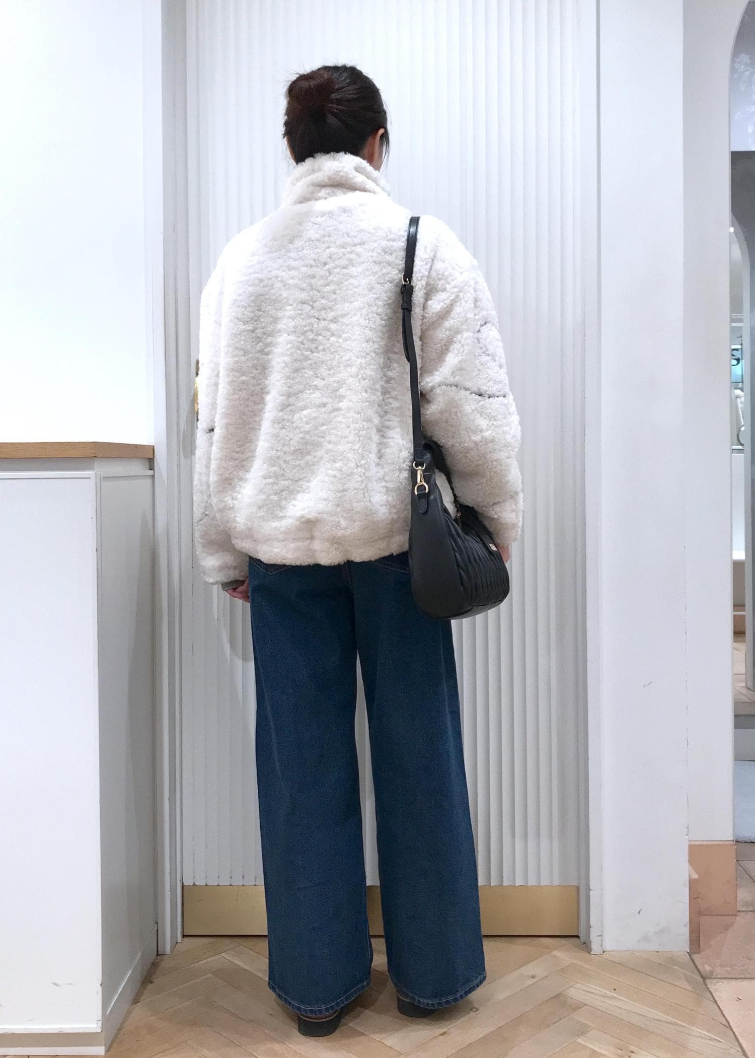 ふわふわなボアが可愛いボアブルゾンと楽ちんなデニムを合わせたカジュアルコーデです。