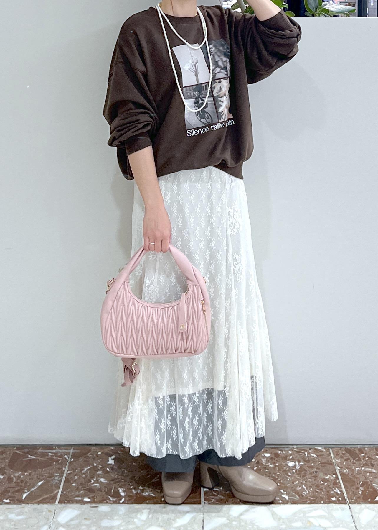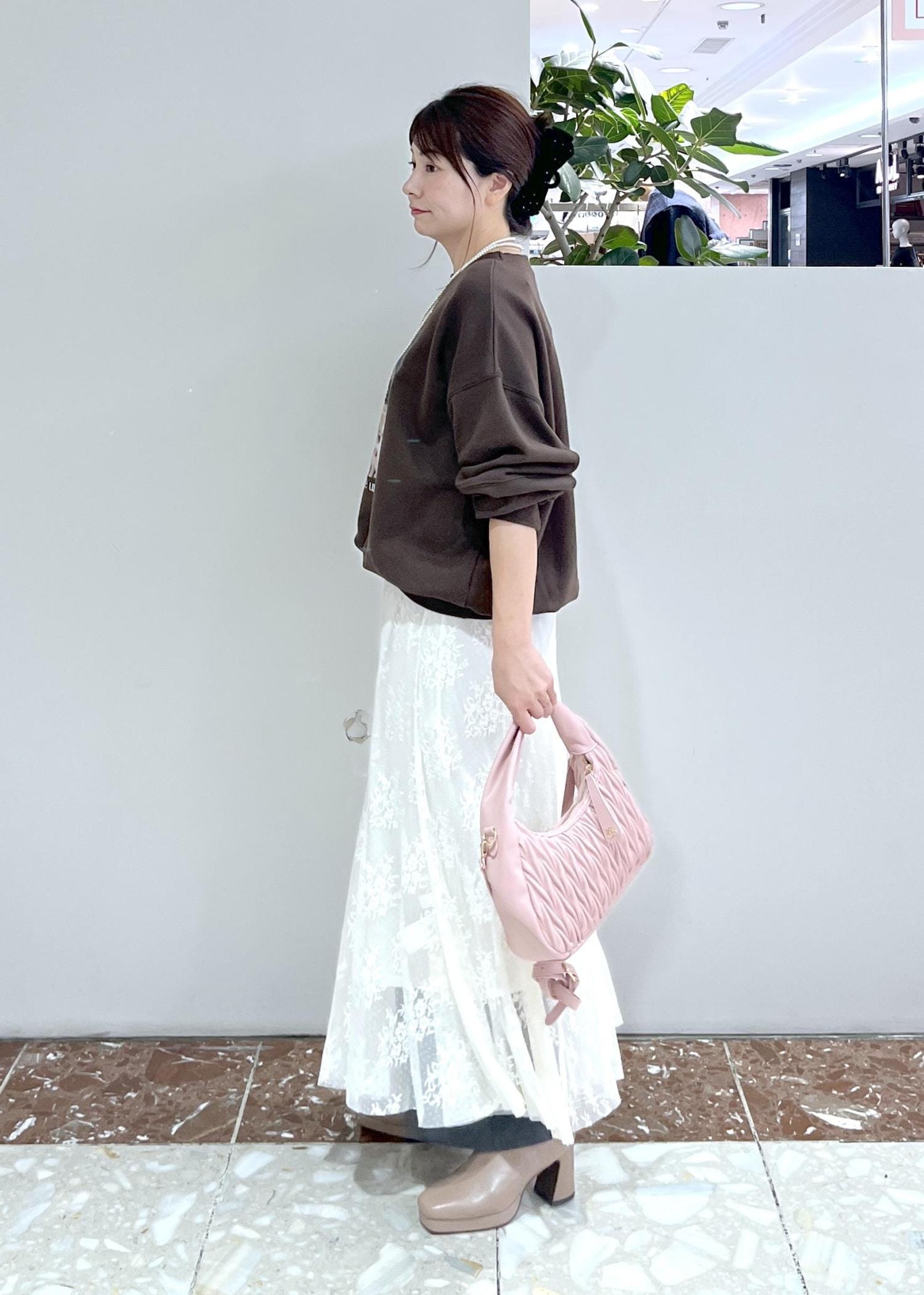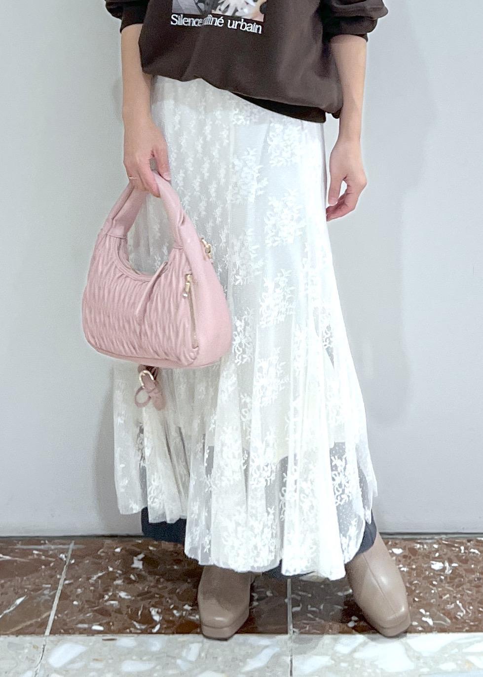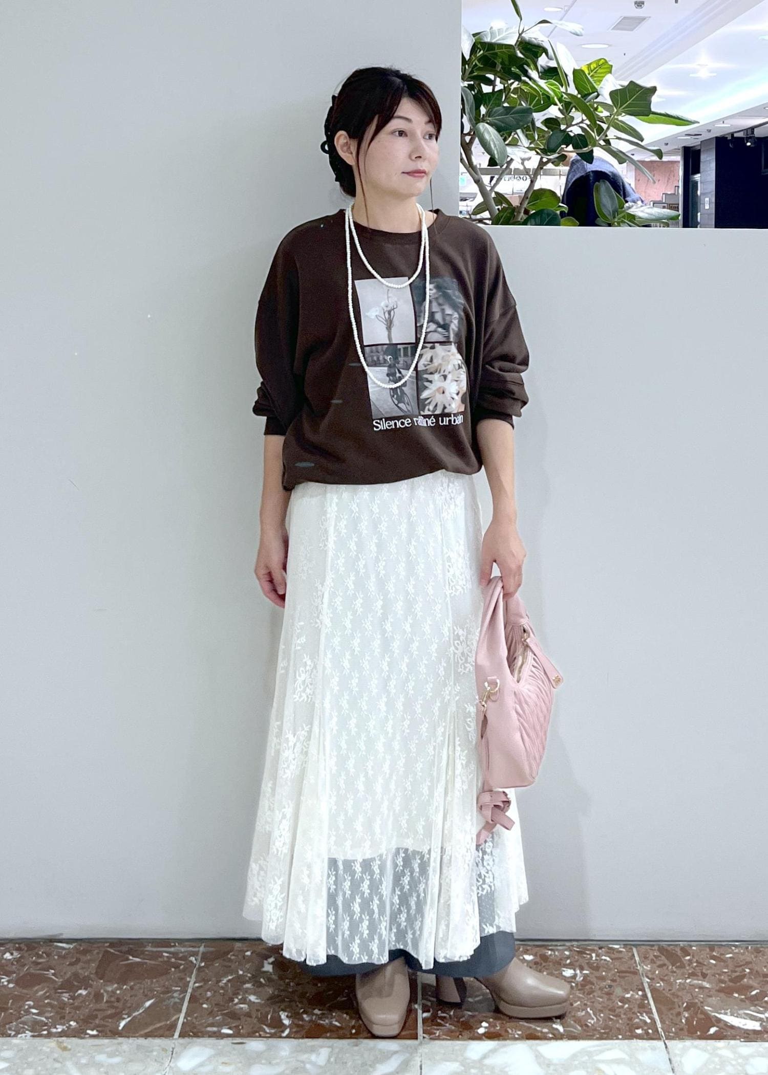 VISフィブリルサテン&レースアソートマーメイドスカートキナリ / F¥5,382レビュー156センチで足首までくる長さでした。ウエストがゴムなので上に上げて調節して履くことが出来ました。繊細なレースが可愛いです。キナリはレースとセパレートでインナーが取り外せて便利です。