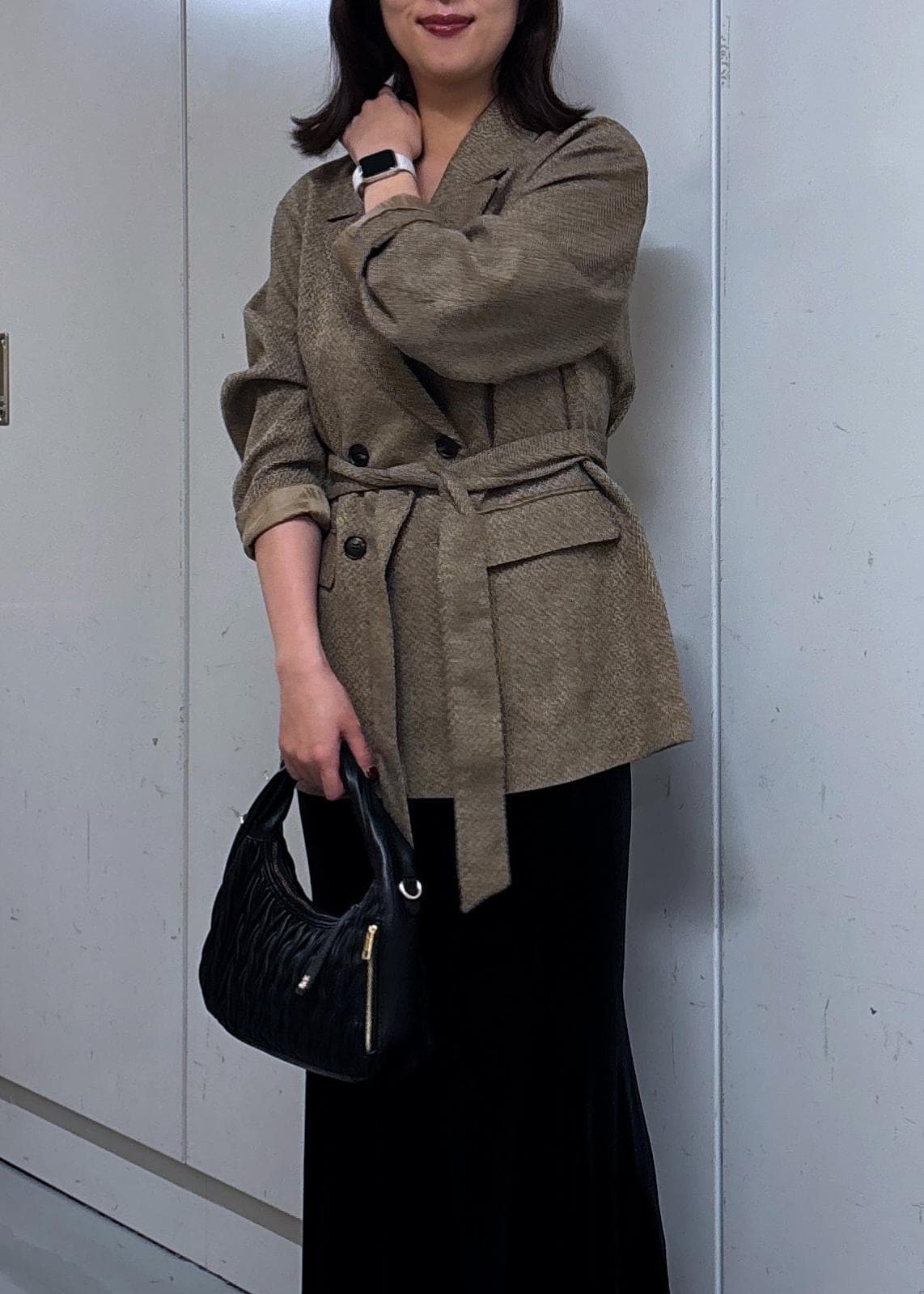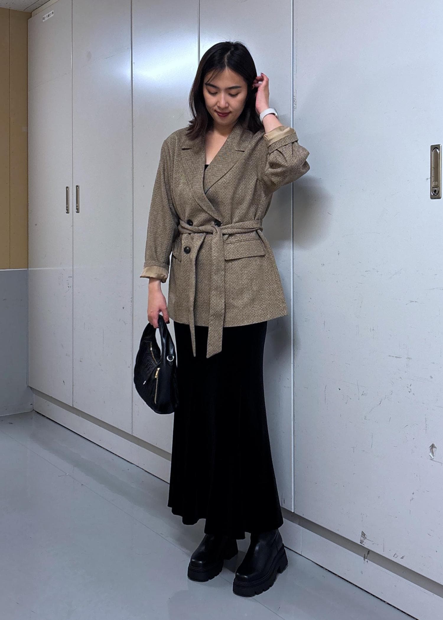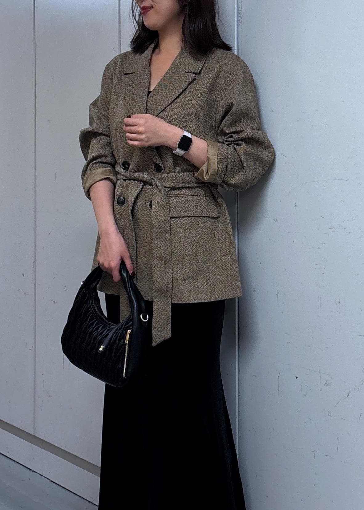 VISヘリンボーンツイードベルテッドジャケット/セットアップ対応ベージュ系 / F¥9,999レビュー着丈長く、身長173センチ座高が高い私でもお尻隠れる長さです。小柄な方ならミニボトム合わせてロングブーツが可愛いです。ウエストマークできるのでスッキリしたシルエットで着こなせます。