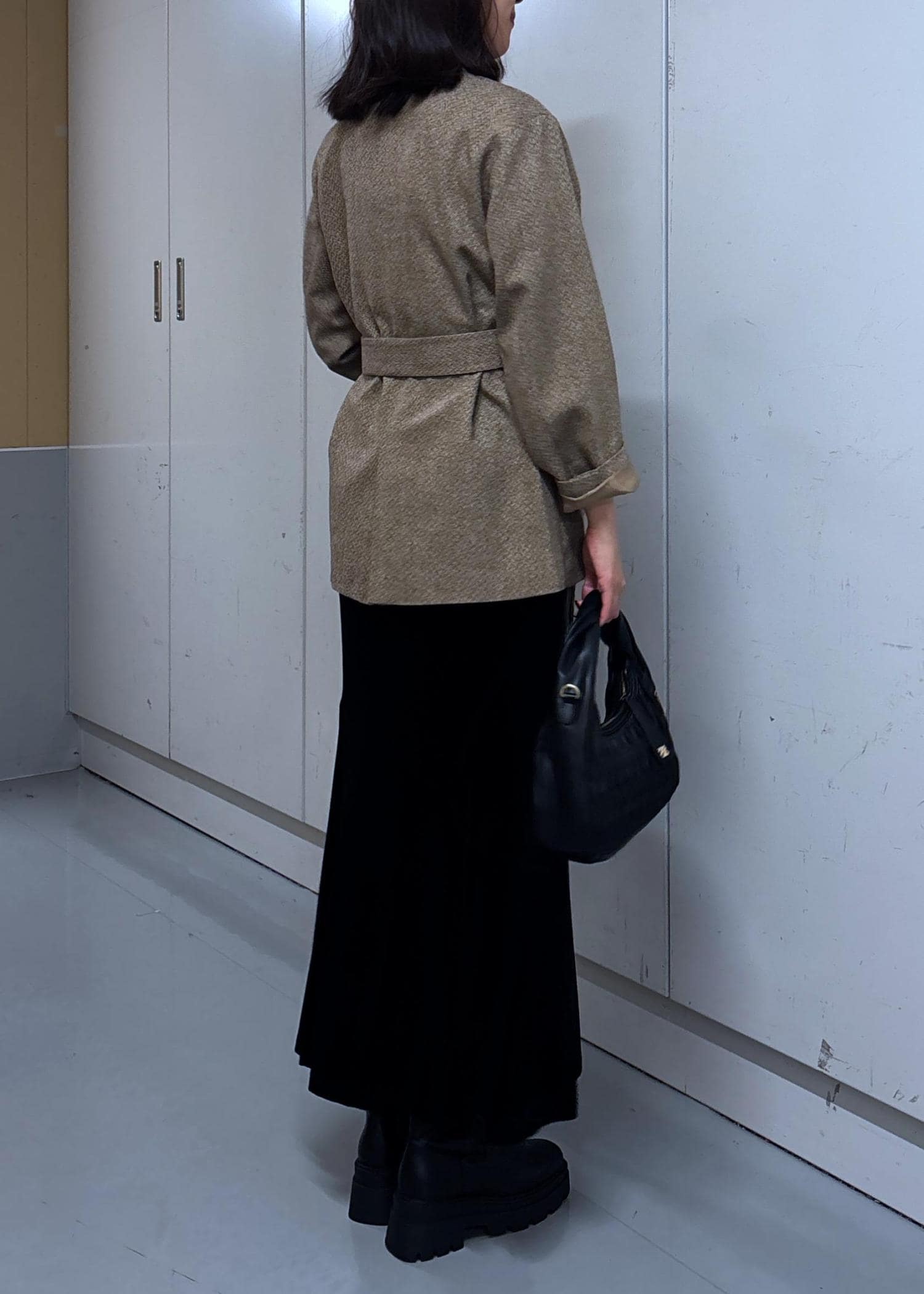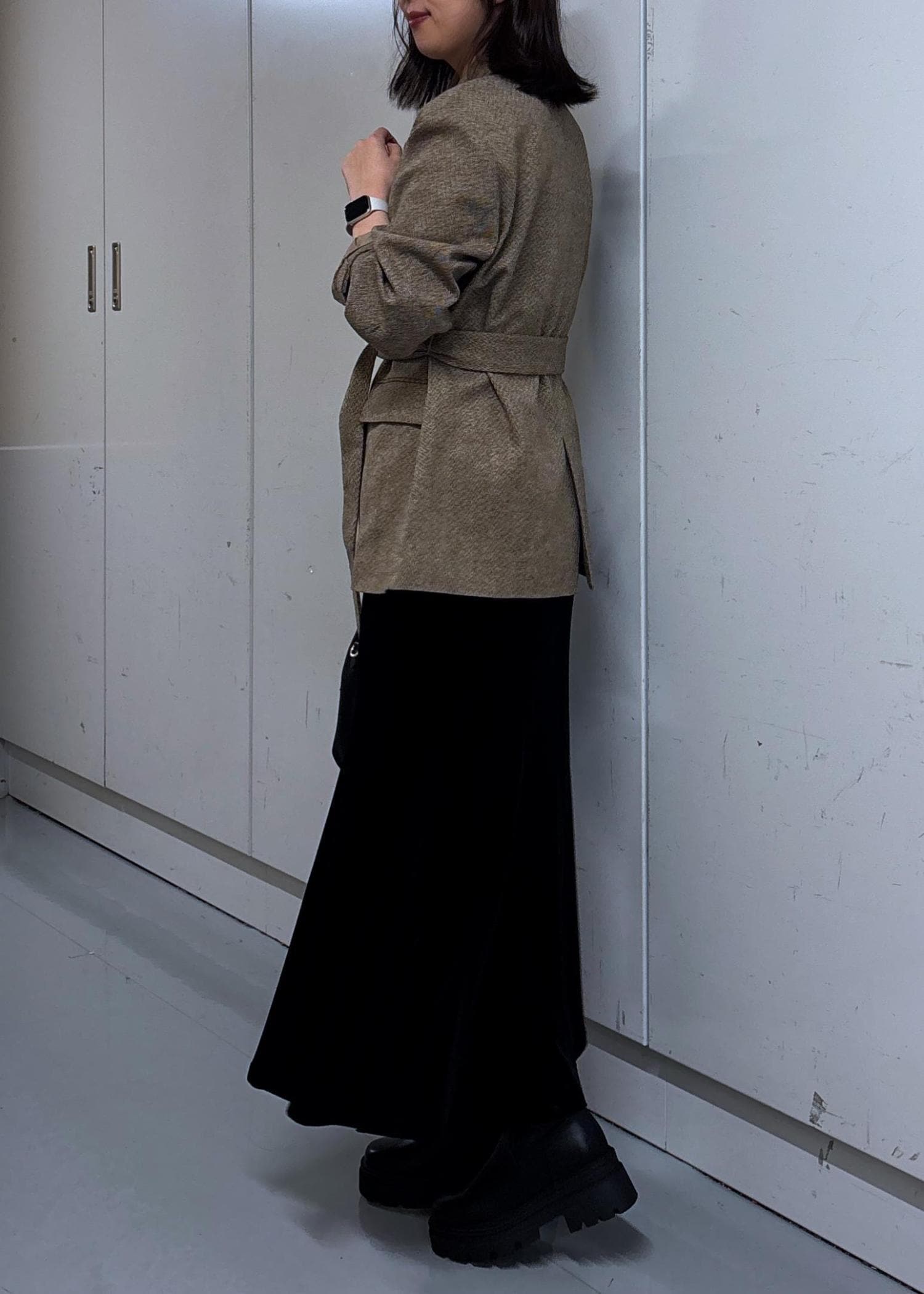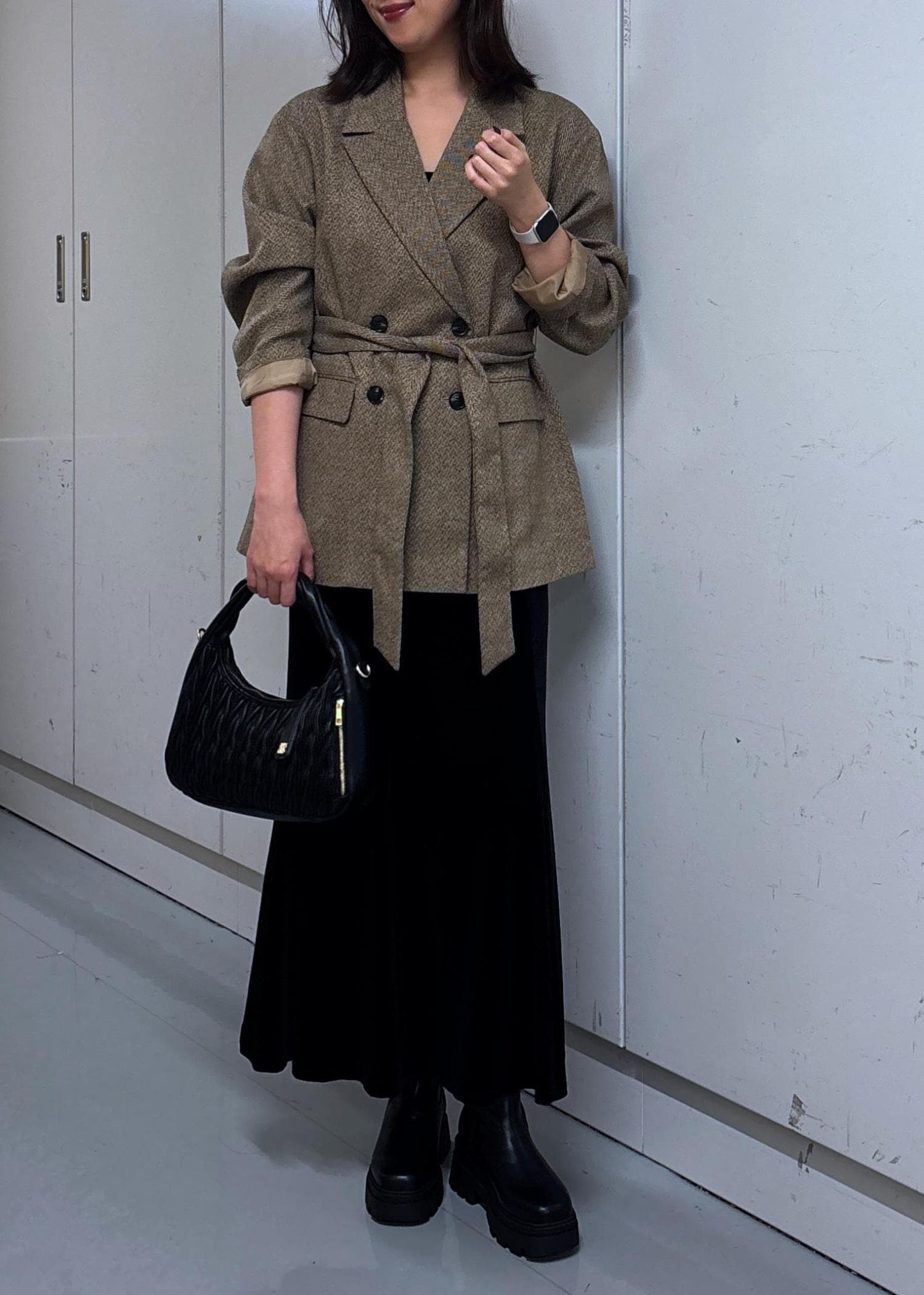 VISヘリンボーンツイードベルテッドジャケット/セットアップ対応ベージュ系 / F¥9,999レビュー着丈長く、身長173センチ座高が高い私でもお尻隠れる長さです。小柄な方ならミニボトム合わせてロングブーツが可愛いです。ウエストマークできるのでスッキリしたシルエットで着こなせます。
