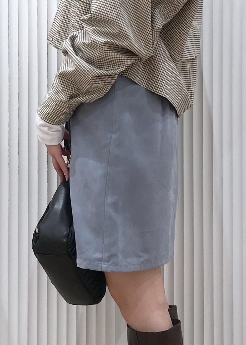 スエードのブルースカートとチェックブルゾンを合わせたカジュアルコーデです。