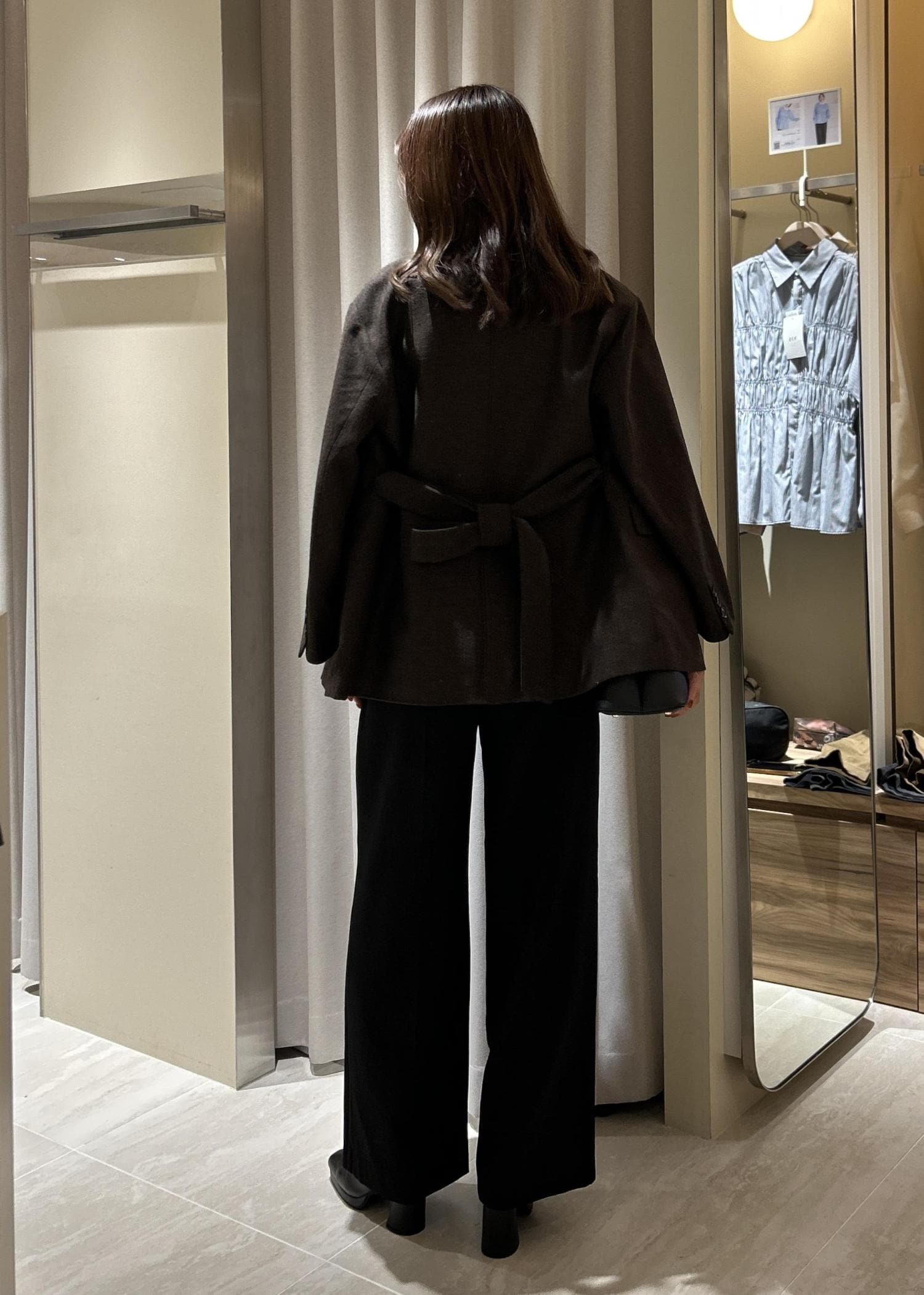 付属のベルトがついているのでウエスト部分を絞って着たり前でリボン結びをしたりと着方とシルエットを変えられるジャケットです。 -