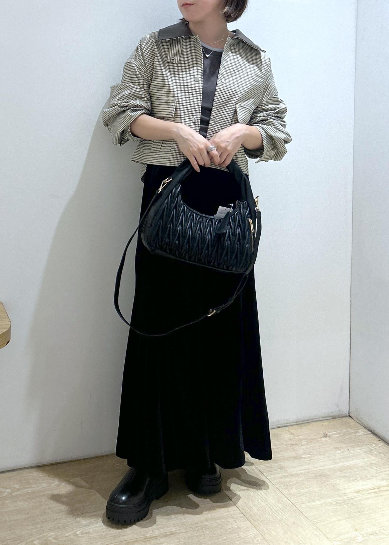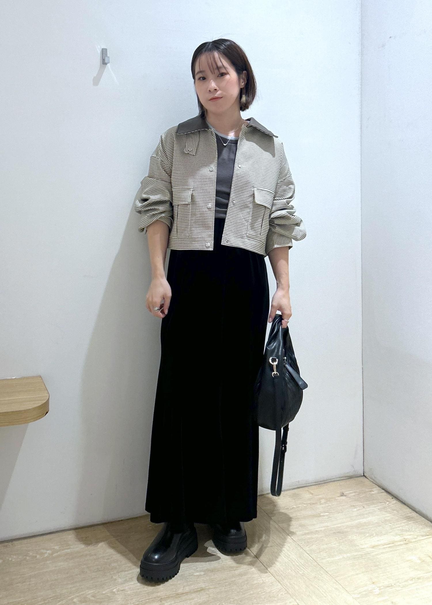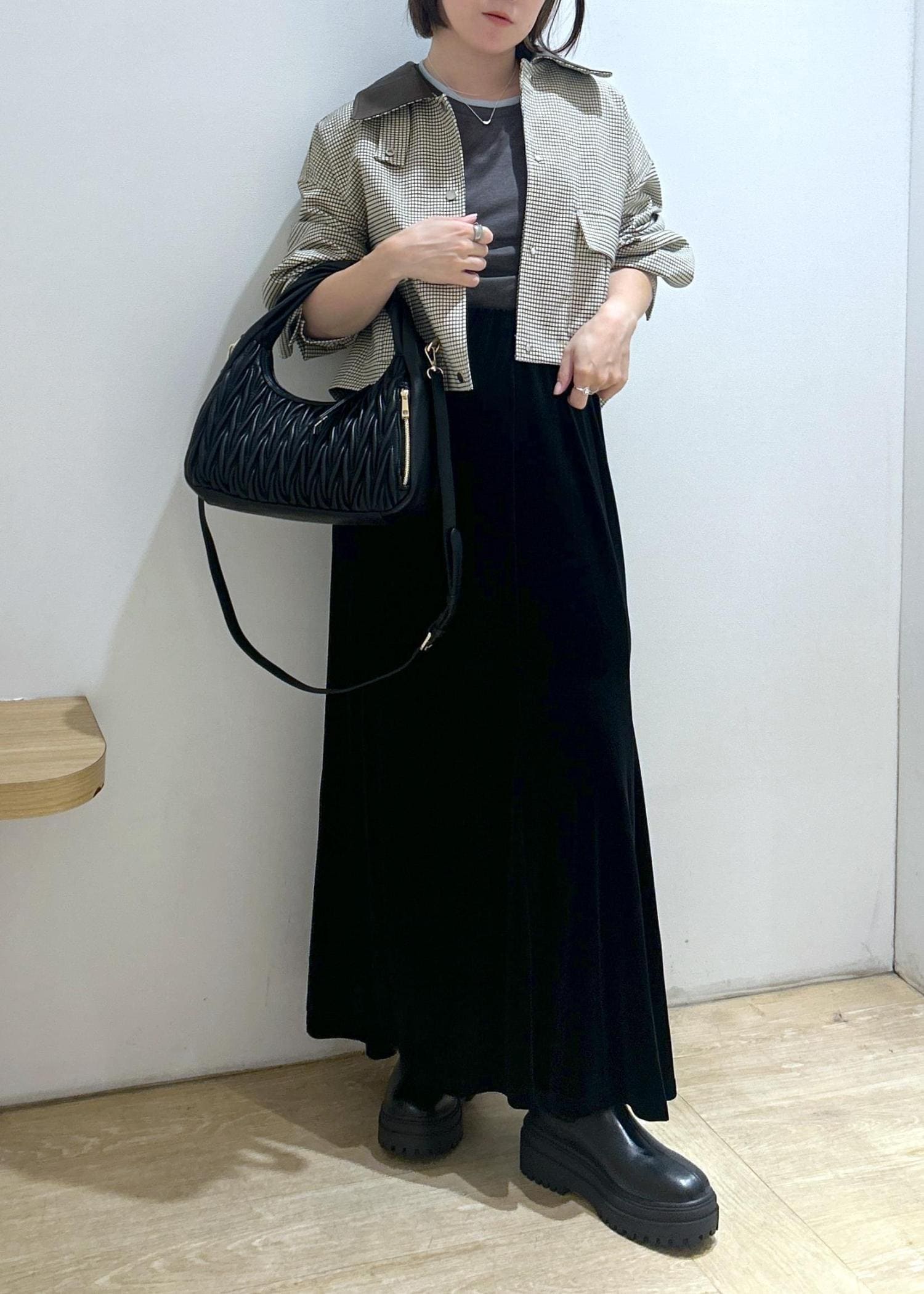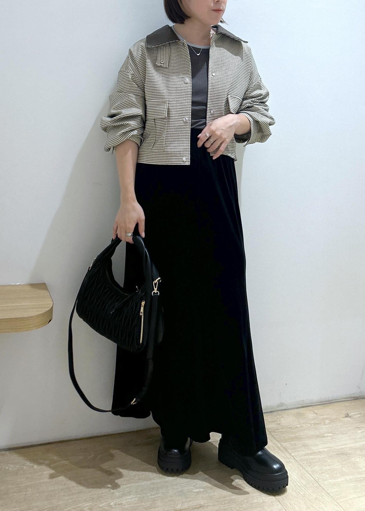 カジュアルなチェック柄ブルゾンをベロア素材のロングスカートで大人な印象に◎