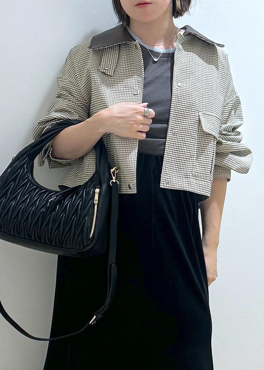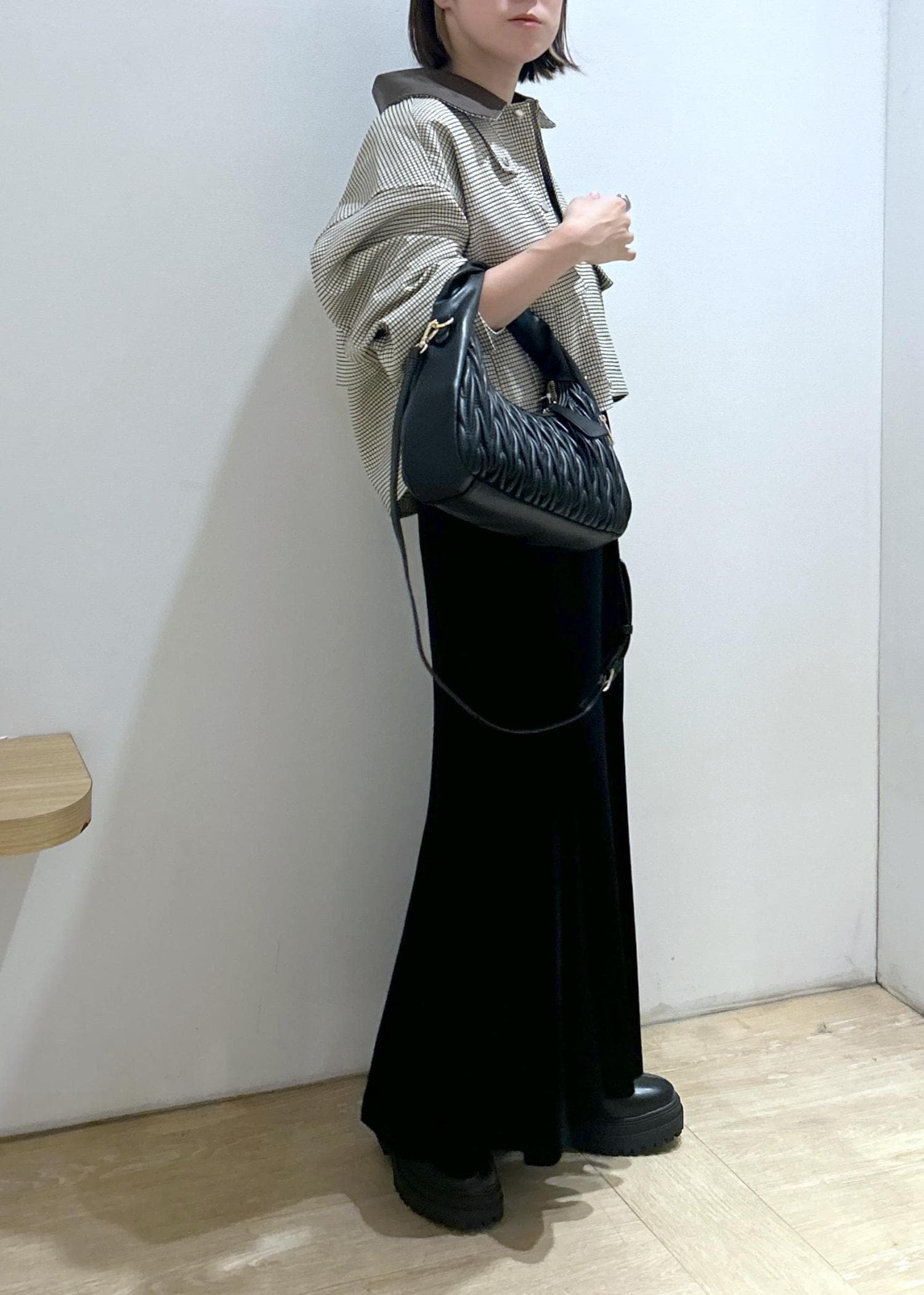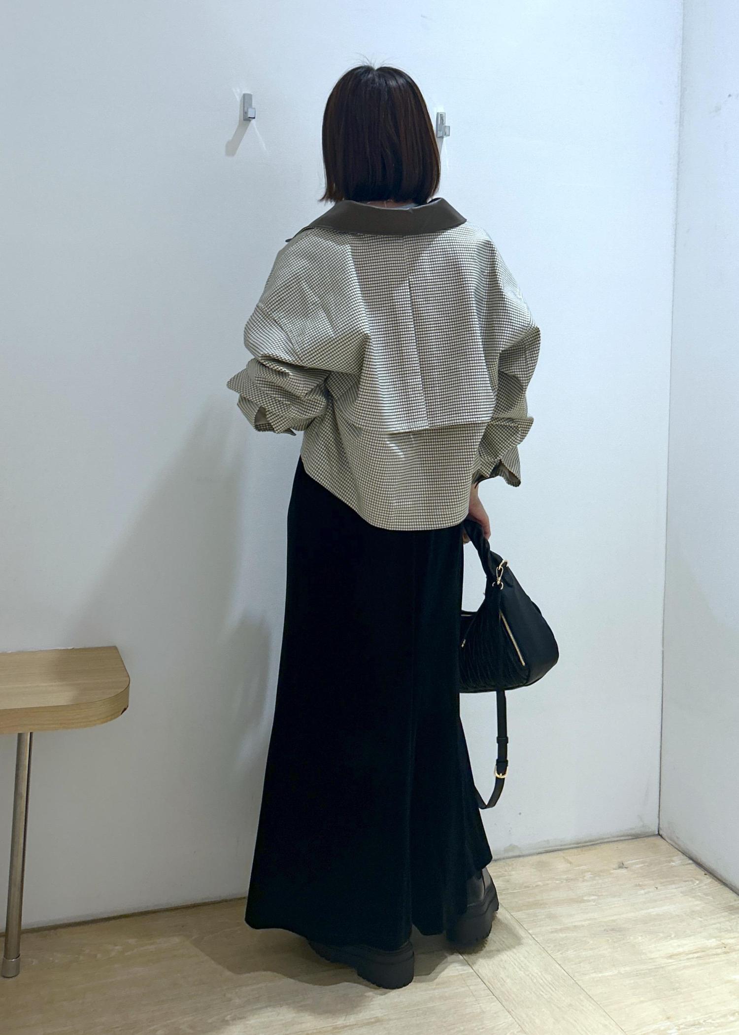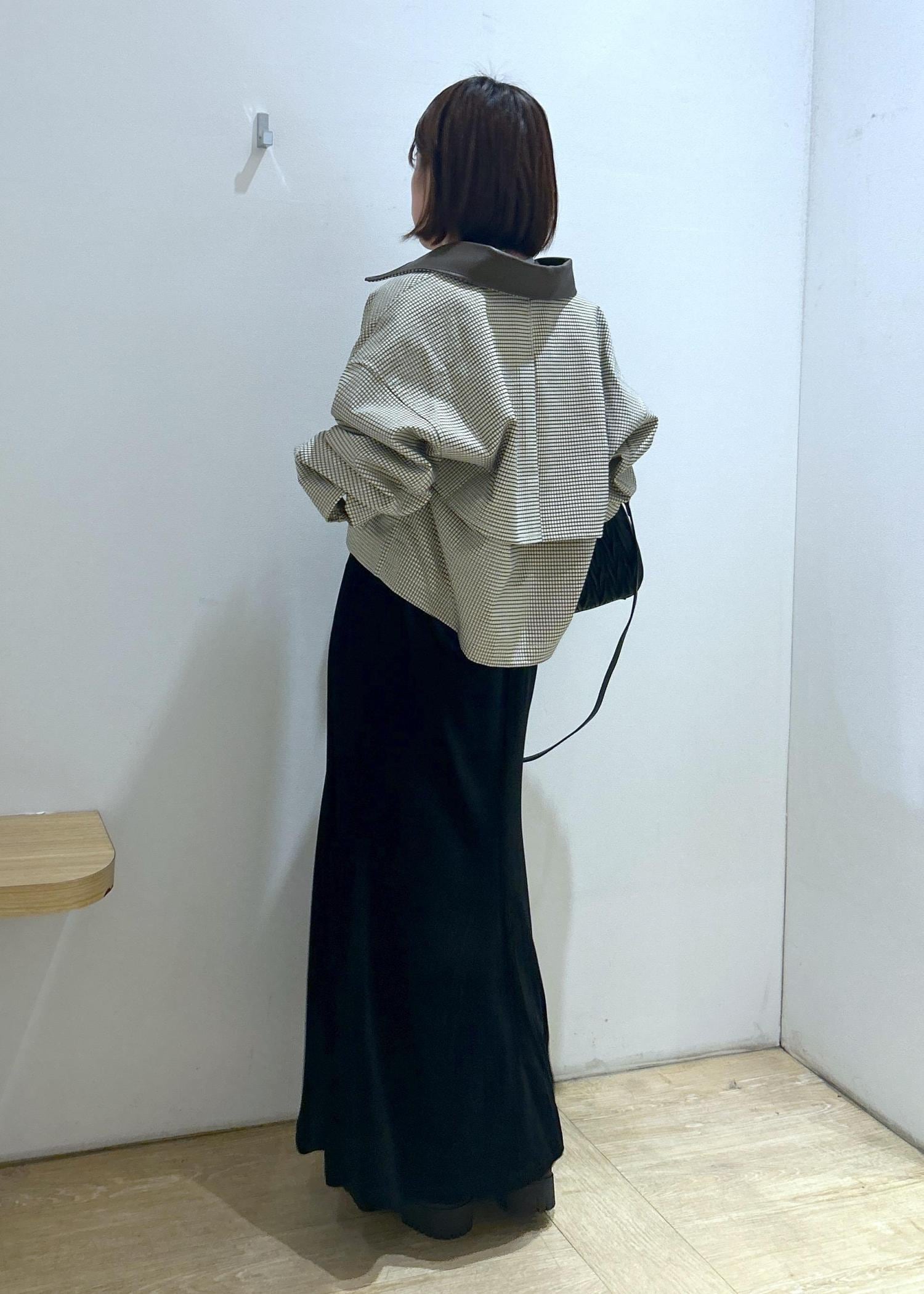 カジュアルなチェック柄ブルゾンをベロア素材のロングスカートで大人な印象に◎
