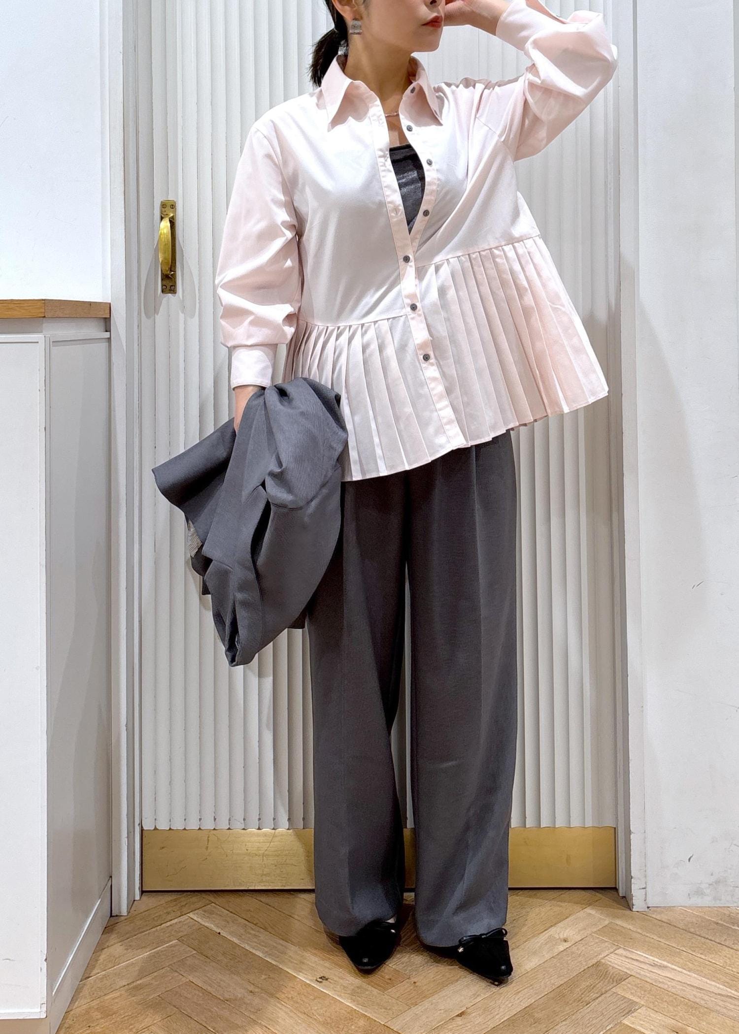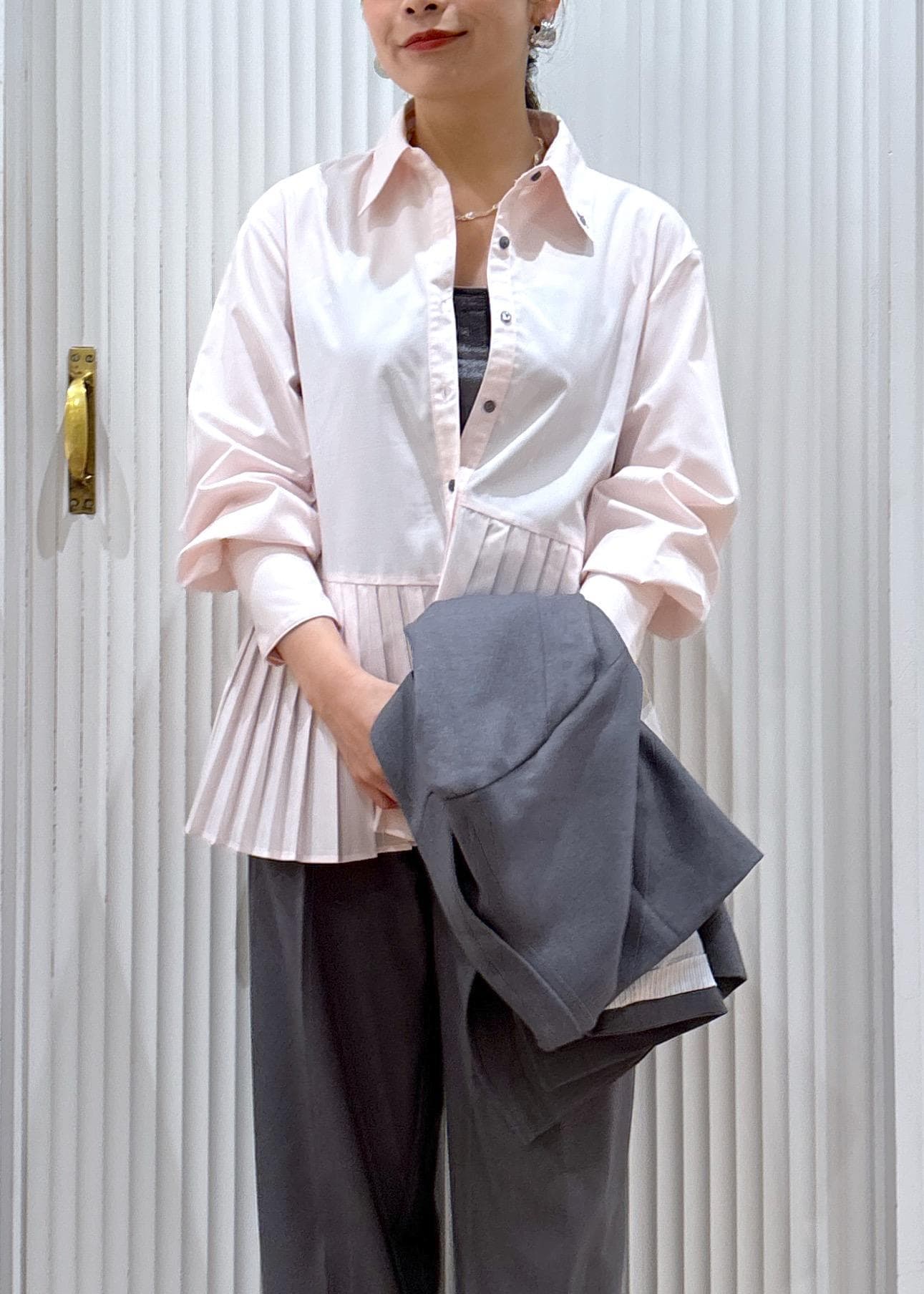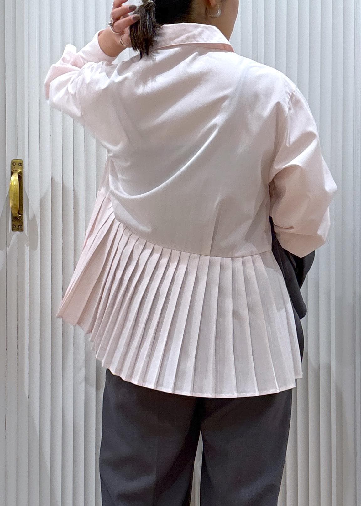 ジャケットのインナーやカーディガン、プルオーバーのインナーとしてレイヤードしても可愛いプリーツシャツ!