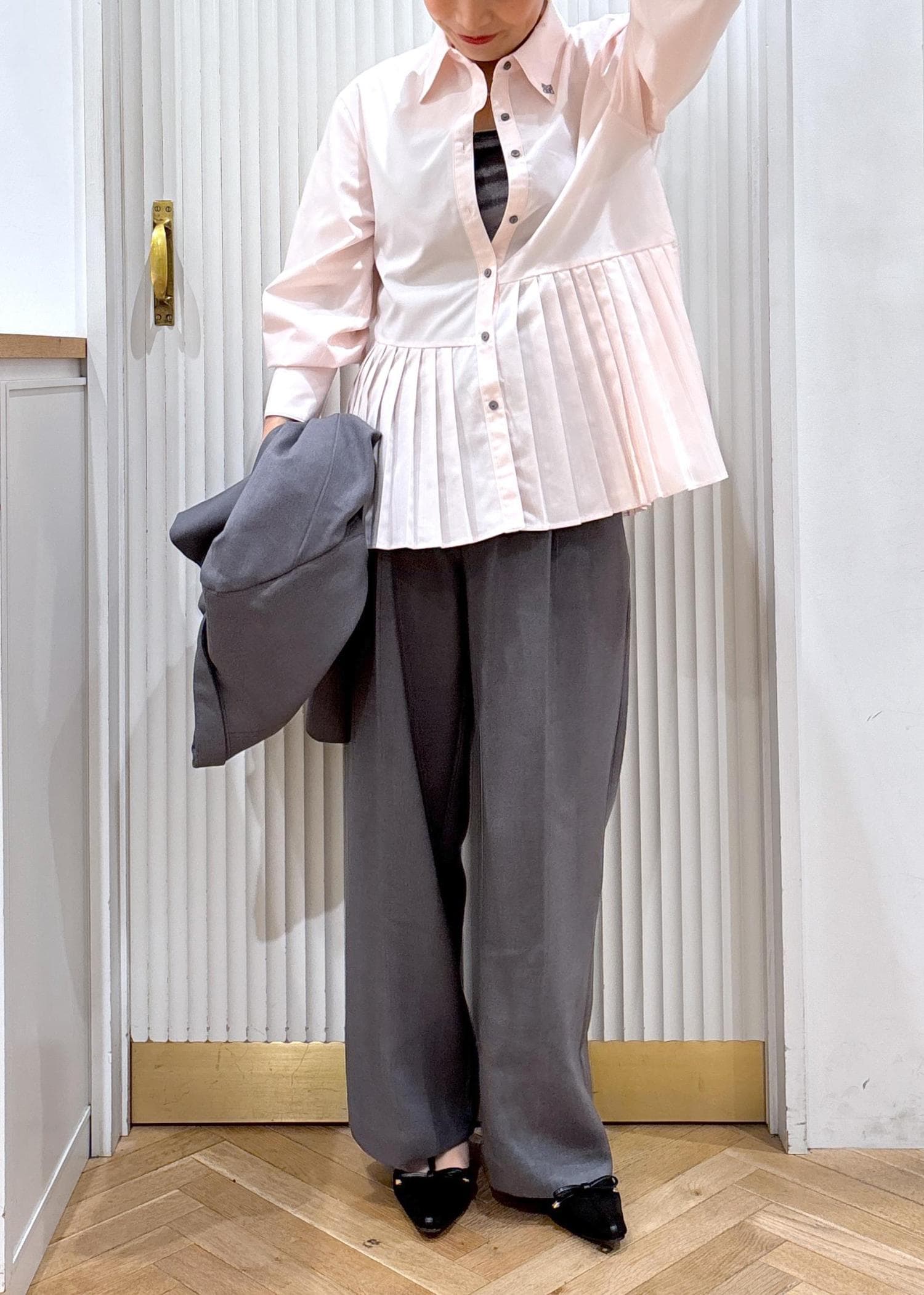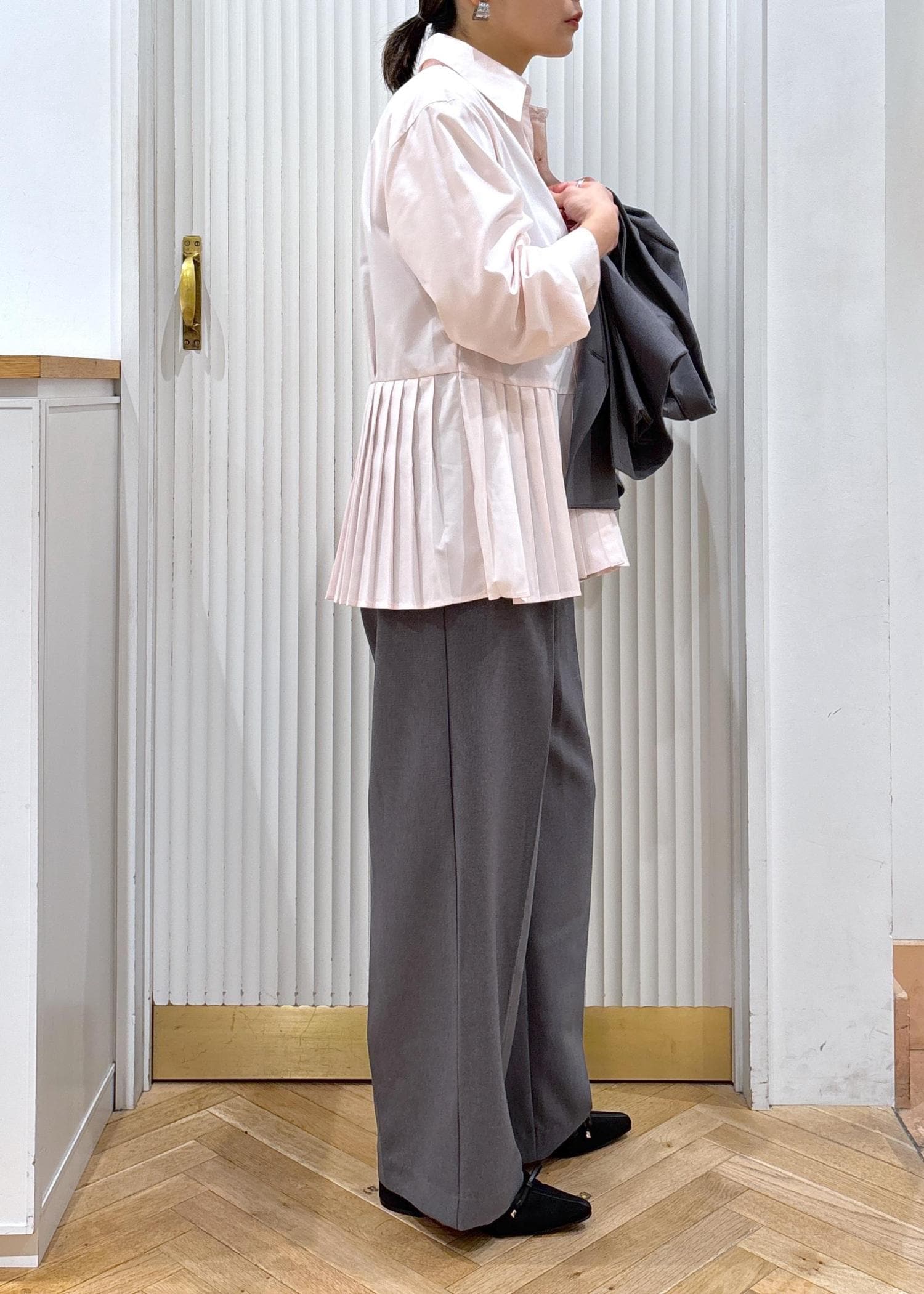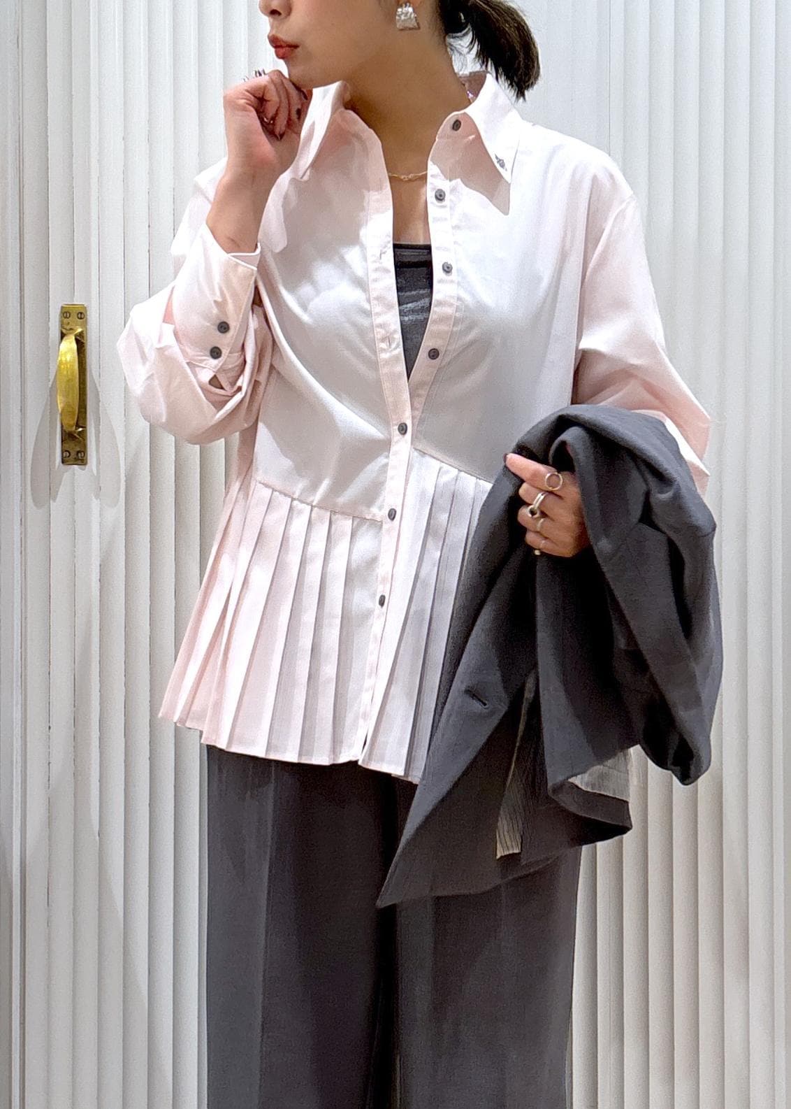 ジャケットのインナーやカーディガン、プルオーバーのインナーとしてレイヤードしても可愛いプリーツシャツ!