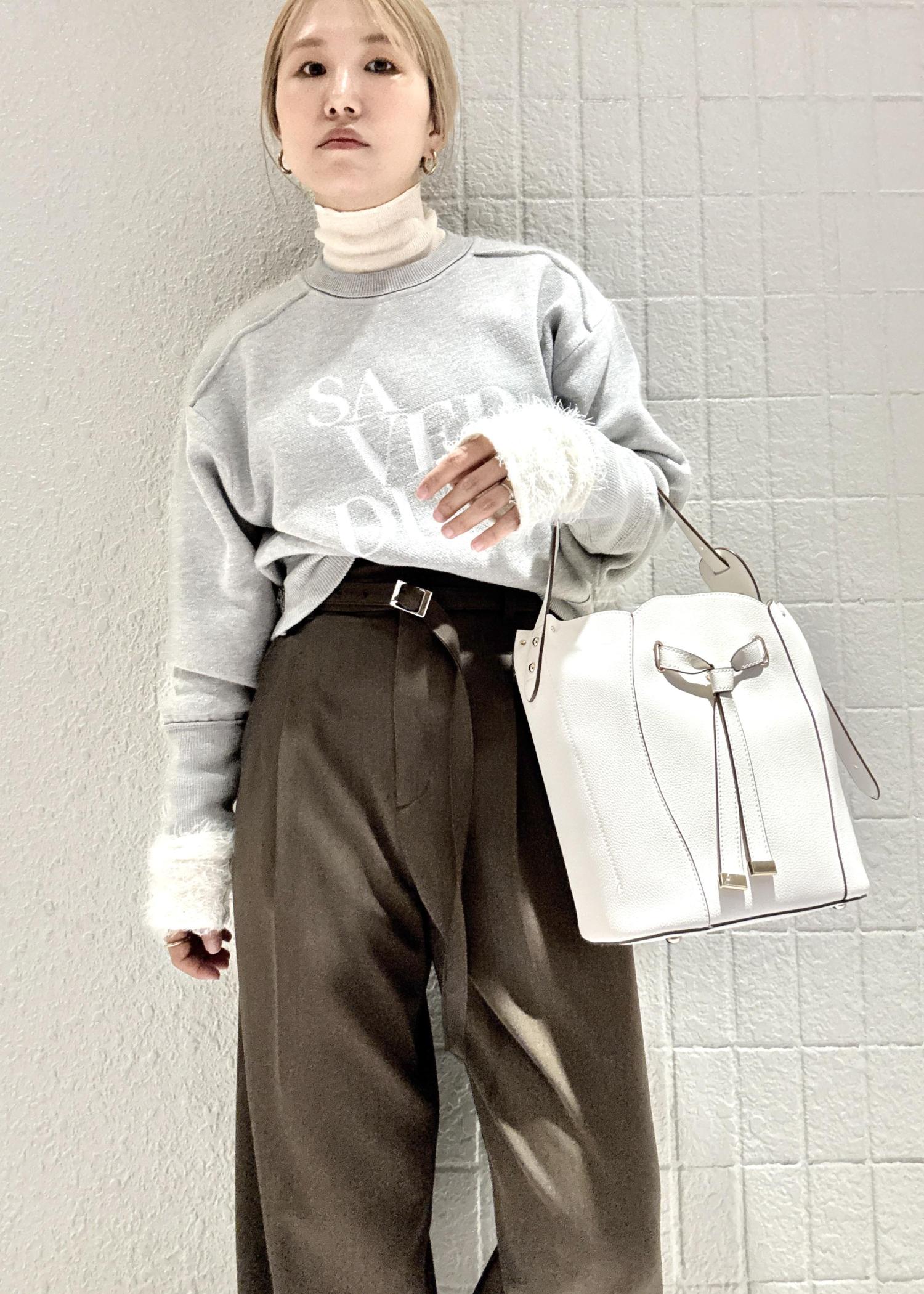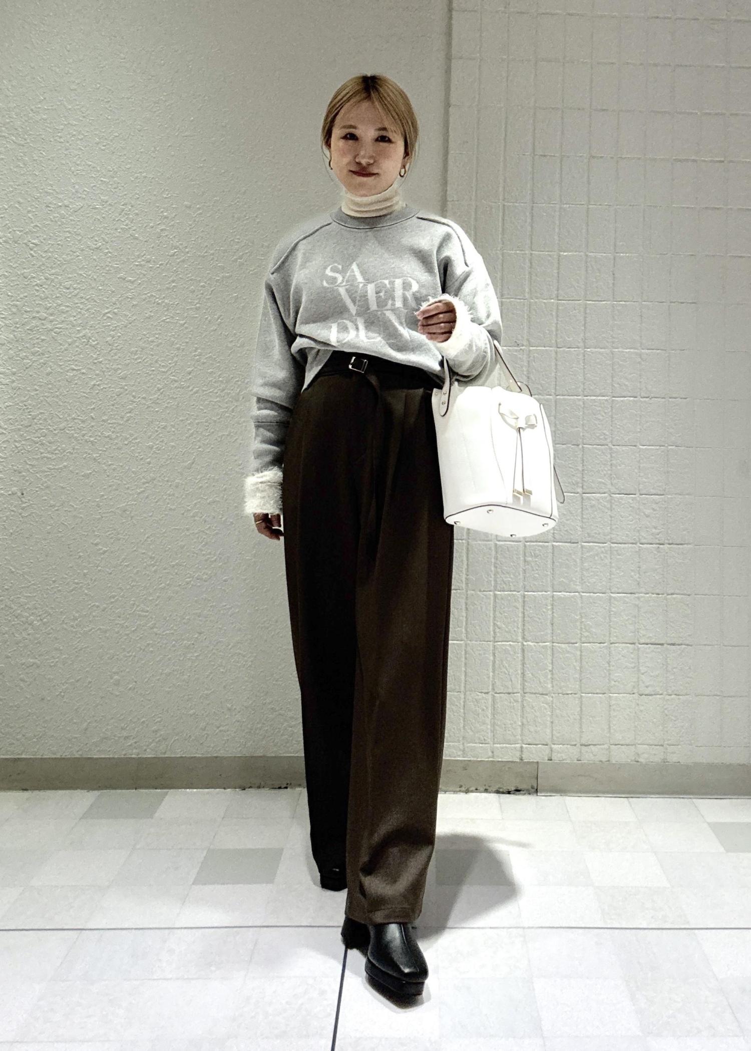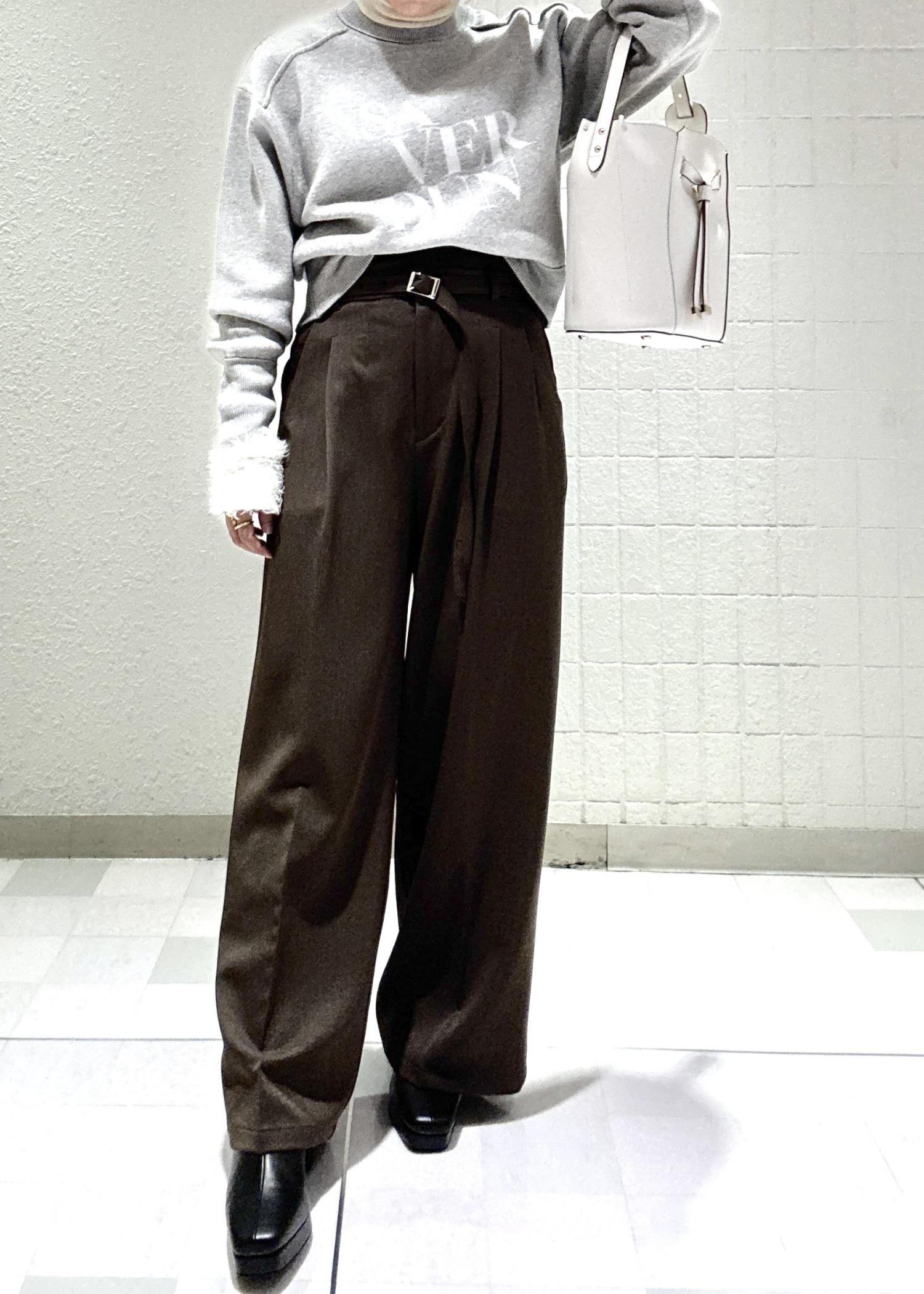 パンツもハイウェストのパンツなので前だけ少しインして腰位置を高く見せてスタイルアップした印象に。