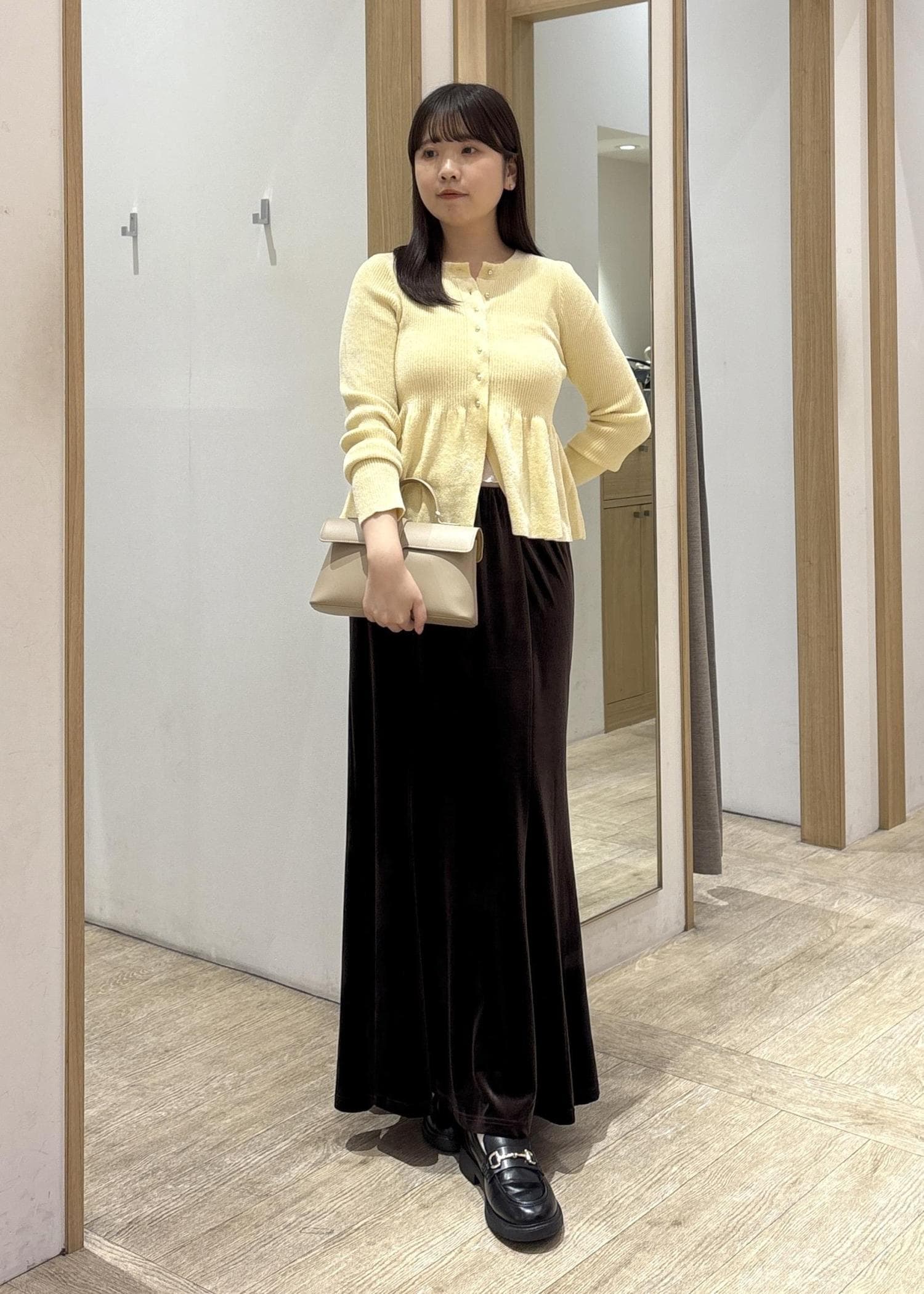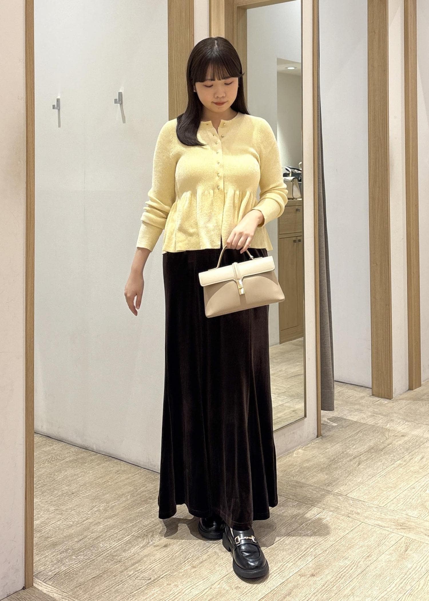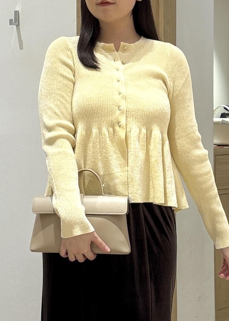 VISペプラム切替モールニットカーディガン/イージーケアイエロー系 / F¥6,589レビューふんわりとしたペプラムシルエットで、骨格ストレートさんの上重心を自然にカバー。
