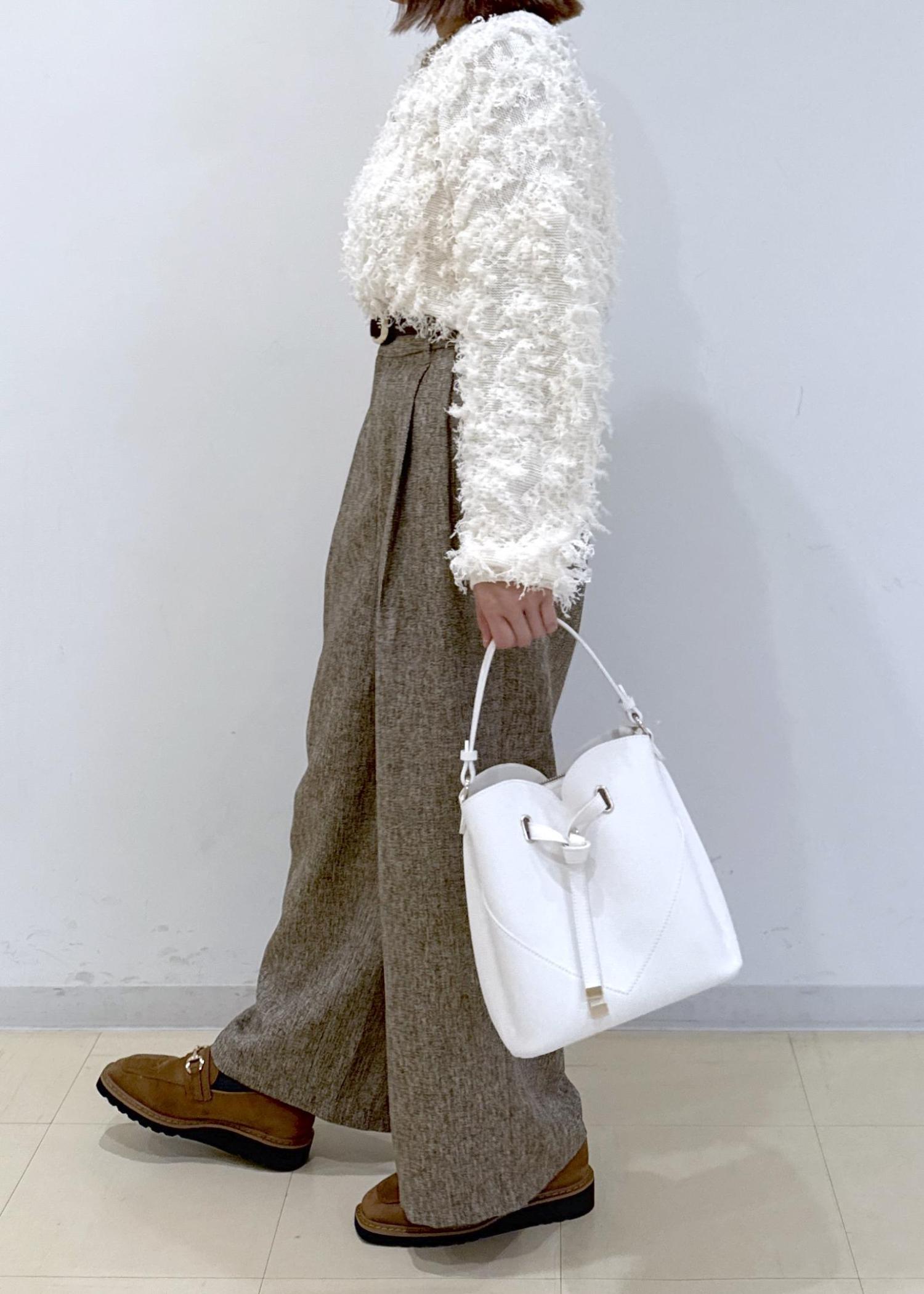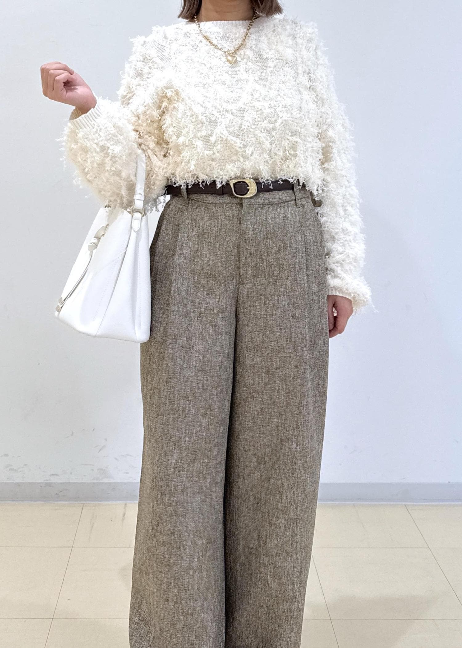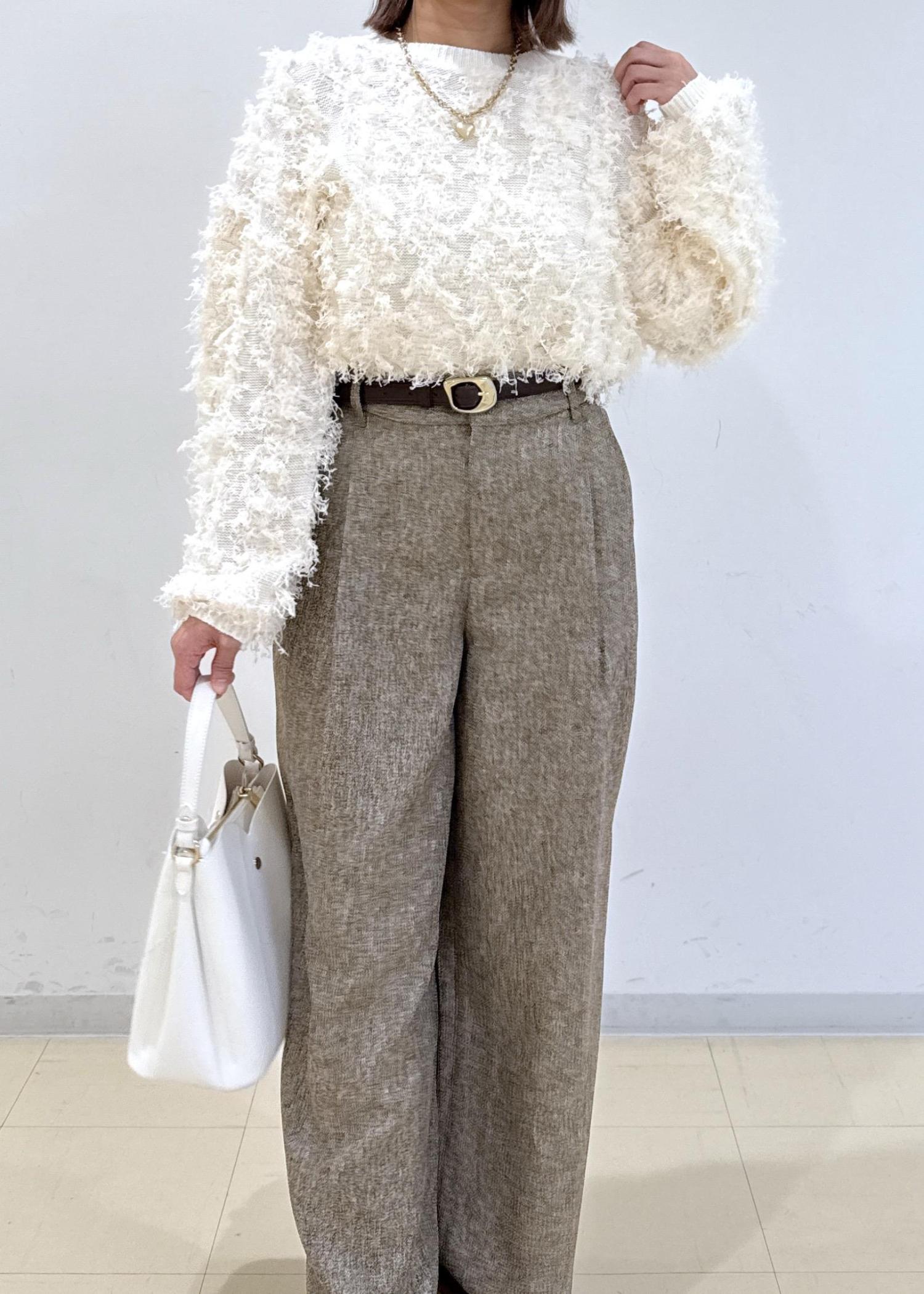 ベージュのパンツに白のニットを合わせたシンプルな淡色コーデにしました♩