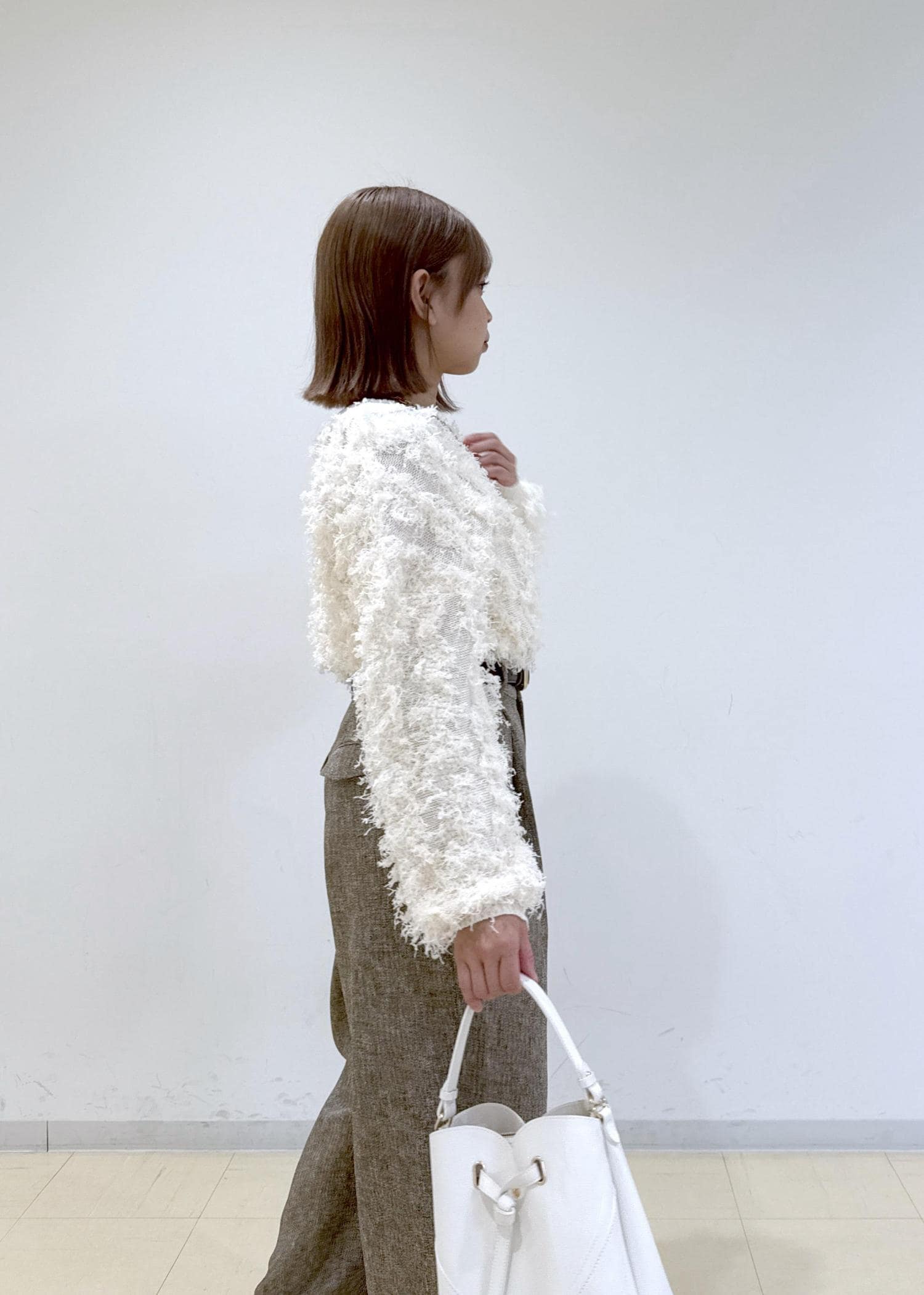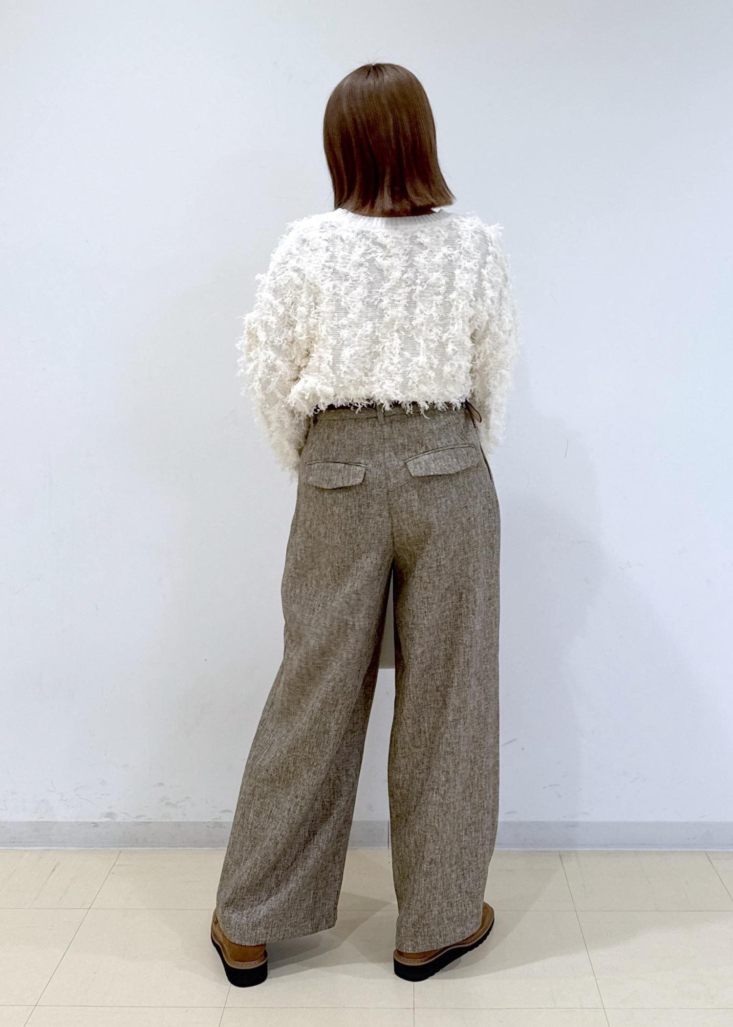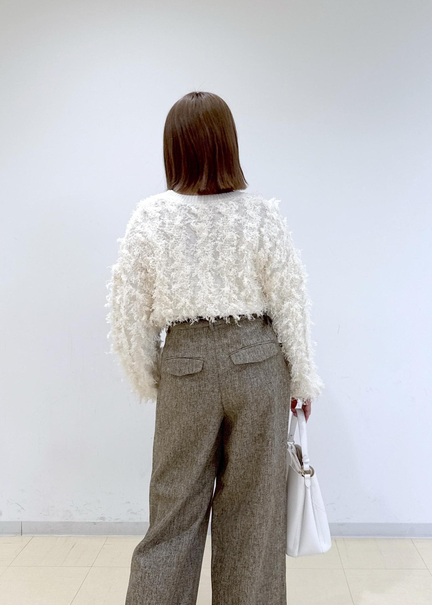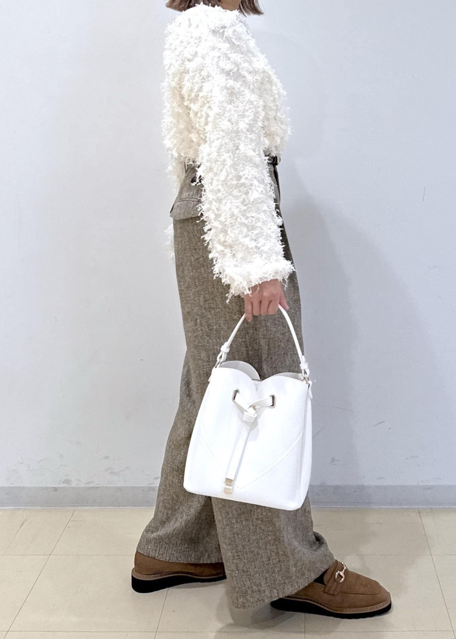 ベージュのパンツに白のニットを合わせたシンプルな淡色コーデにしました♩