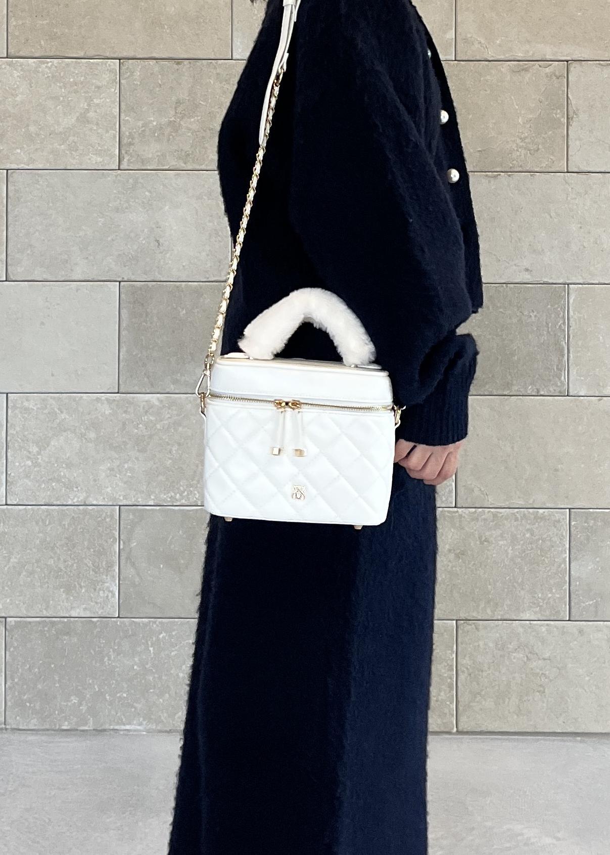 VISファーハンドルキルティング&ツイードバニティバッグ/2WAYオフホワイト / F¥7,909レビューハンドル部分のファーがファスナーで取り外しができるので、コーディネートによって変化を楽しめるバッグです。コンパクトサイズなので、持つだけで女子力UP。ミニ財布やポーチ、携帯など必要なアイテムは入れられるサイズ感。手持ちにもショルダーにもなります。