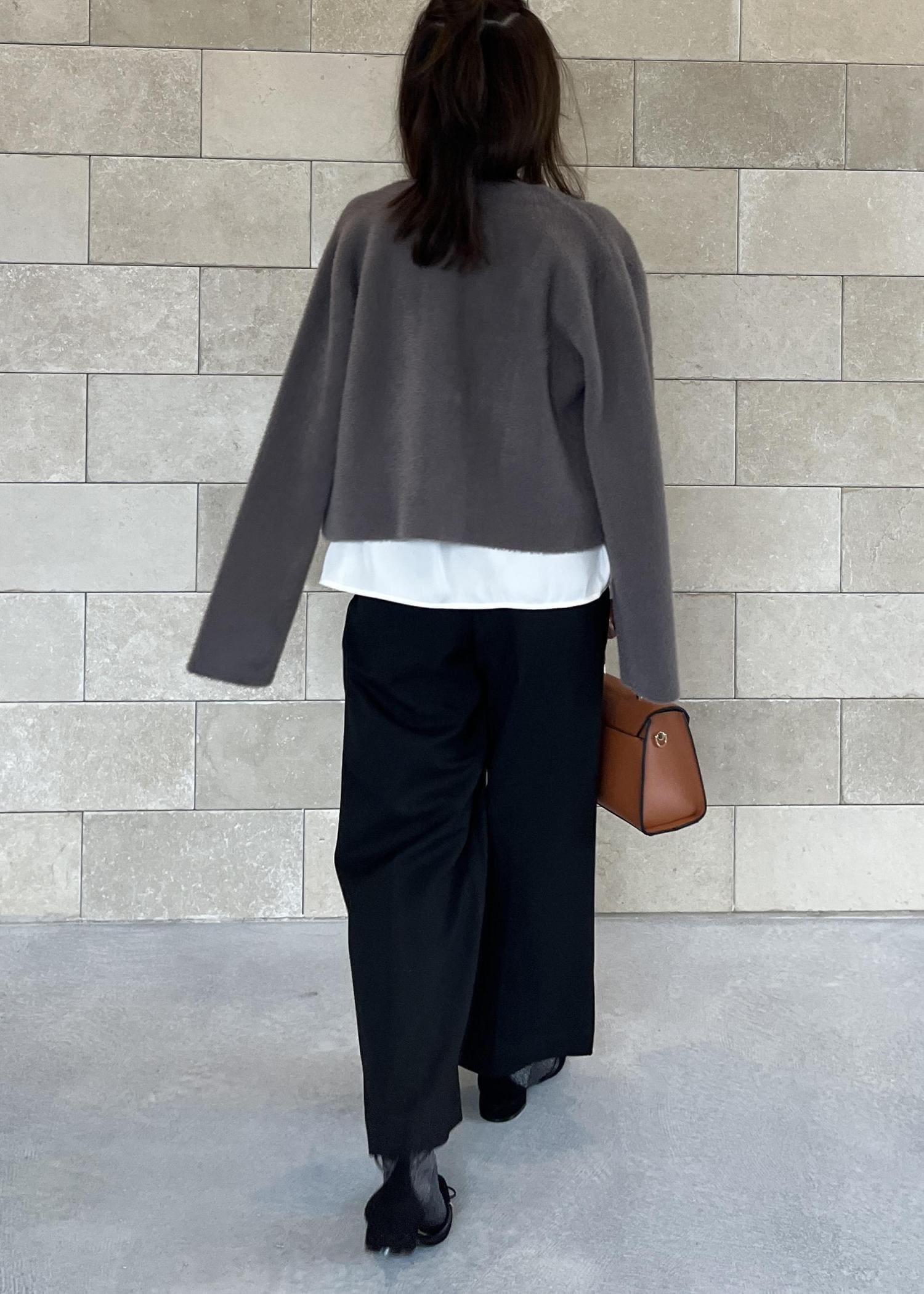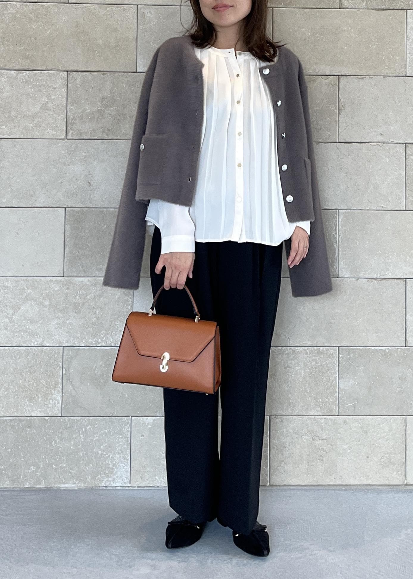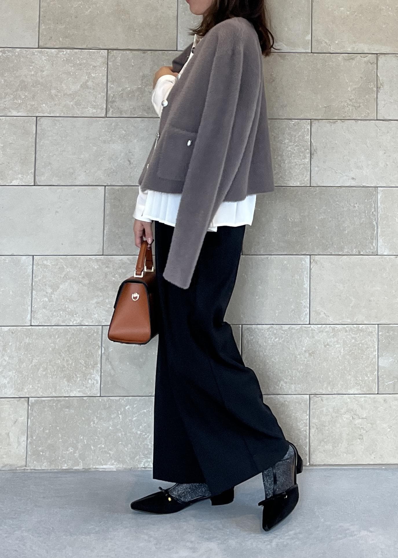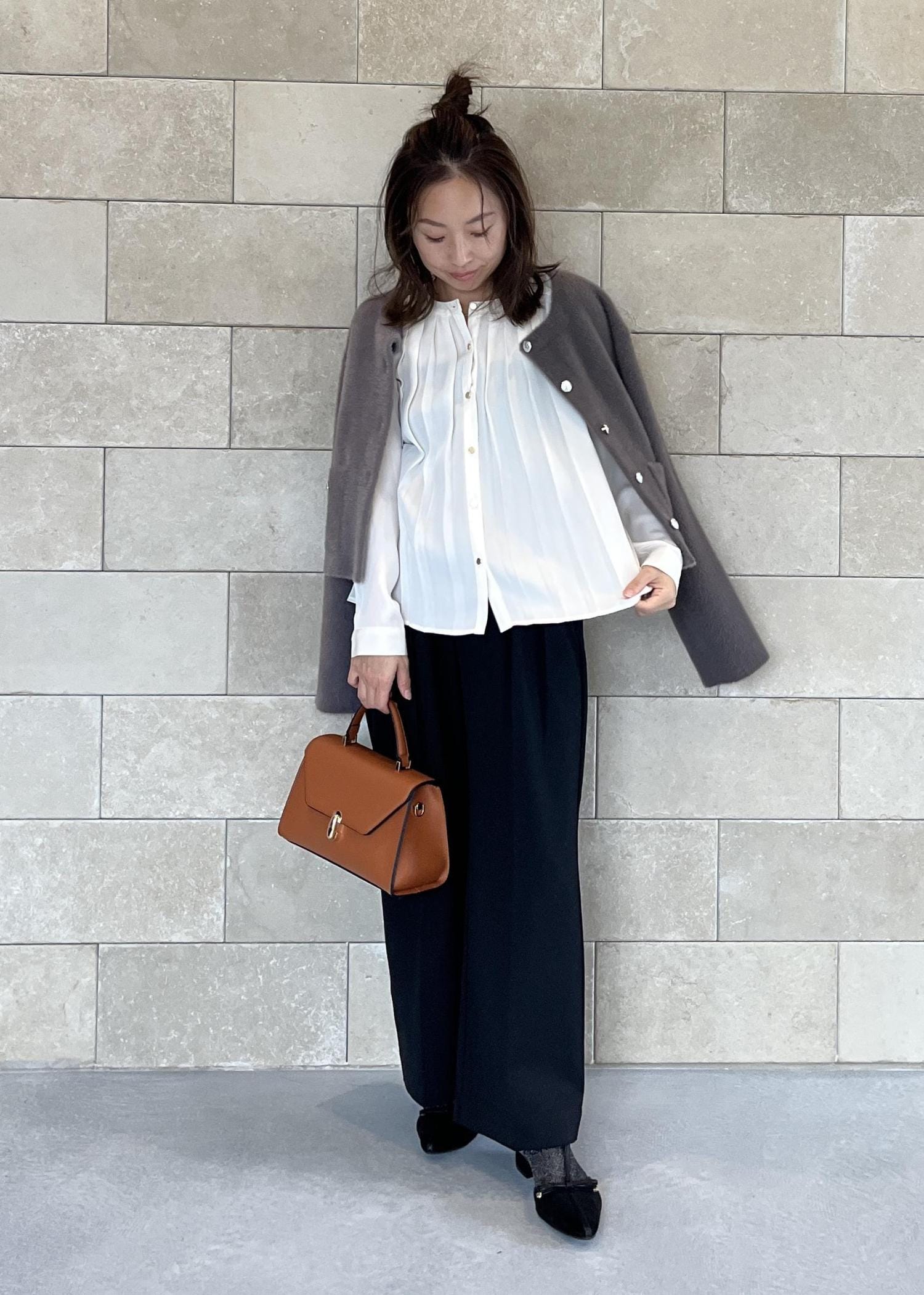 ブラウス×ワイドパンツの定番コンビも、やわらかいグレーカーデを肩掛けするだけで一気にこなれ感。