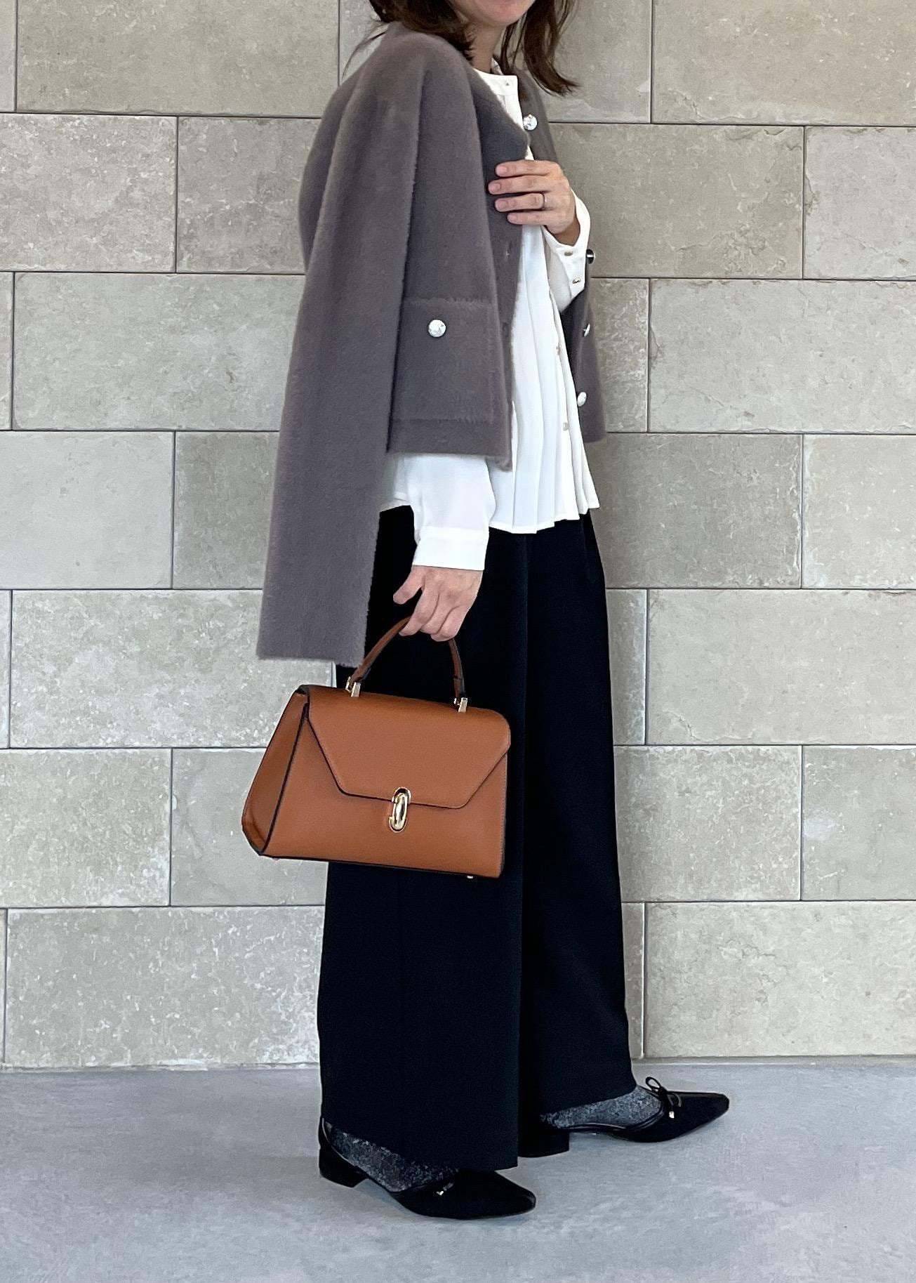 バッグはあえてブラウンを合わせて、秋らしいあたたかみをプラスしました。