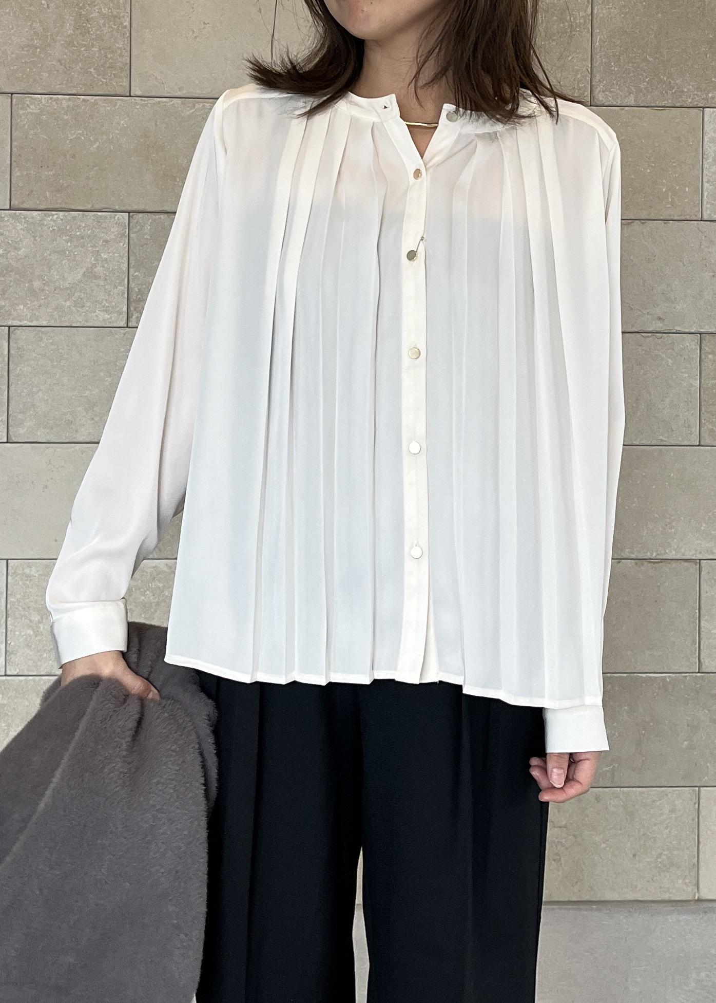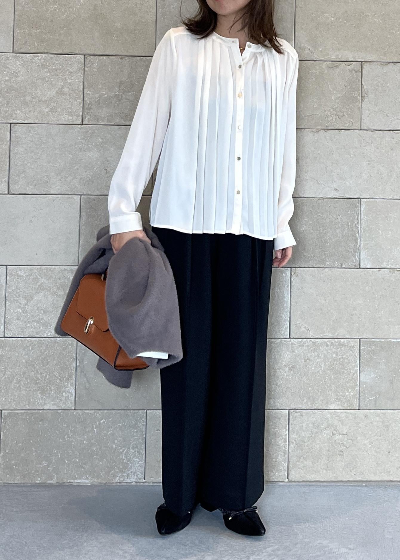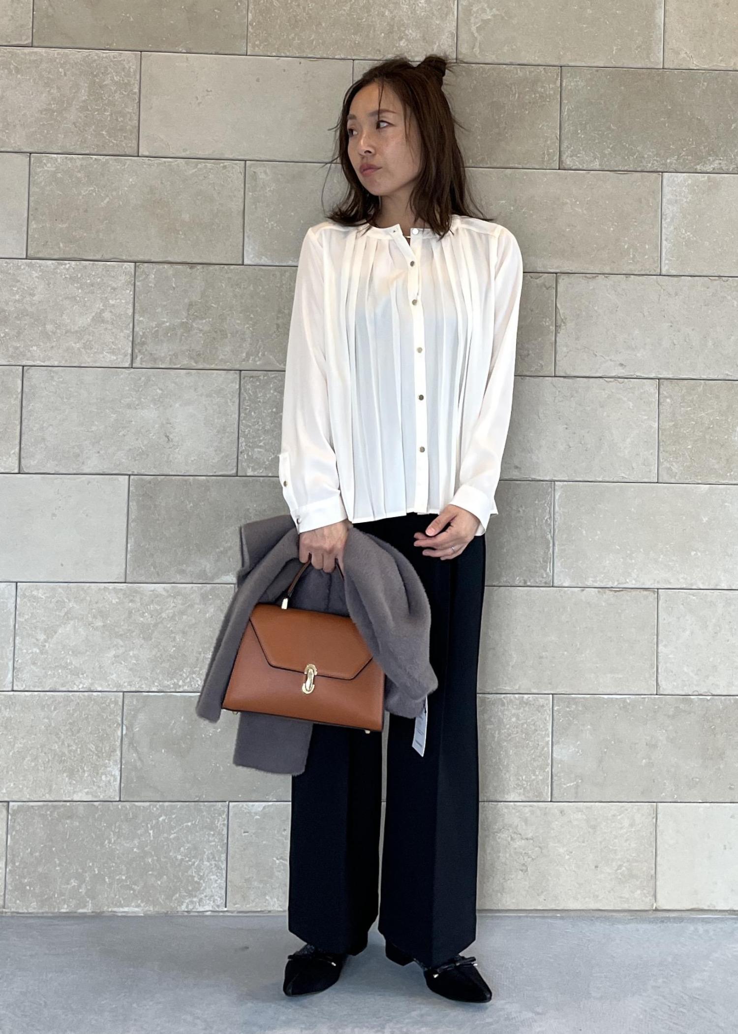 ブラウスは細かなピンタックが上品で、インせず着てもバランスが取りやすい丈感です。