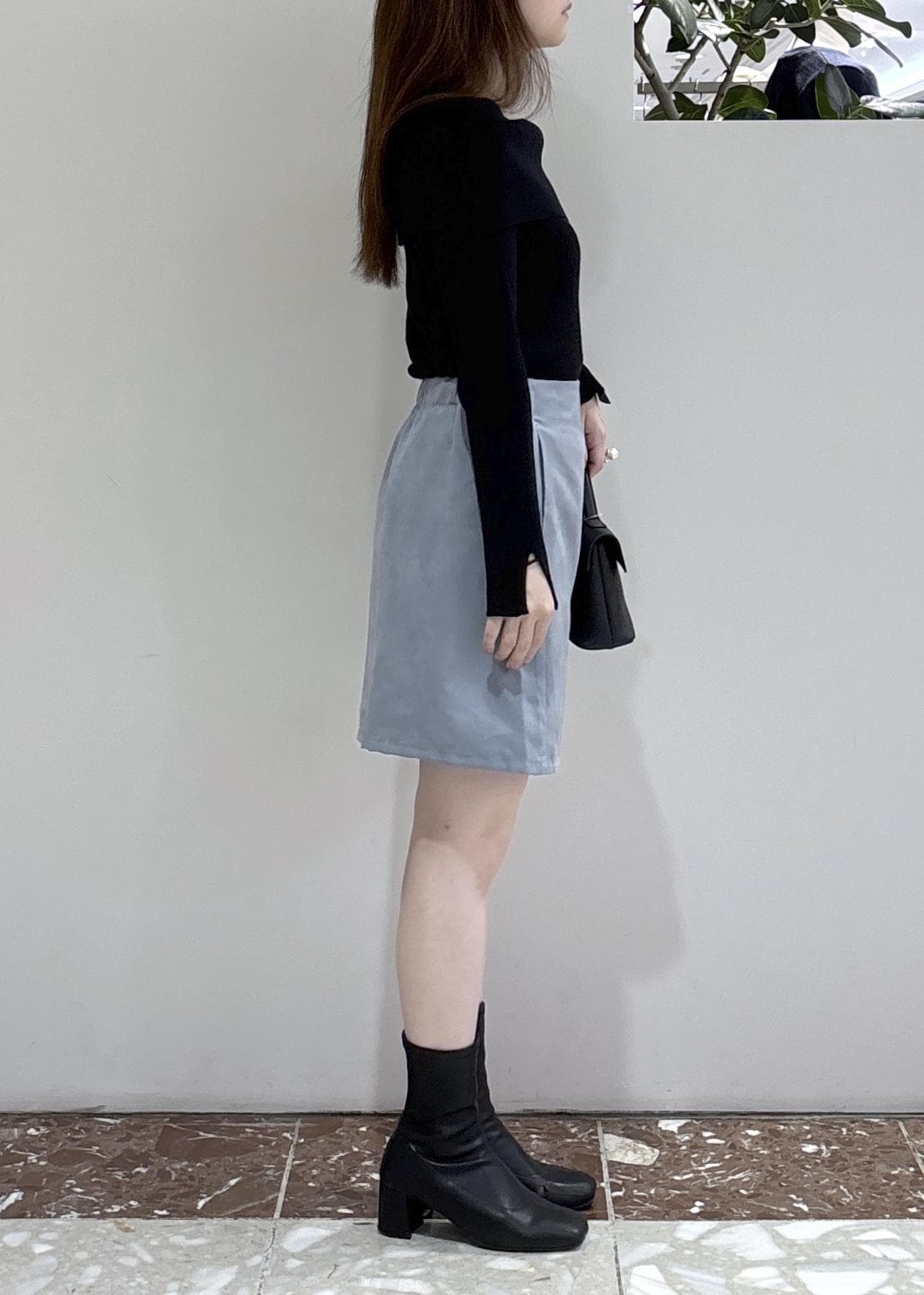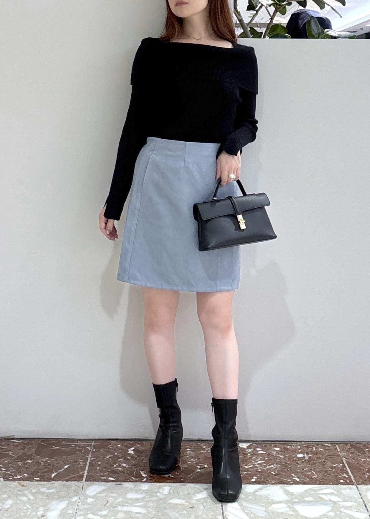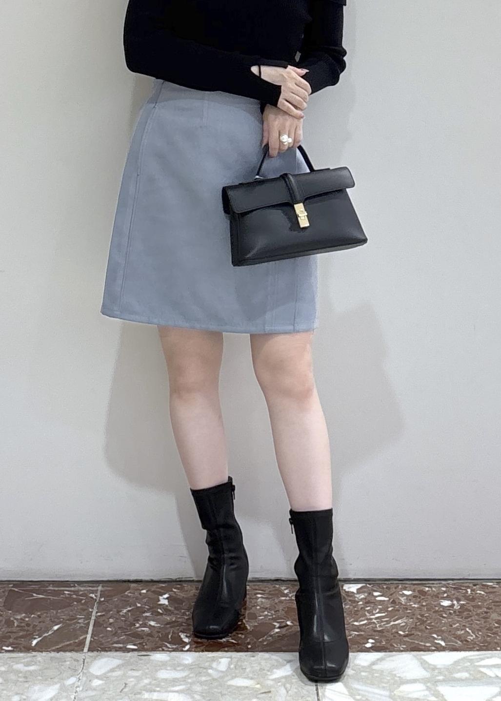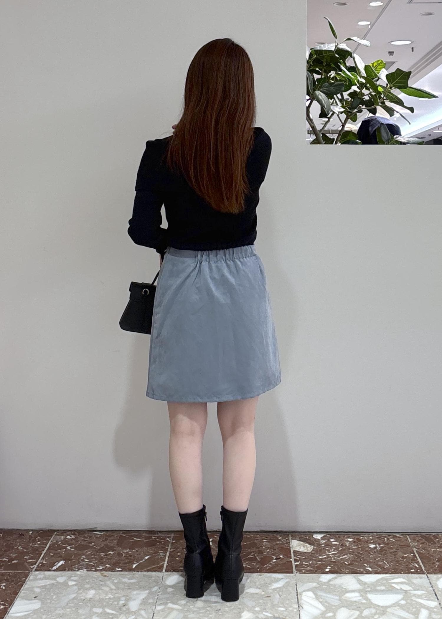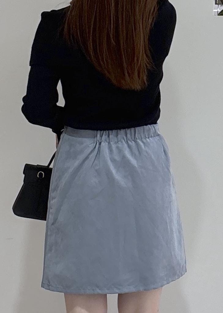 VIS釦ポイントスエードライクミニスカートブルー系 / F¥4,150レビュー158cmで太ももがちょうど隠れるくらいの丈感。ウエストのサイズは調節せずに着用していますが、その状態だと少し大きめでした。