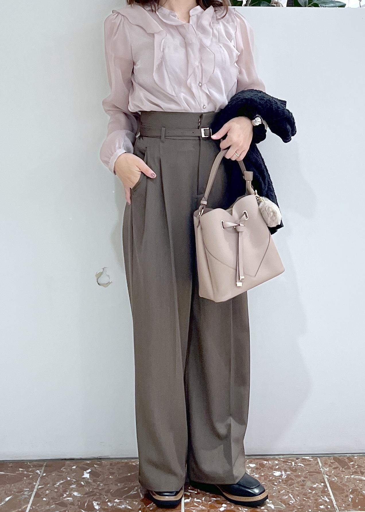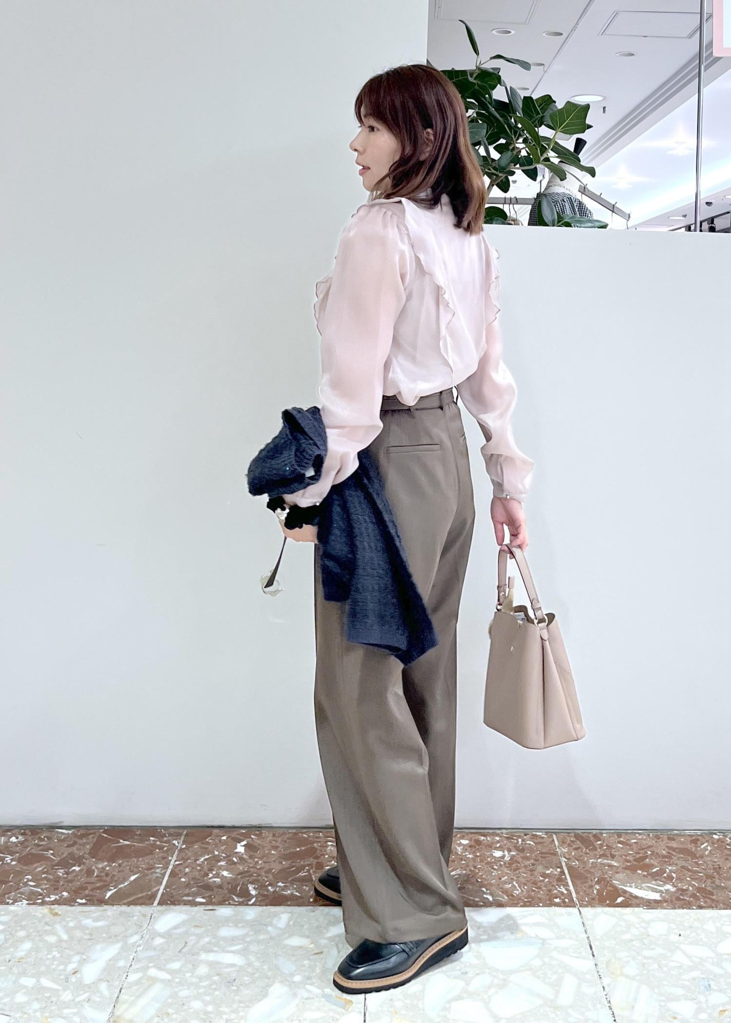 トレンドのブラウンのパンツが履きたくて、ヒラヒラのピンクブラウスを合わせて大人っぽく着こなしてみました。