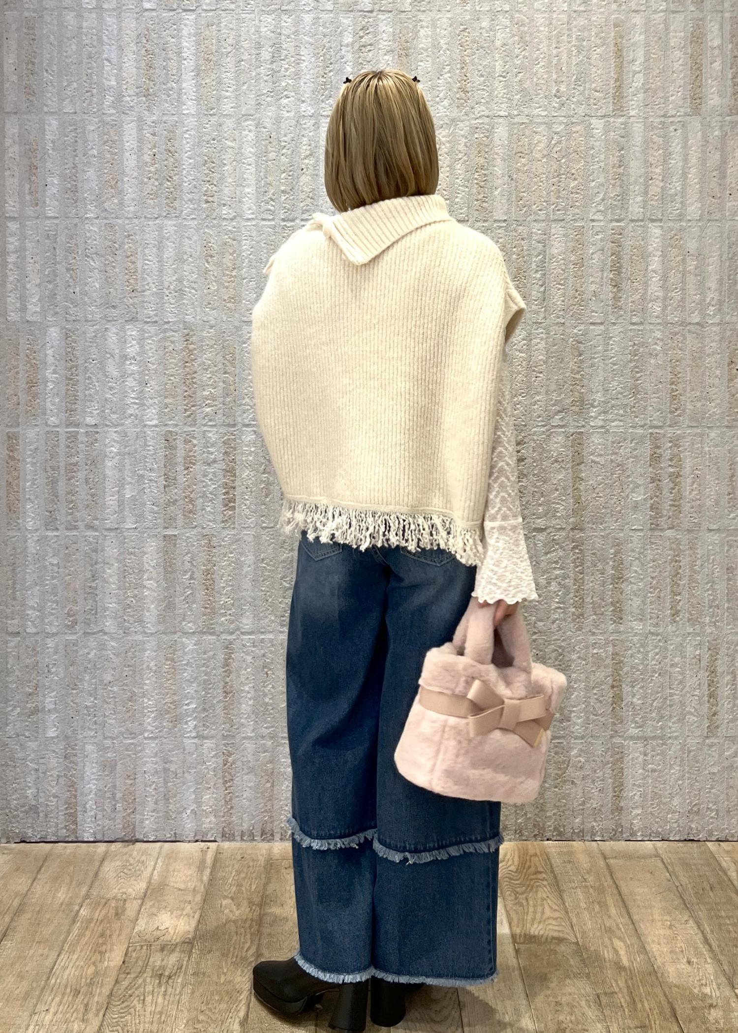 ポンチョベスト×デニムで少しウエスタン感のあるカジュアルコーデです!レースのインナーやファーバッグを合わせて、