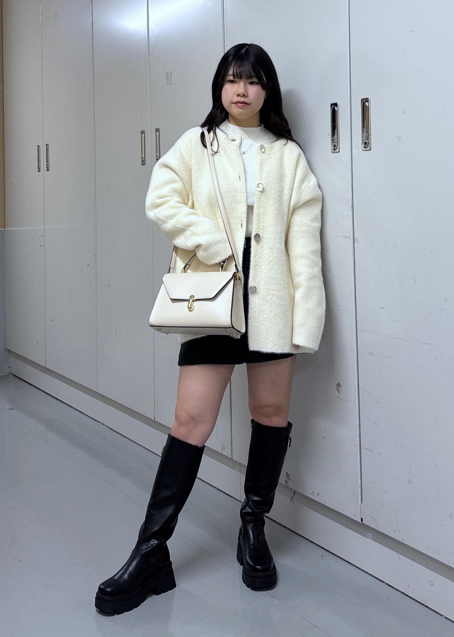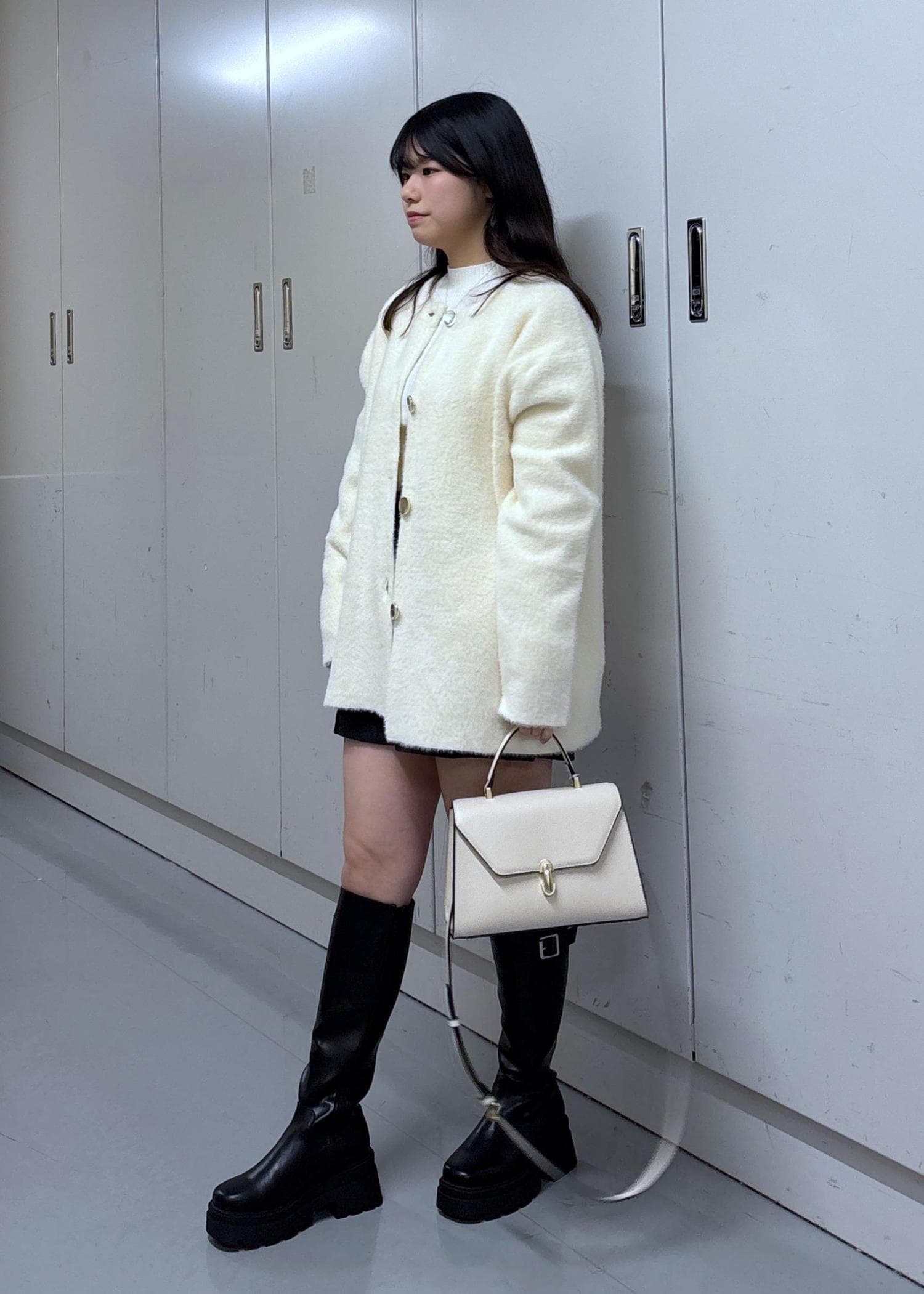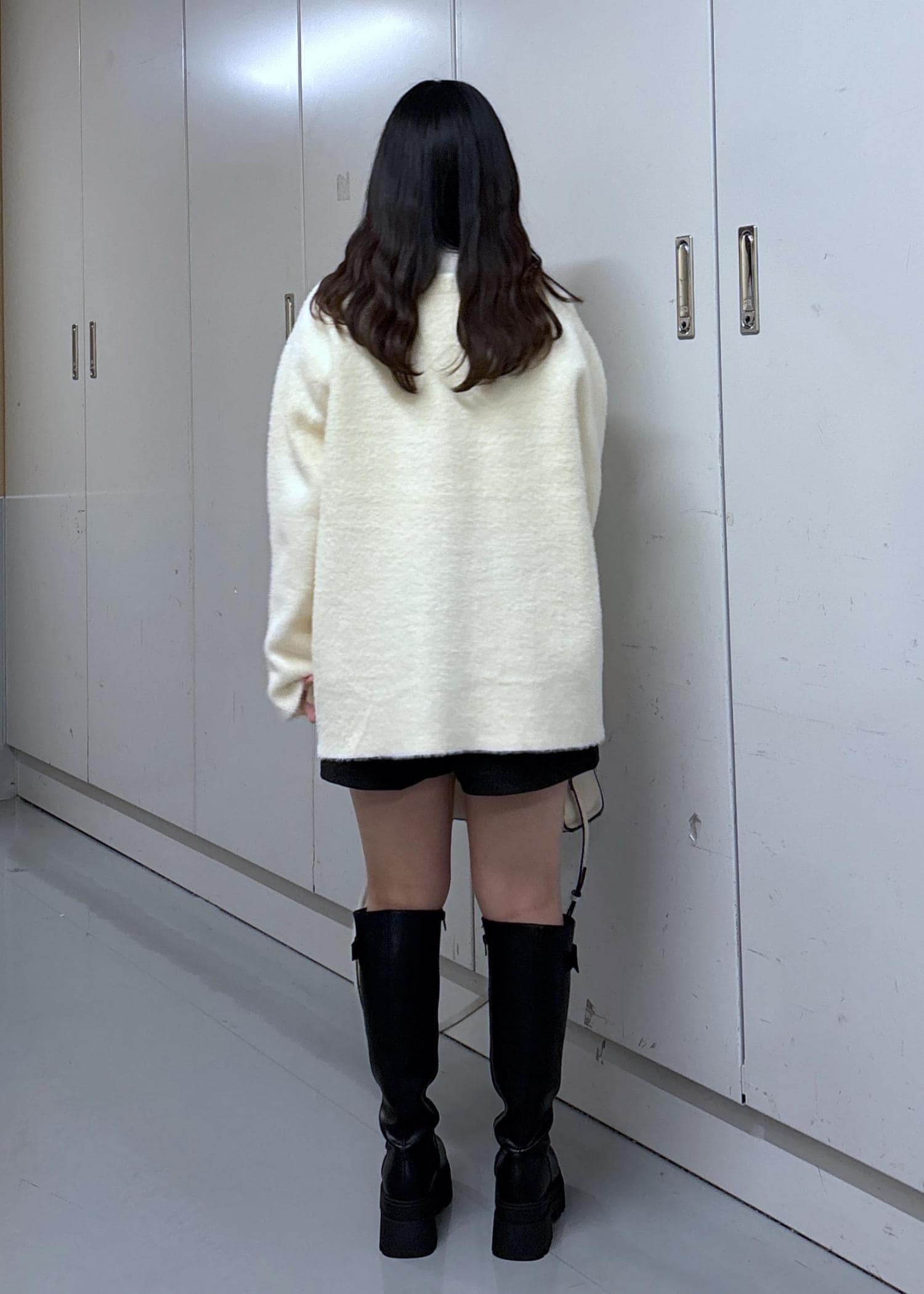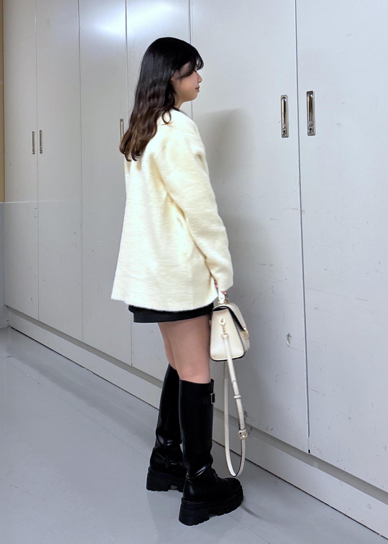 VIS接結メタルボタンミニフェザーニットコートオフホワイト / F¥9,999レビュー153cmで、丈はお尻が隠れる長さです。
