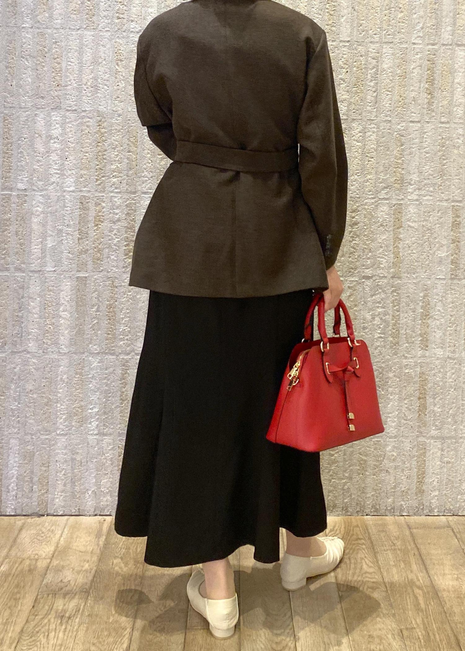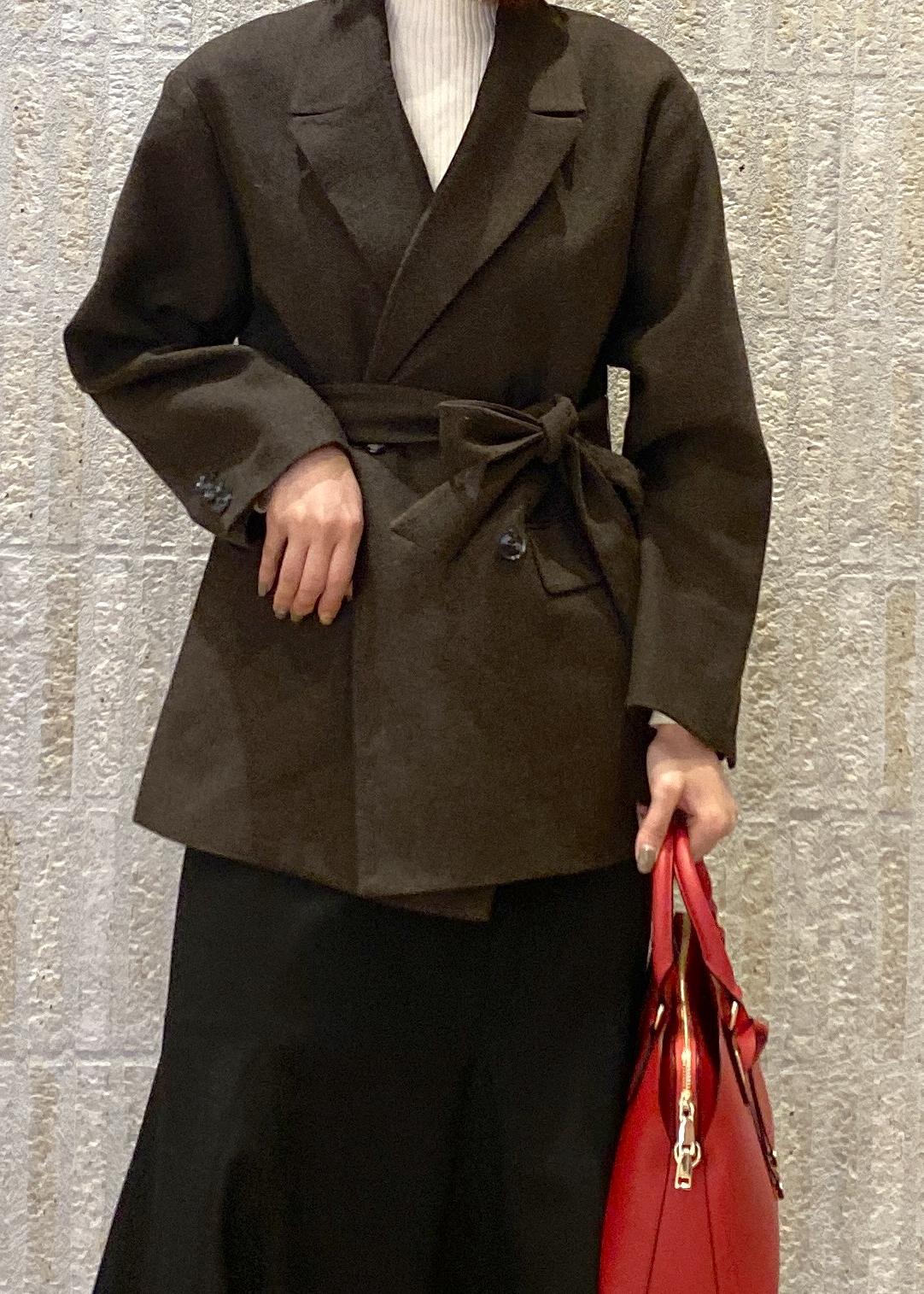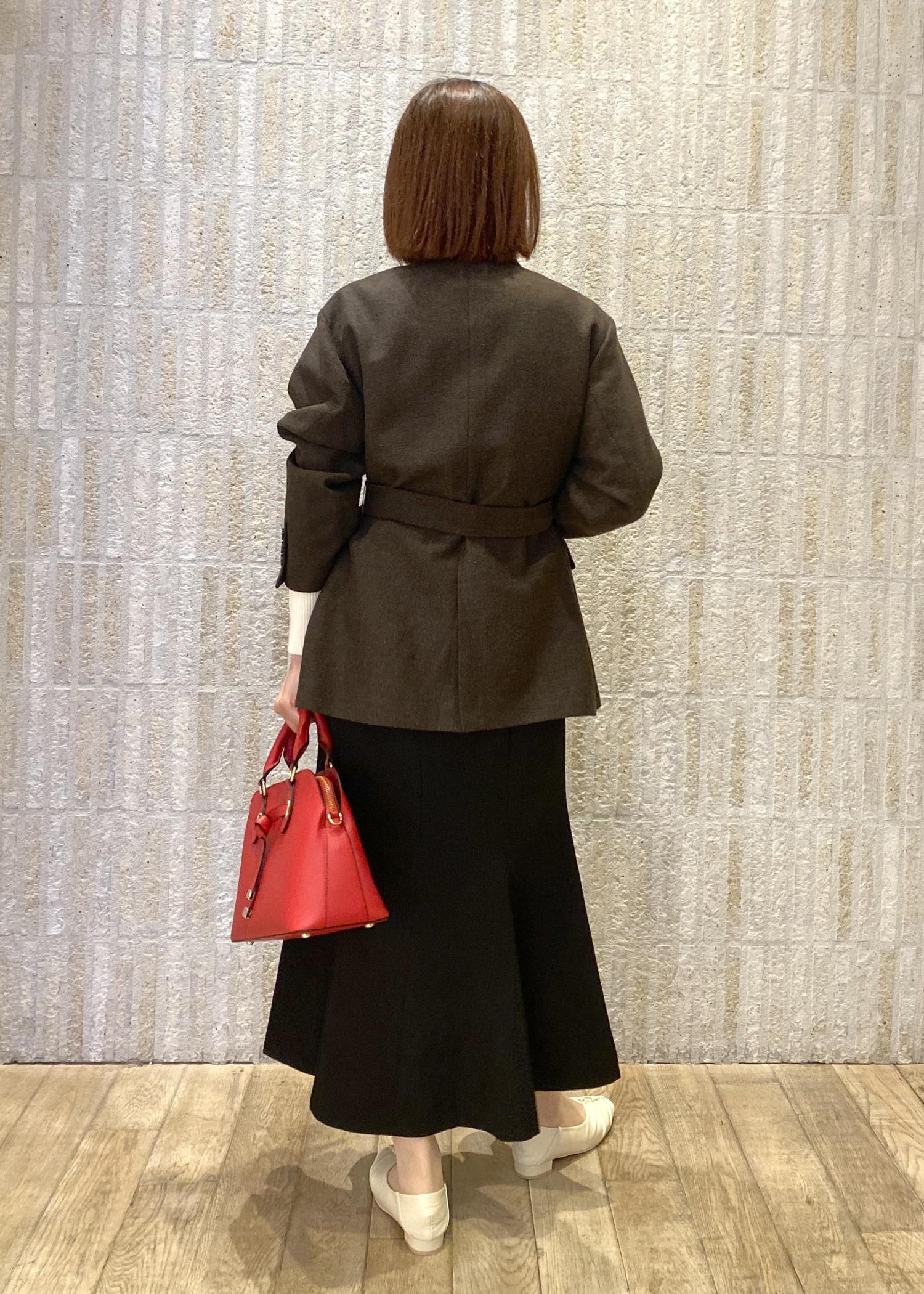 ジャケットに付いたベルトでウエストマークをし、シルエットにメリハリもつけています!