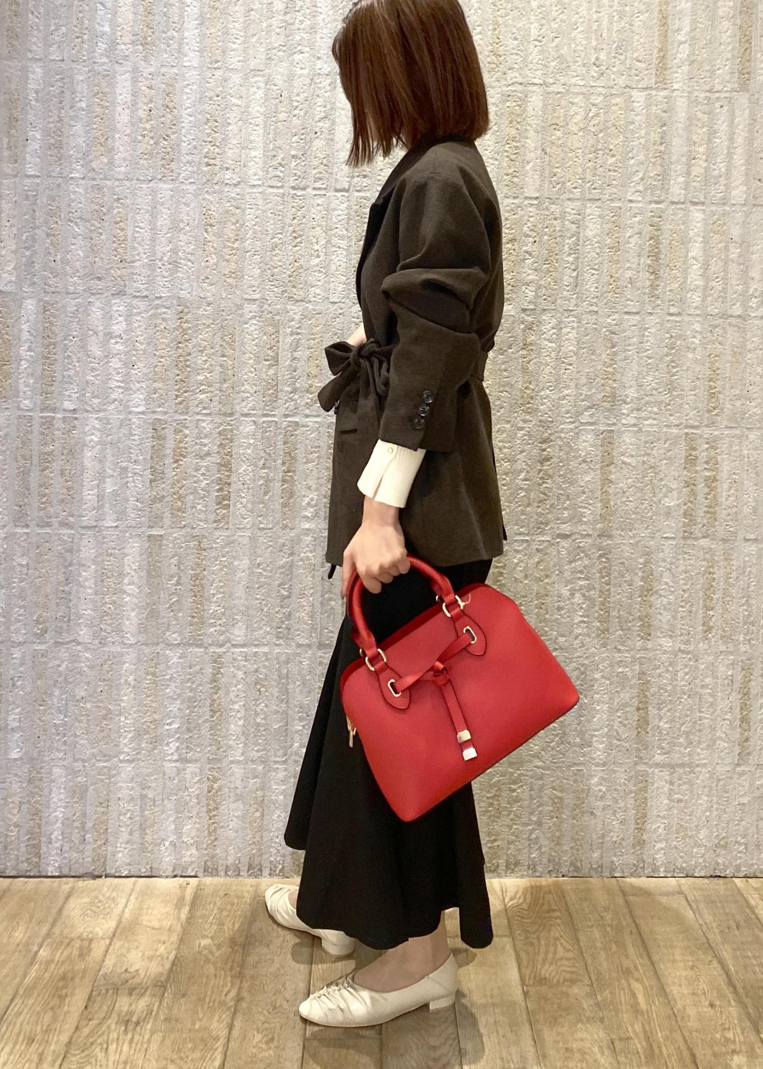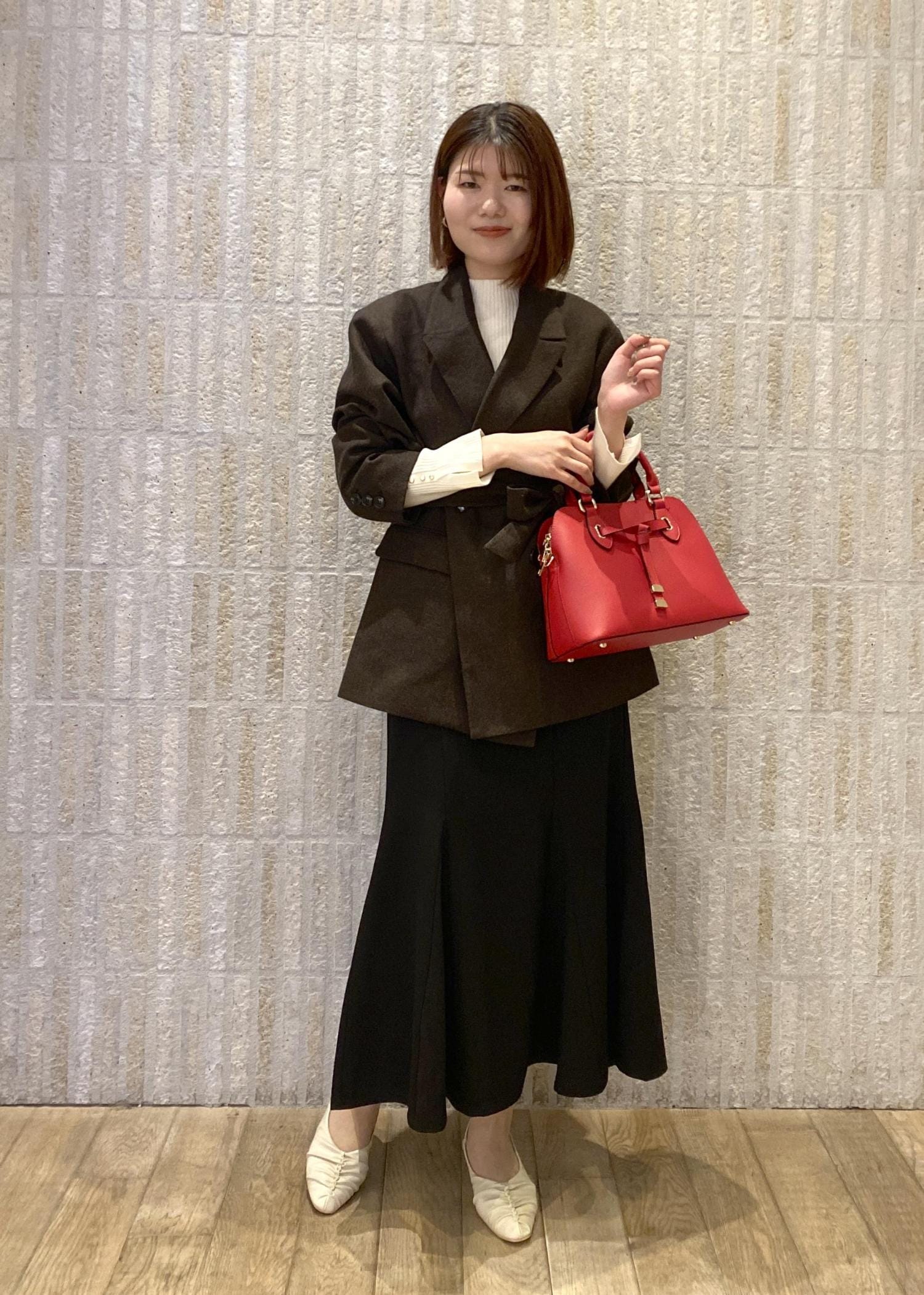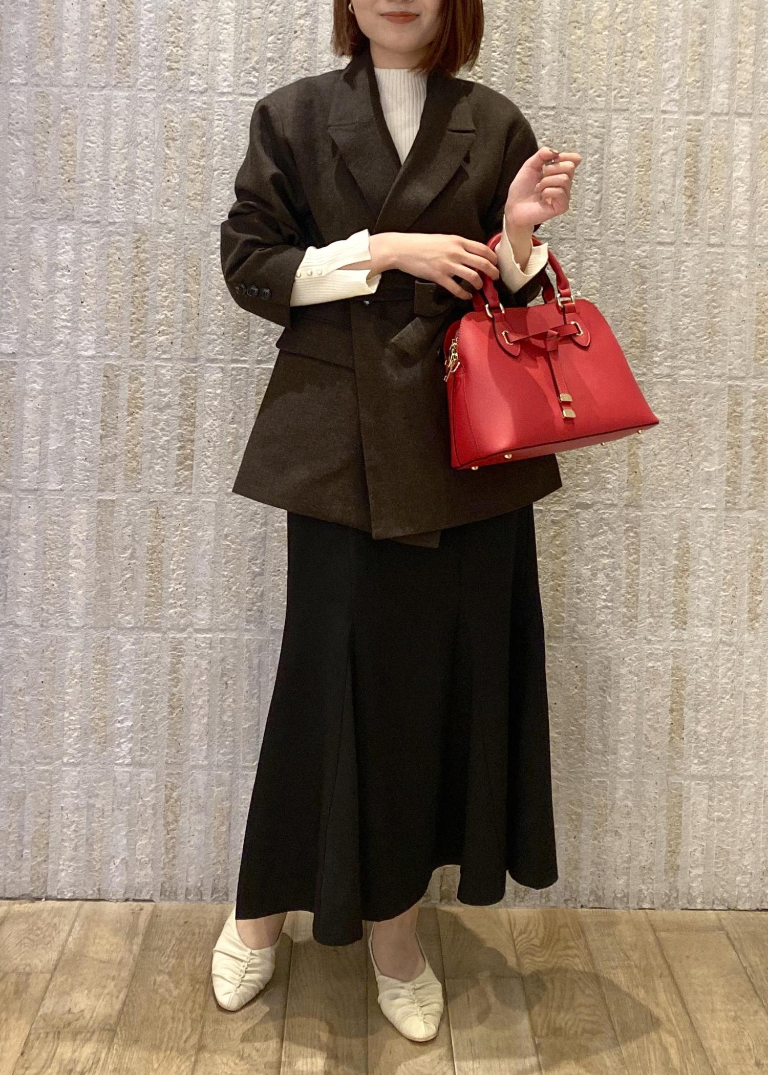 ジャケットに付いたベルトでウエストマークをし、シルエットにメリハリもつけています!
