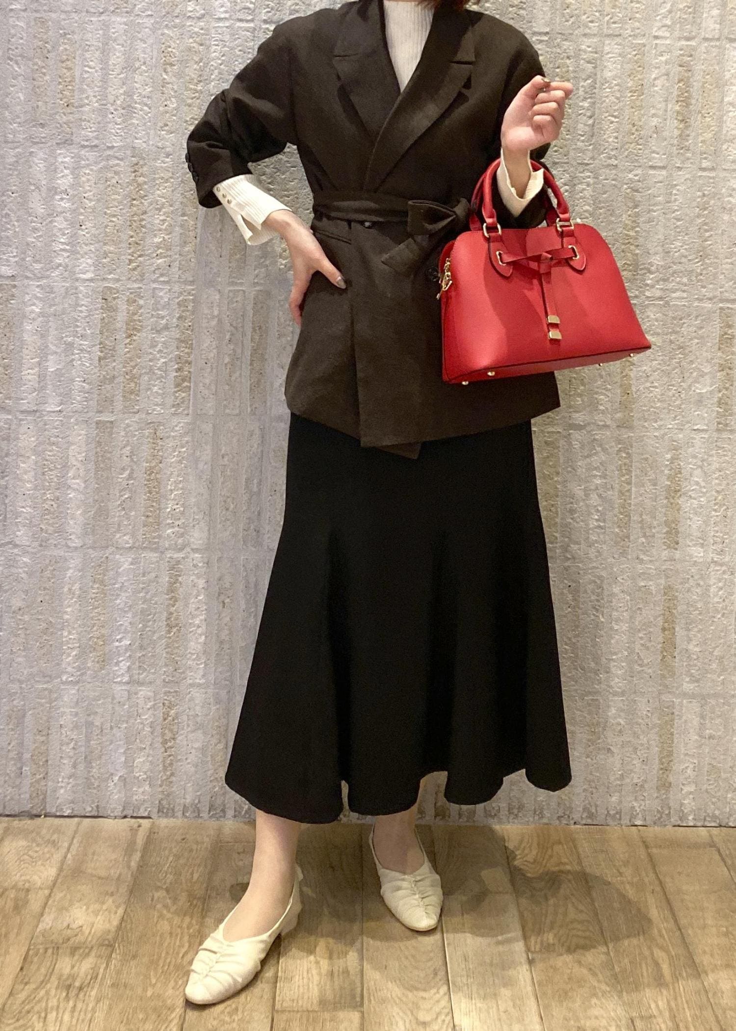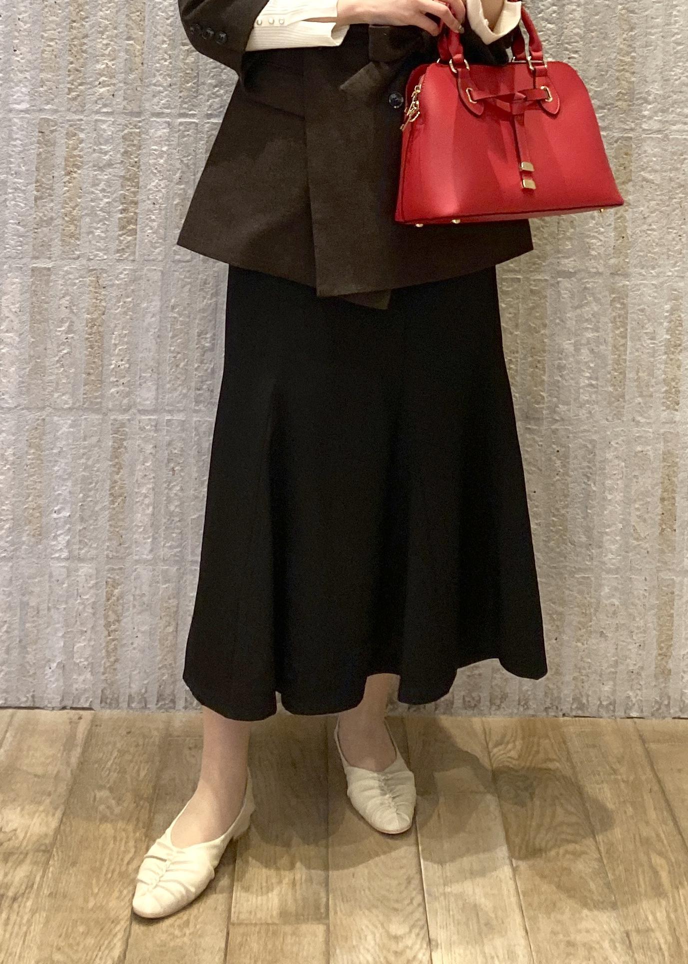 甘くなりすぎないよう、マーメイドスカートにジャケットを合わせ上品な印象にしてみました。