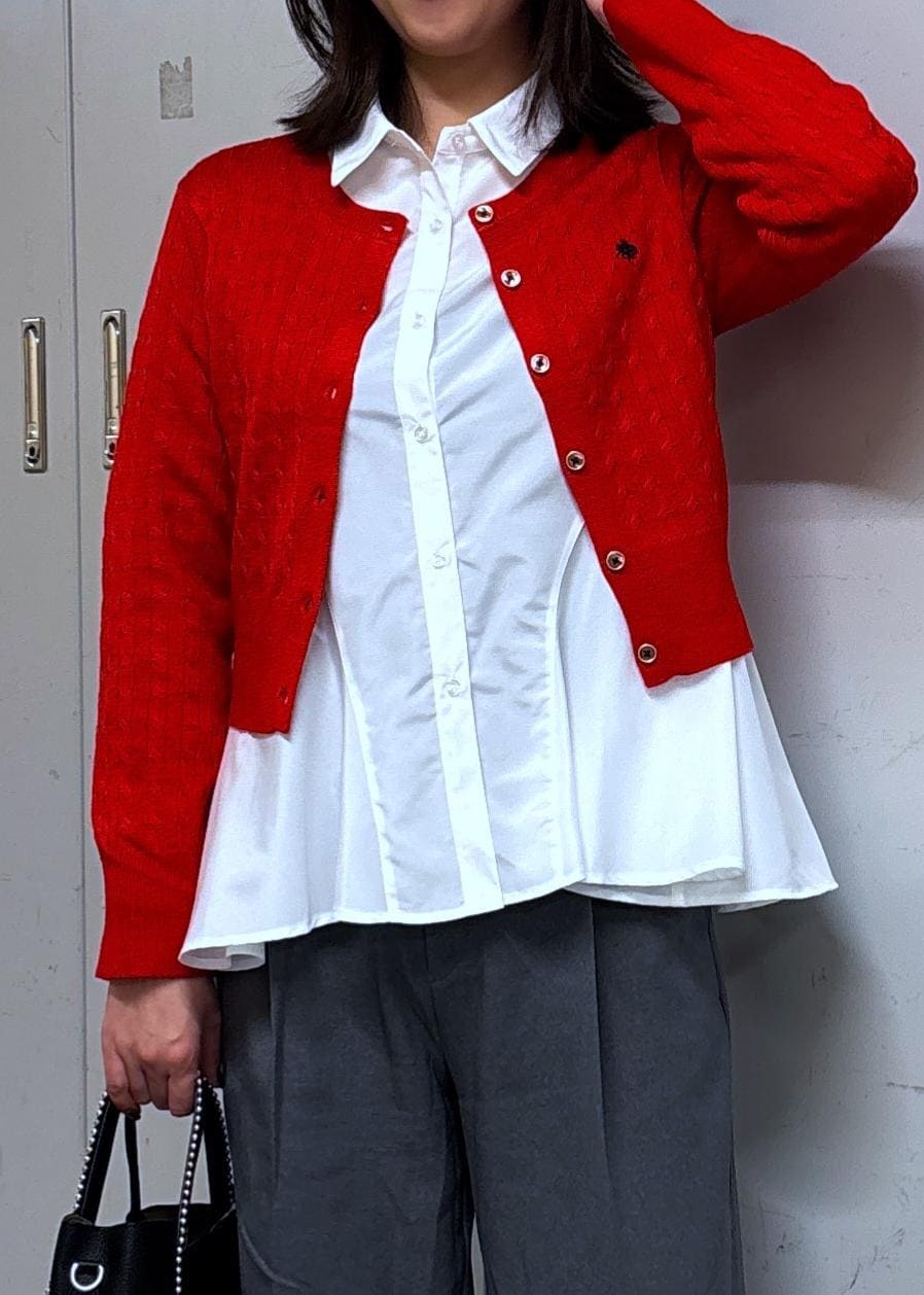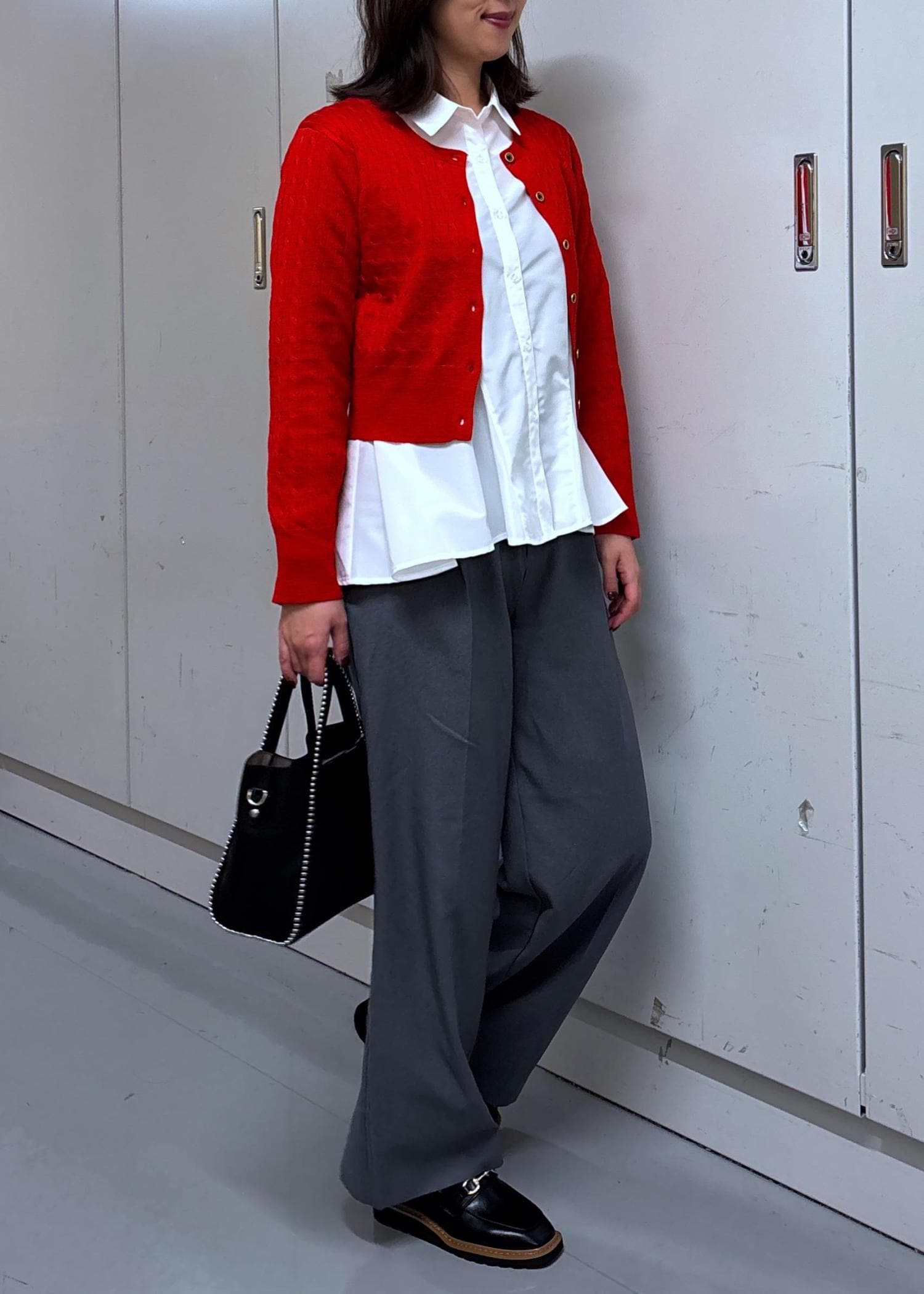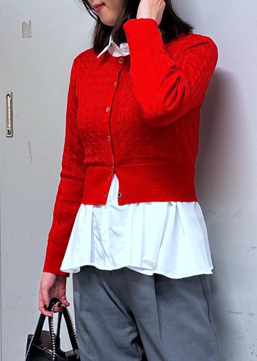 VIS【POLO BCS】VIS別注ミニケーブルノーカラーニットカーディガンレッド / F¥6,930レビュー丈がヘソくらいまでしかないので、チュニック丈以上のインナー必須です。袖は長く手首しっかり隠れます。
