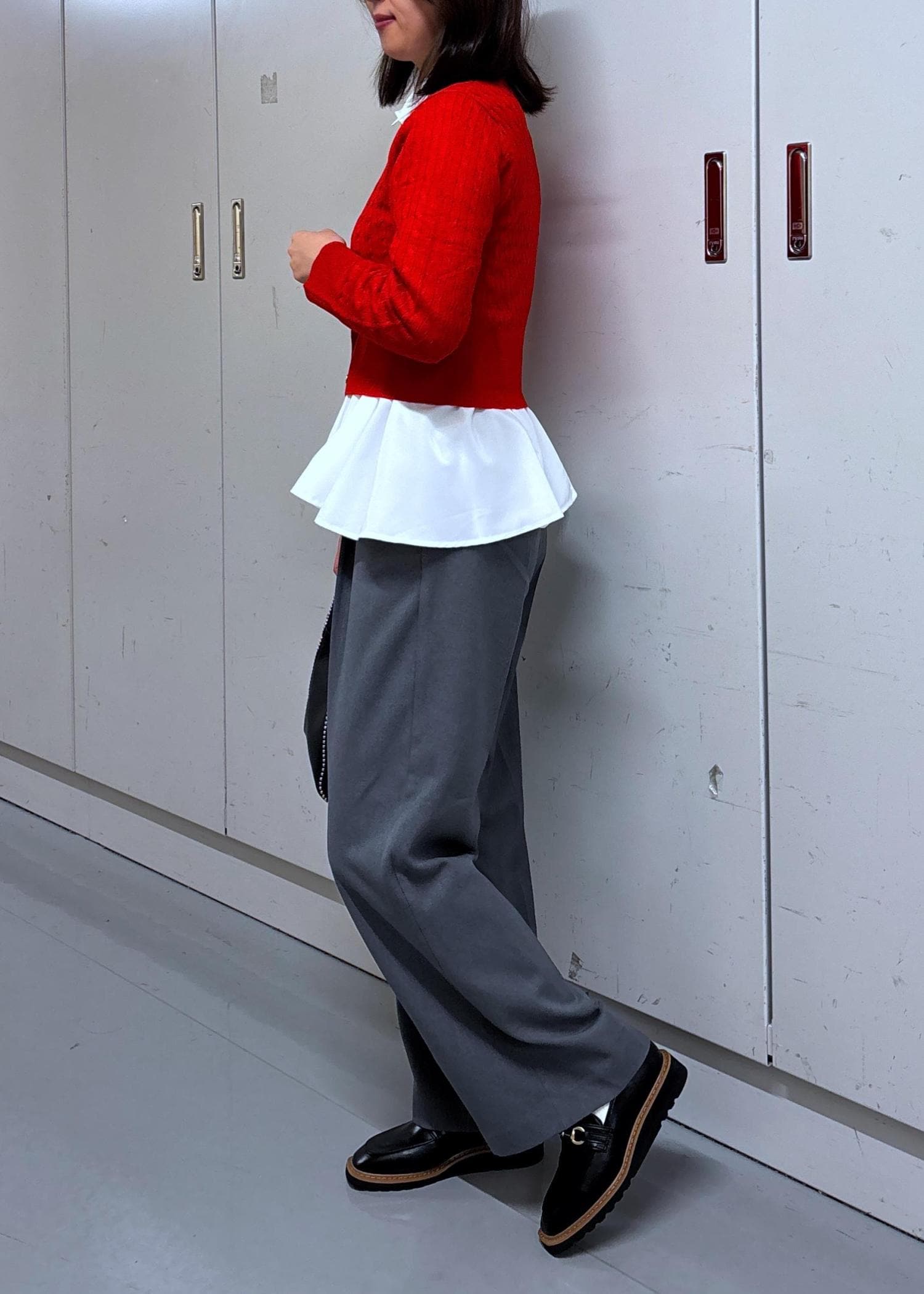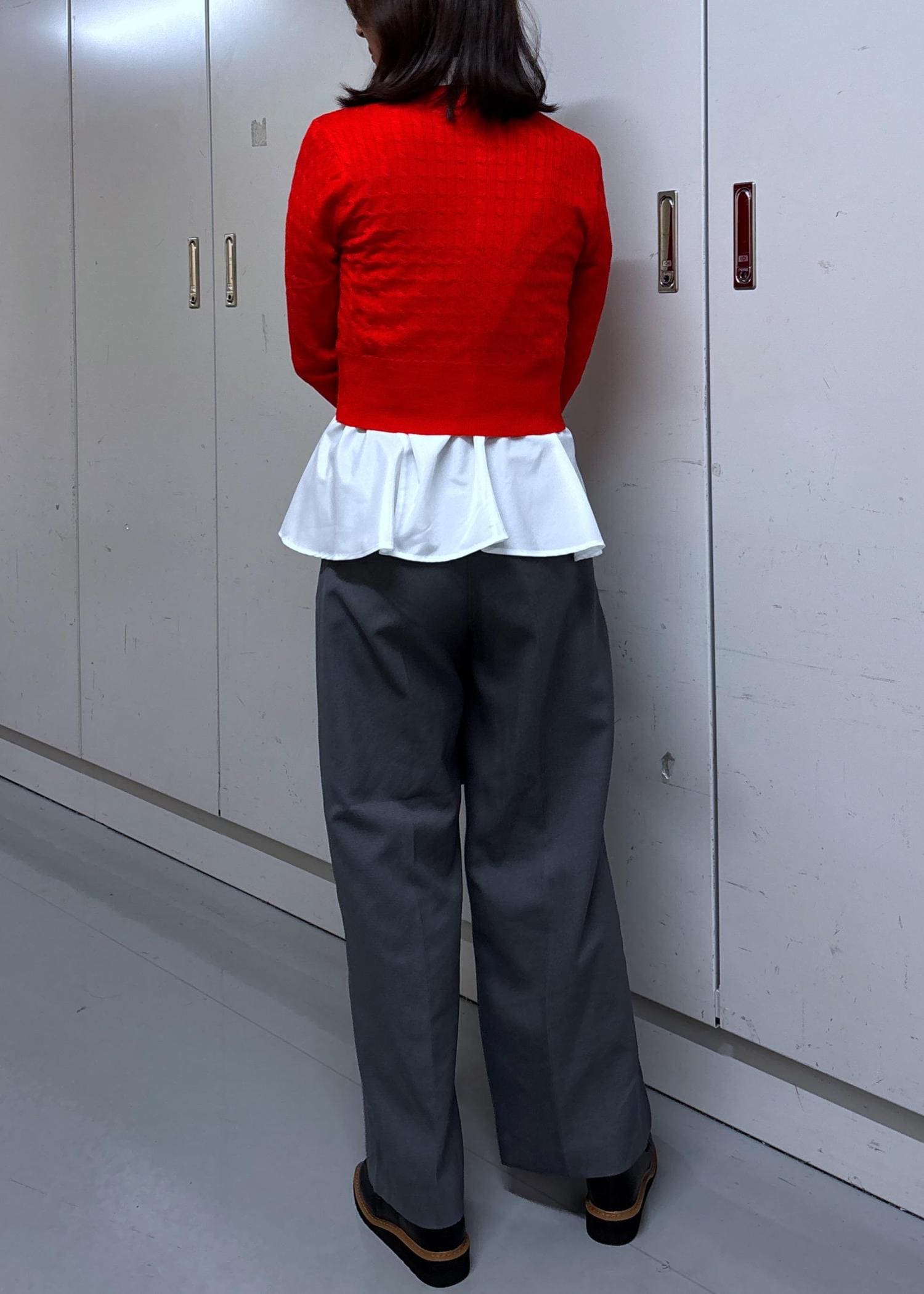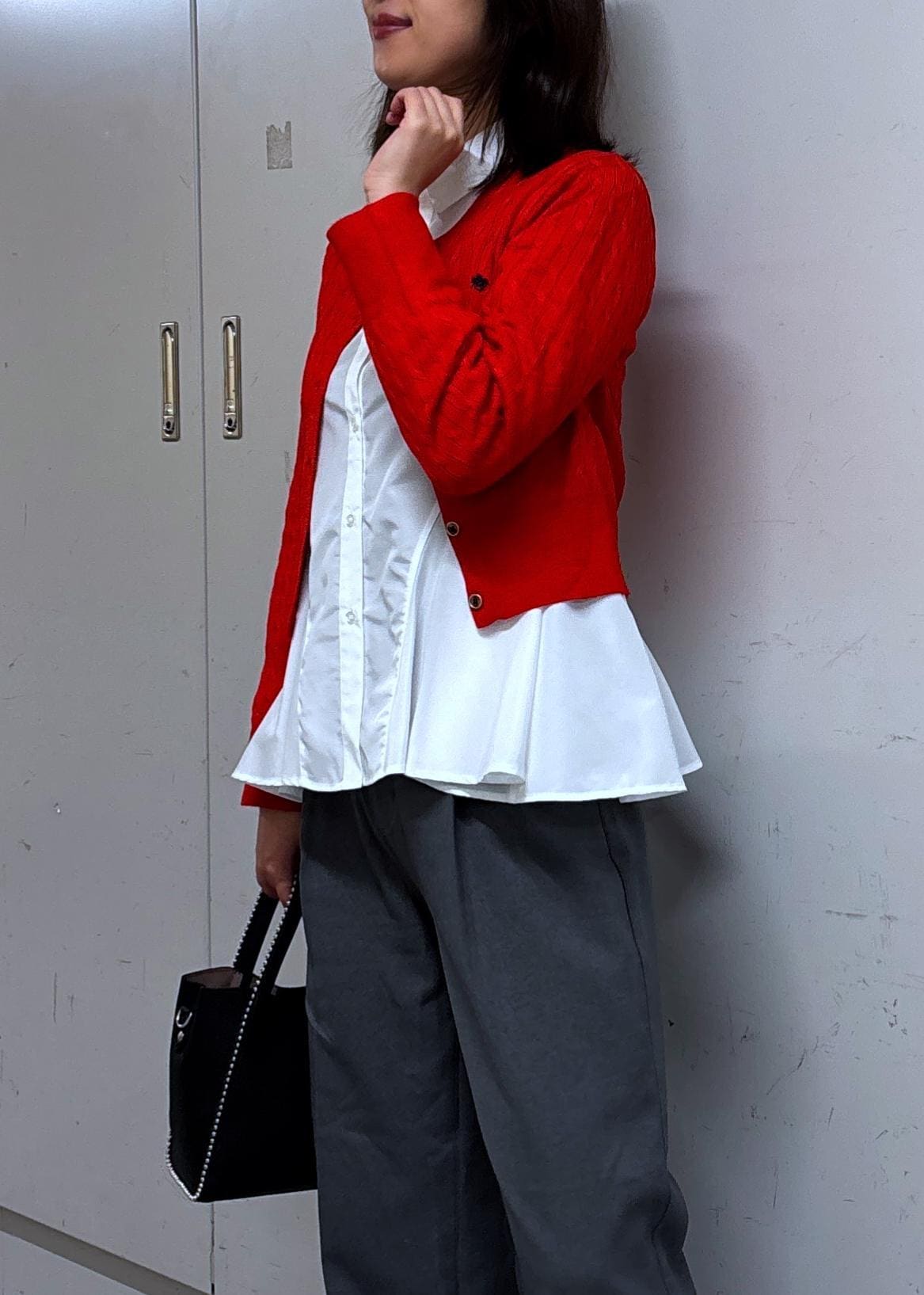 VIS【POLO BCS】VIS別注ミニケーブルノーカラーニットカーディガンレッド / F¥6,930レビュー丈がヘソくらいまでしかないので、チュニック丈以上のインナー必須です。袖は長く手首しっかり隠れます。