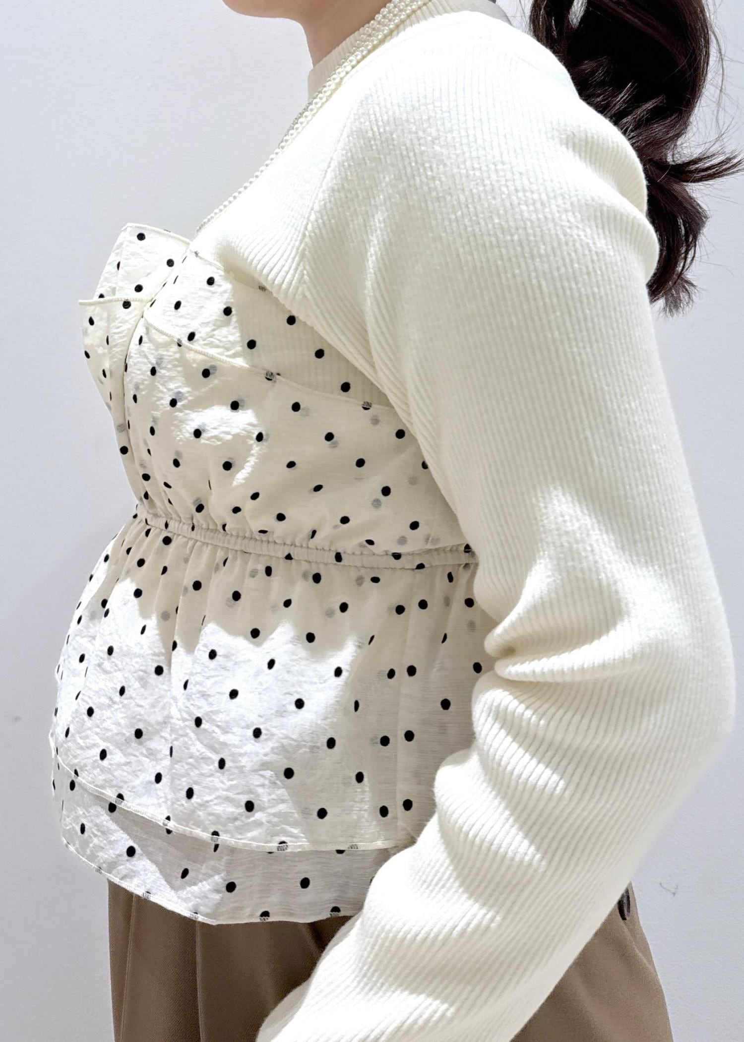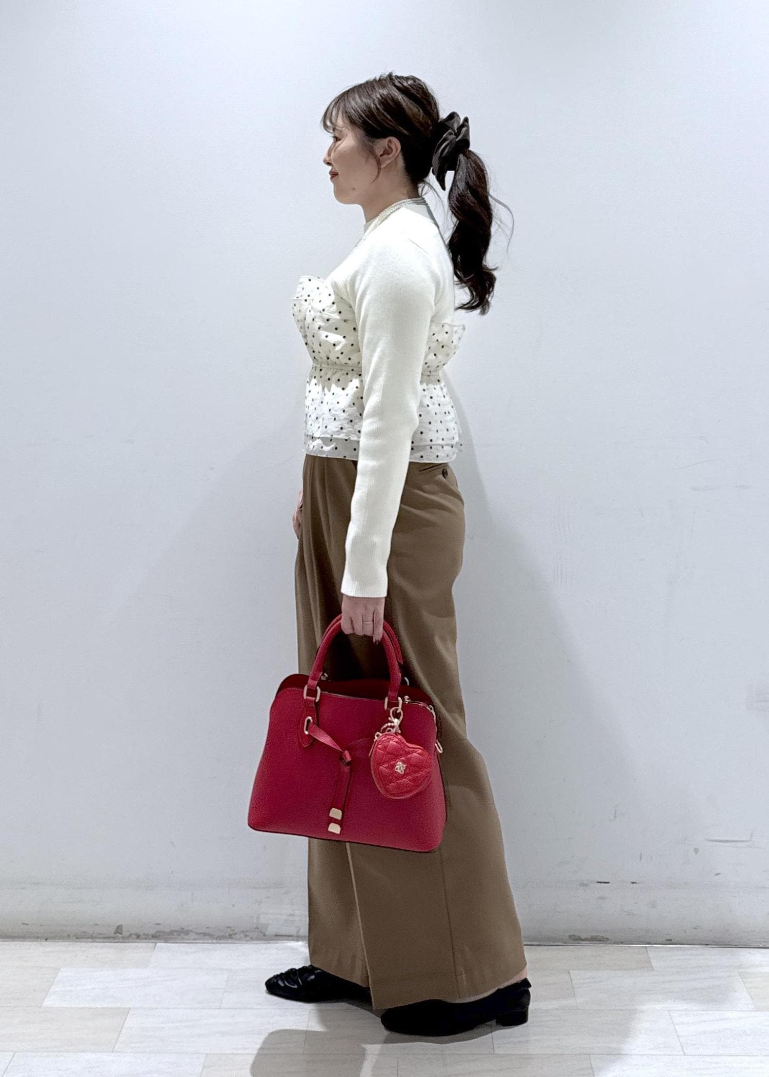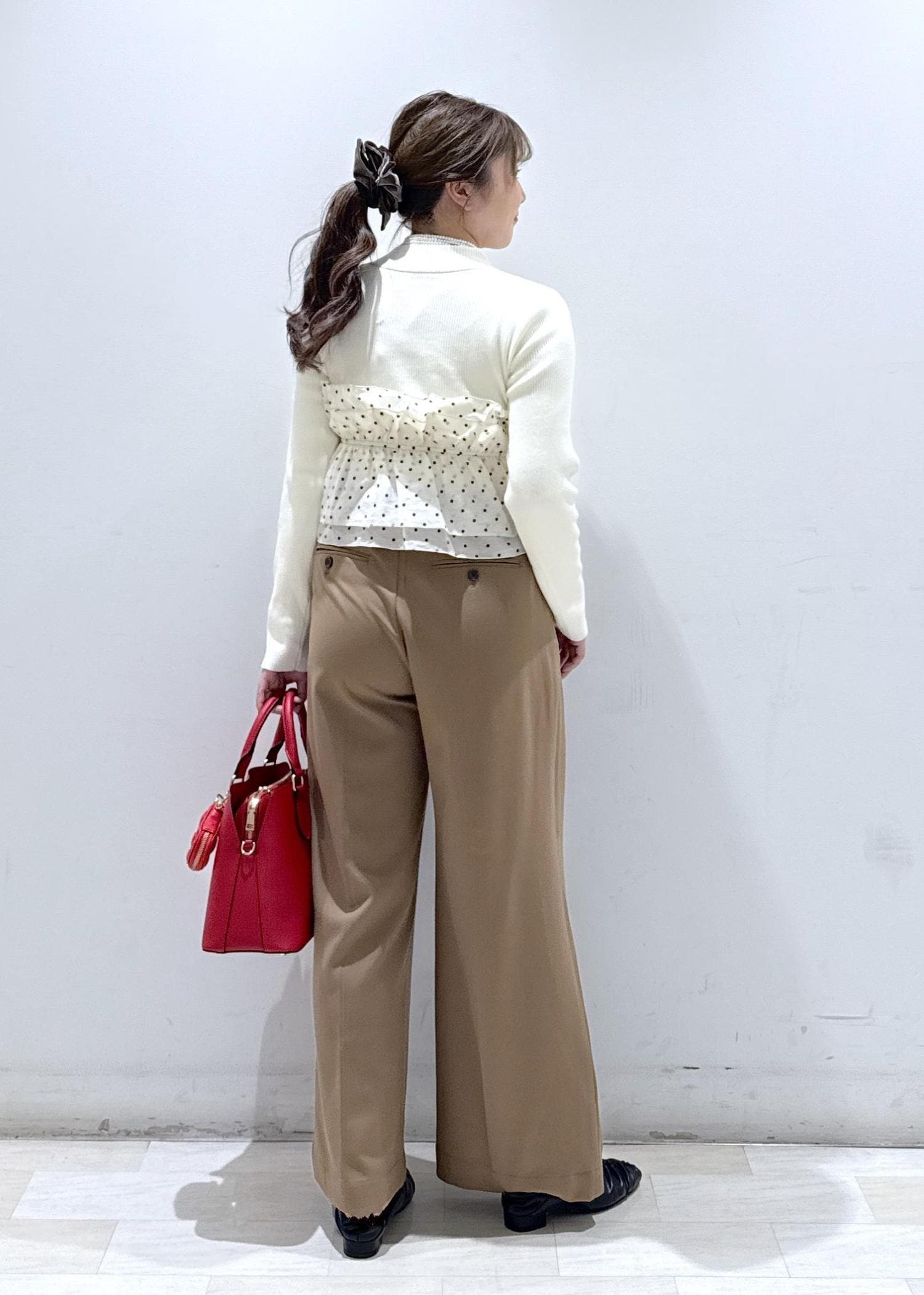 今回は新作で入荷しました可愛いドット柄のビスチェドッキングニットとワイドパンツと合わせて、オンとオフどちらでも使える綺麗めなコーディネートにしてみました♪