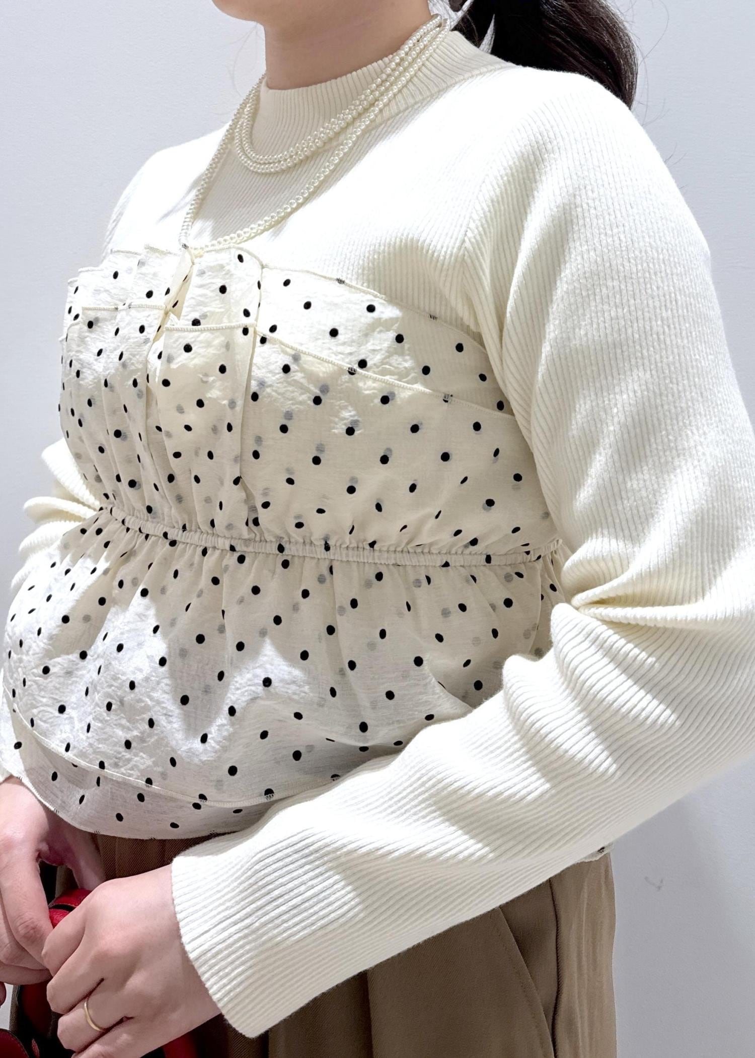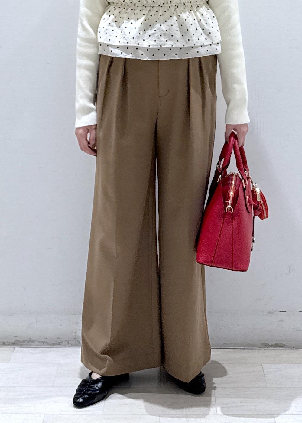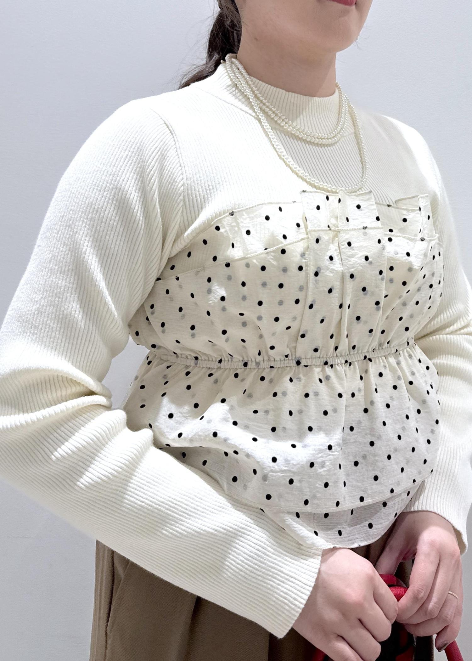 今回は新作で入荷しました可愛いドット柄のビスチェドッキングニットとワイドパンツと合わせて、オンとオフどちらでも使える綺麗めなコーディネートにしてみました♪