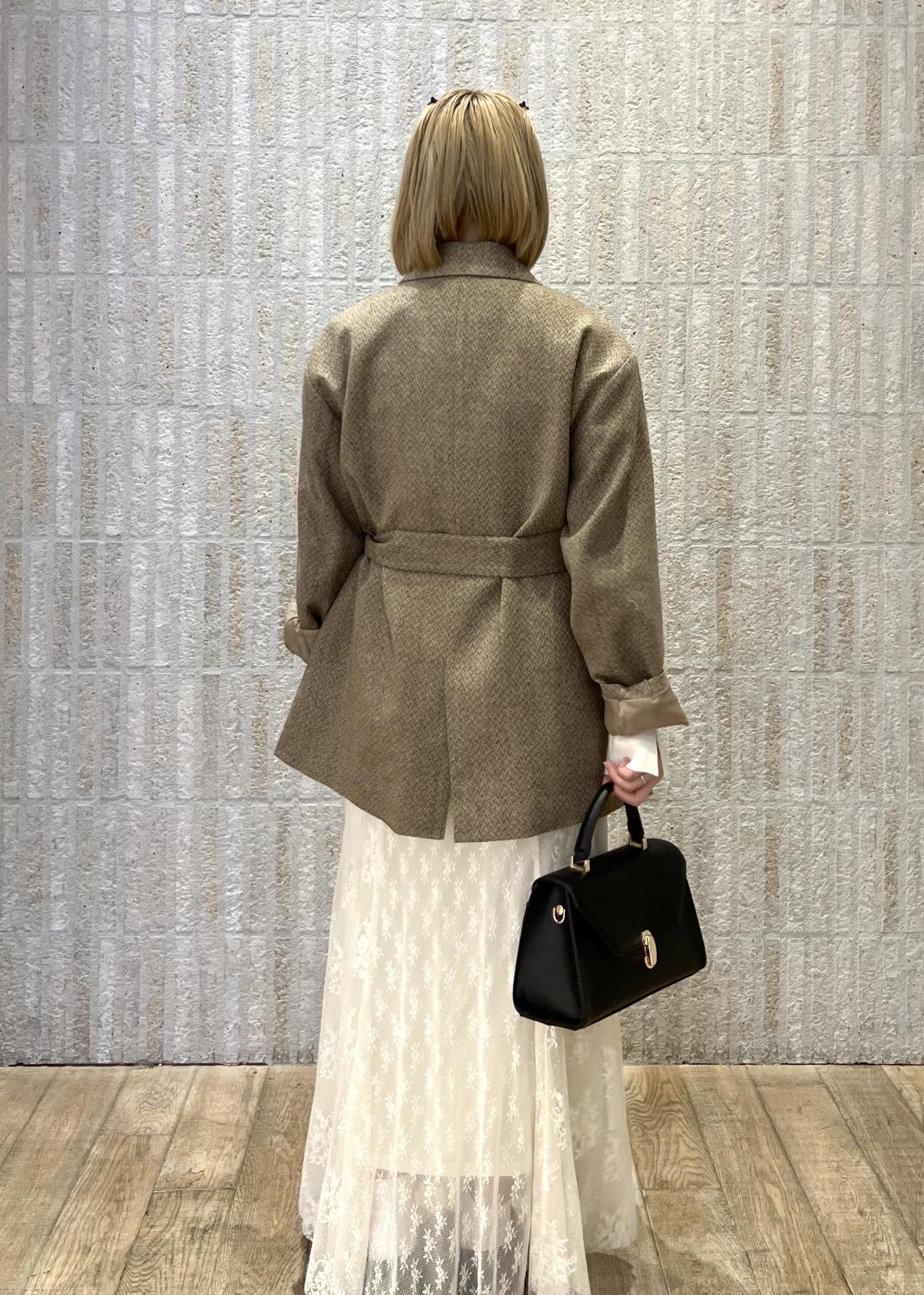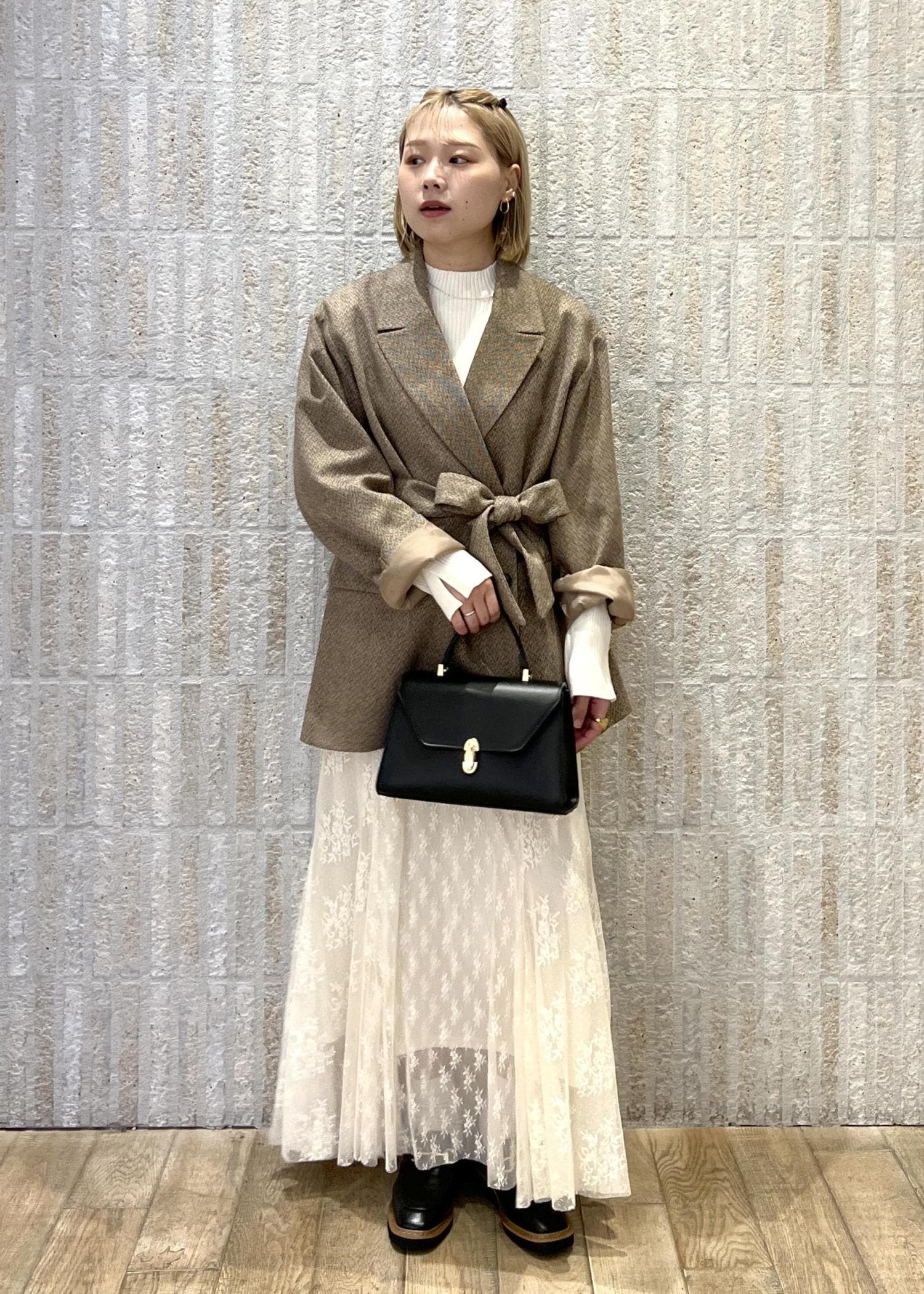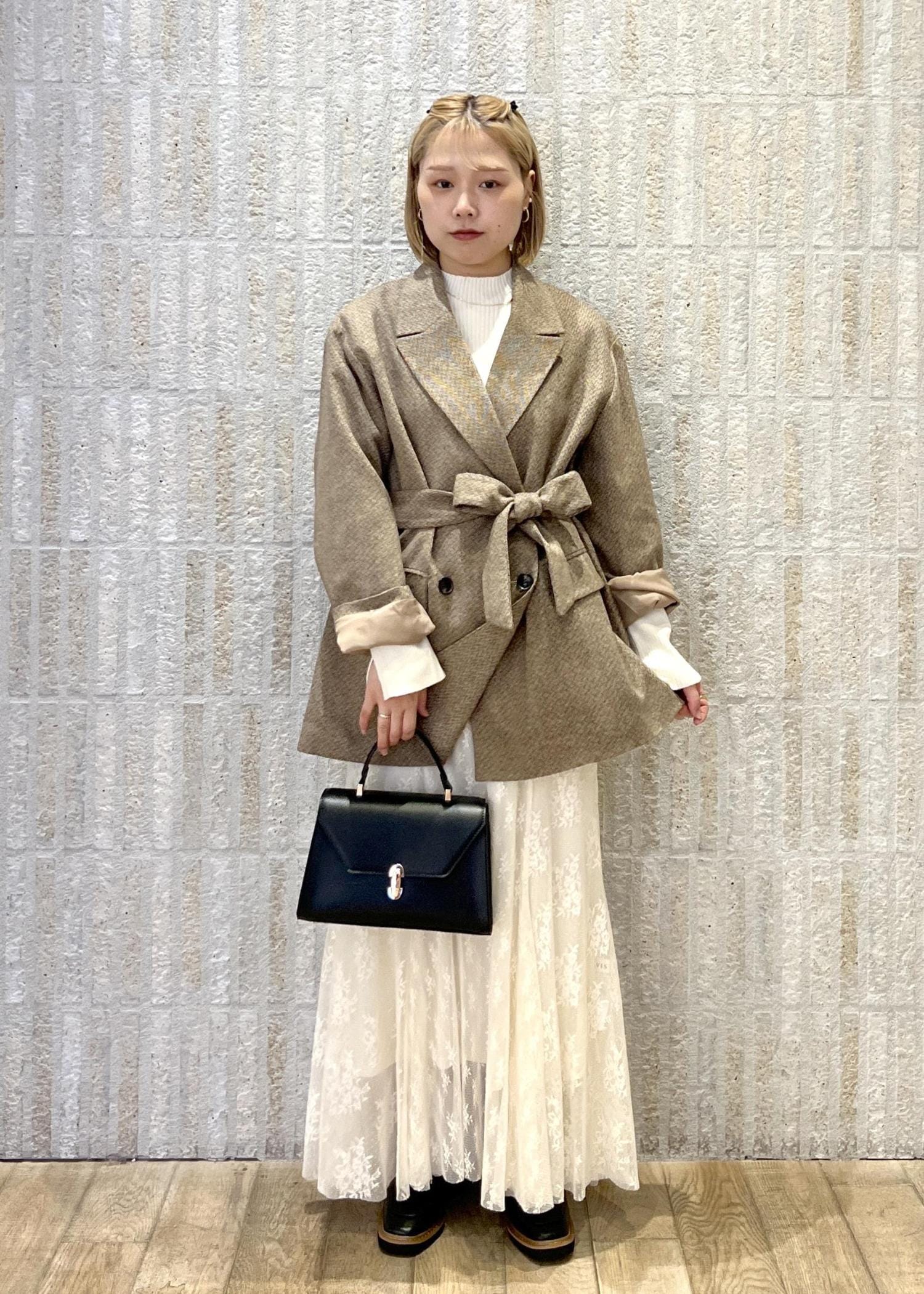 肩幅も大きく見えると思います!それを活かして、ベルトで留めて強弱をつけることで、フェミニン感をプラスさせました。