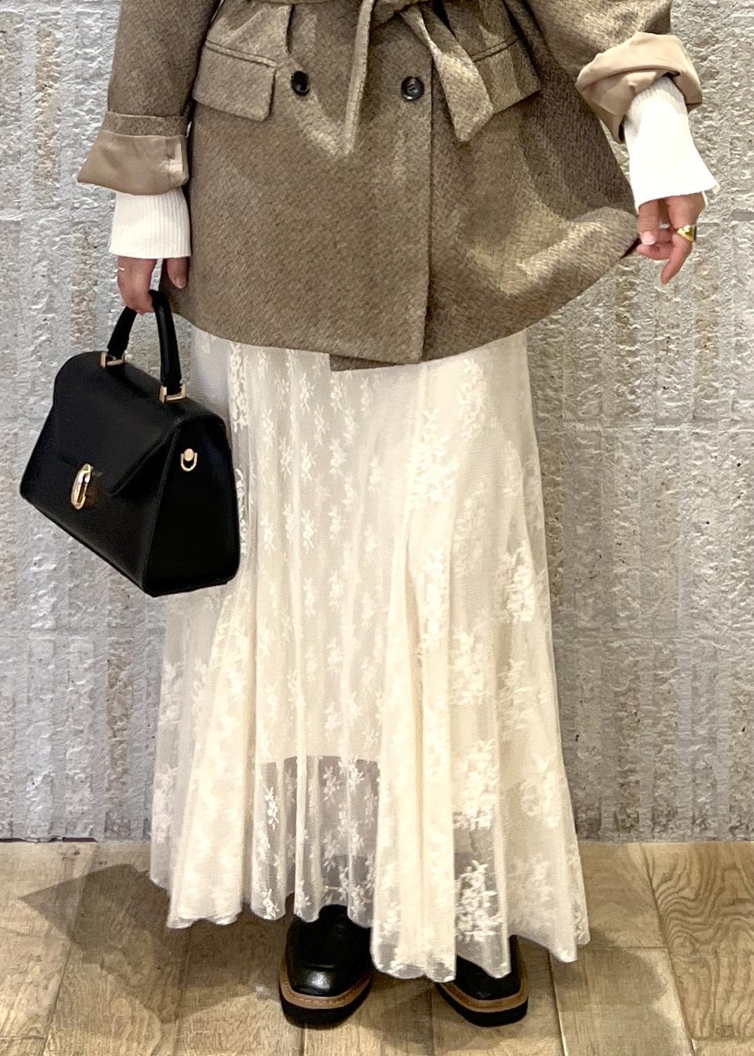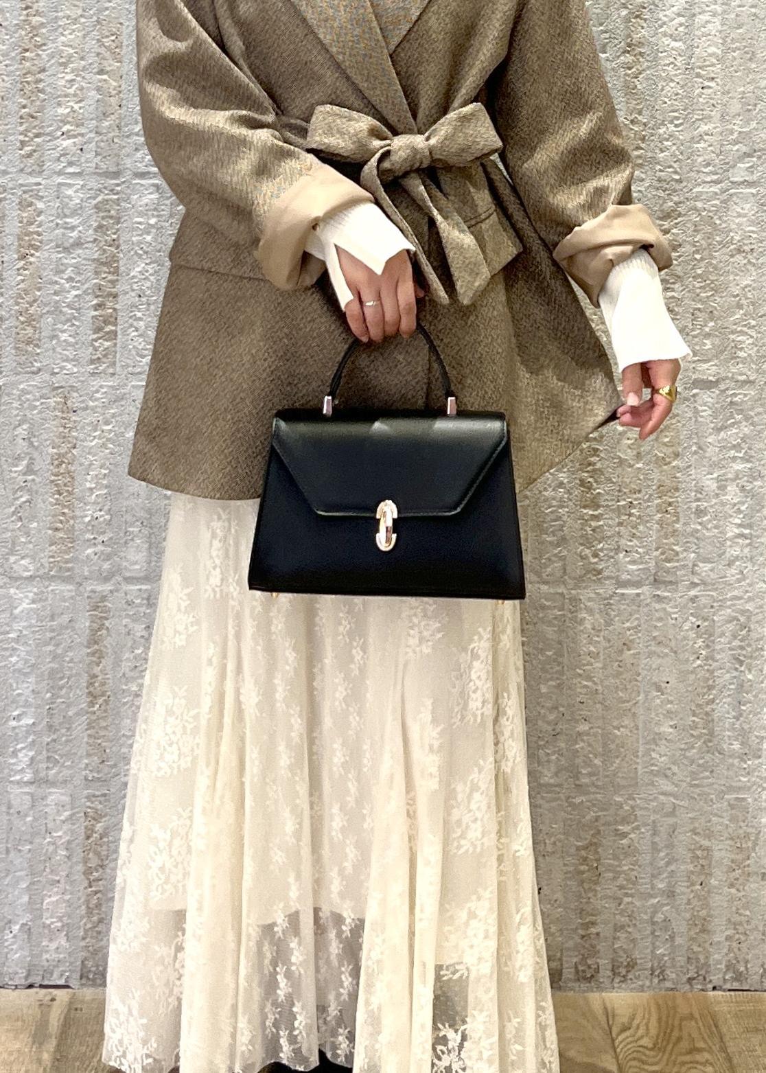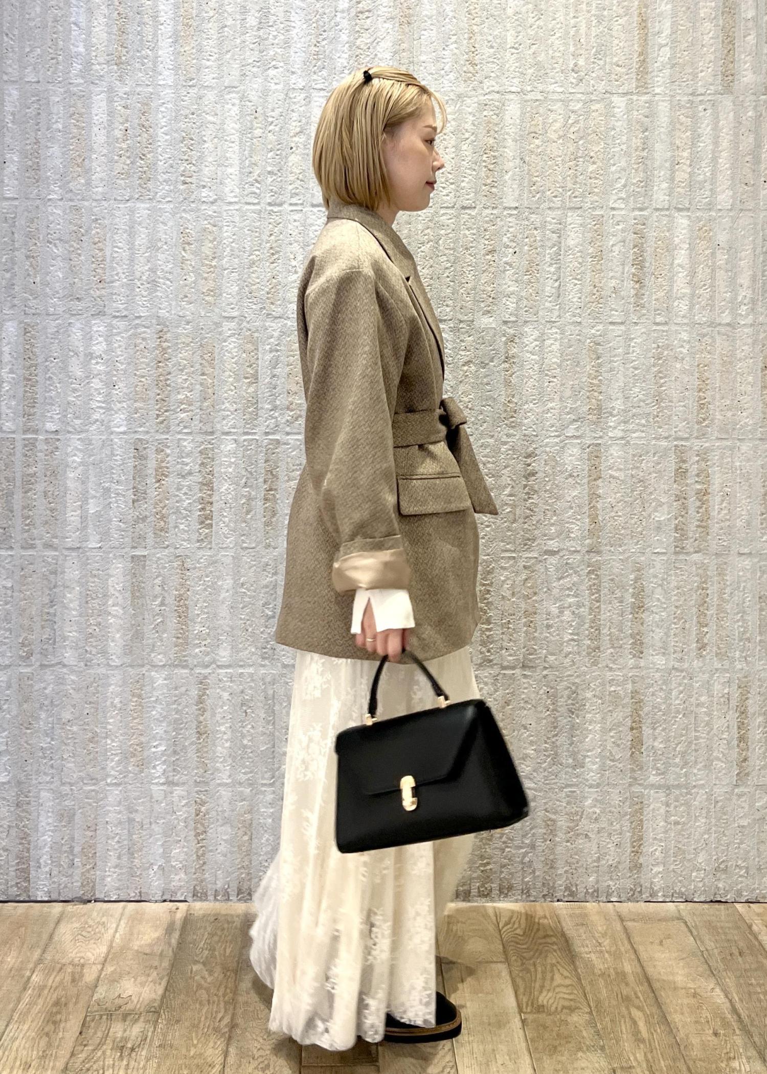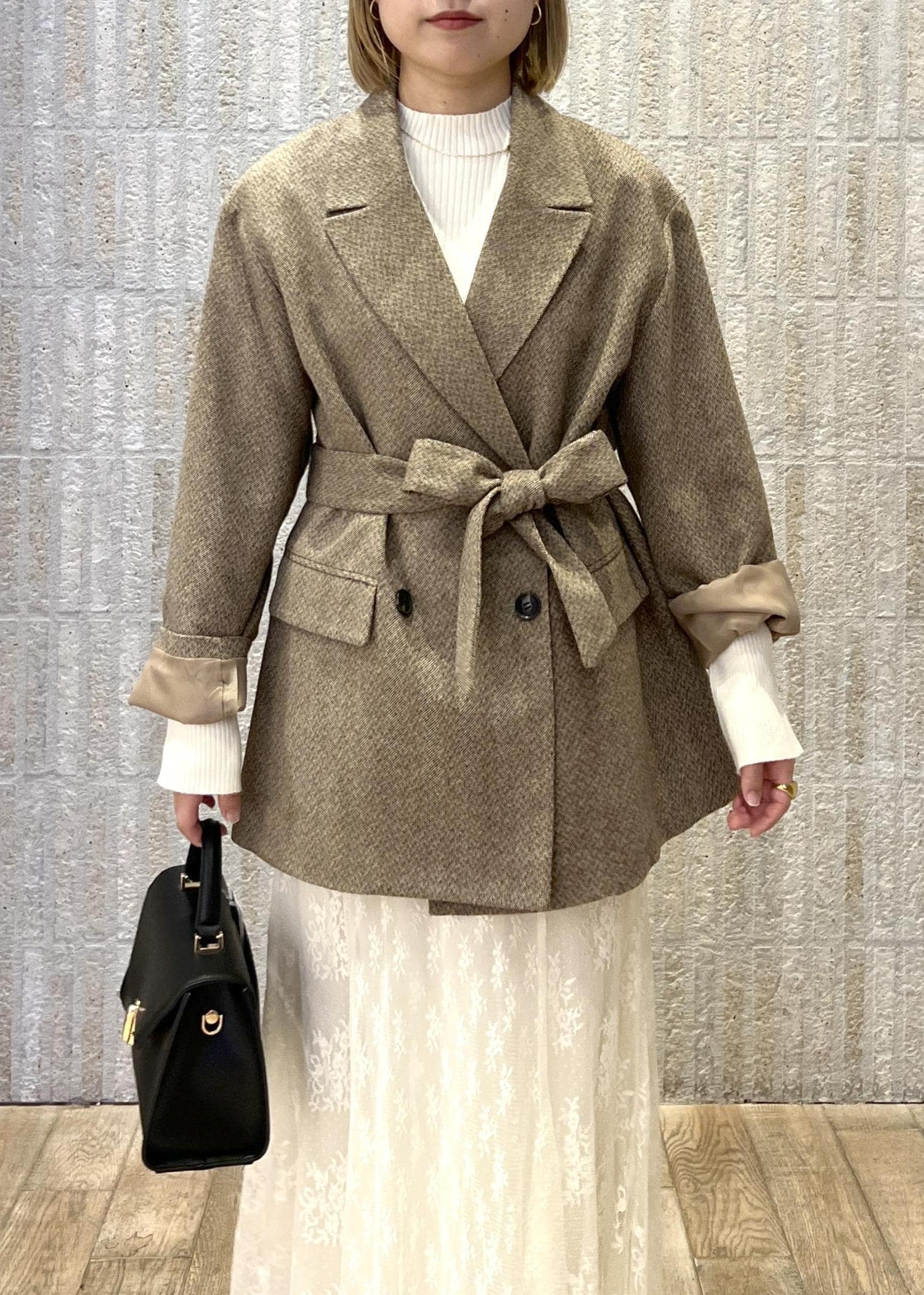 肩幅も大きく見えると思います!それを活かして、ベルトで留めて強弱をつけることで、フェミニン感をプラスさせました。