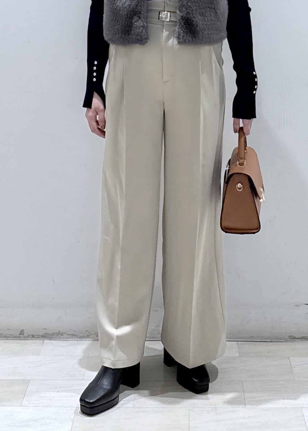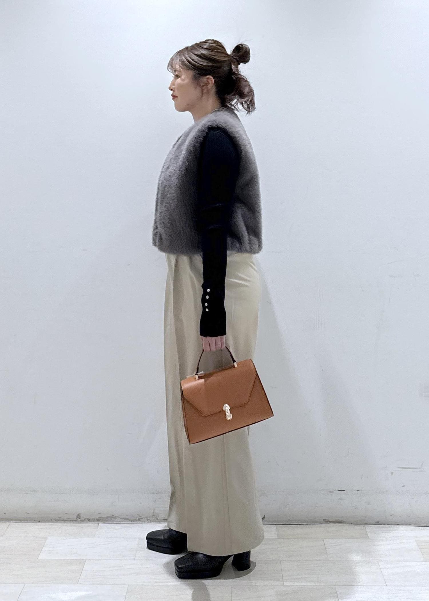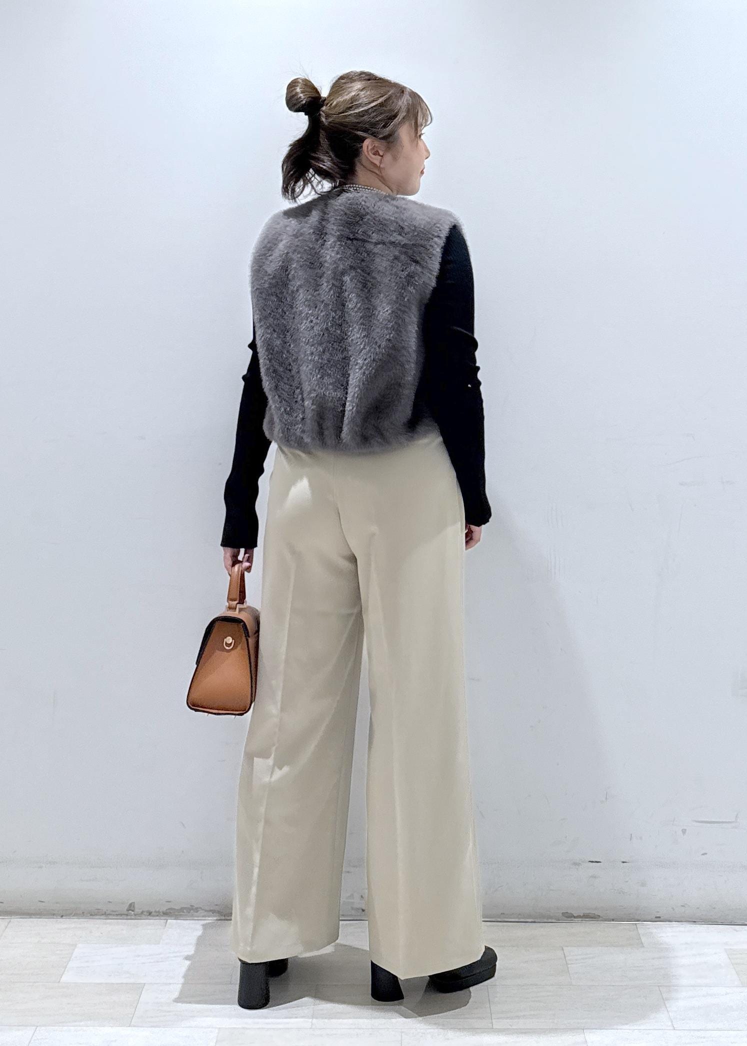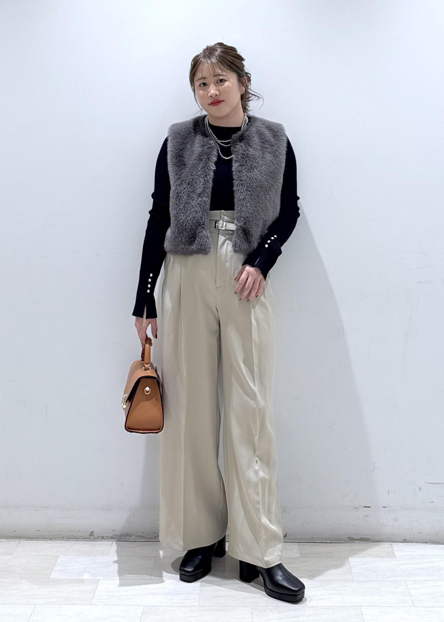 骨格ストレート特有の肩の位置にあったファーベストに、リブニットと合わせると全体的にスッキリとして見えるのでオススメです。また、ハイウエストのボトムスと合わせることによって、脚長効果抜群なのでぜひ真似してみてください