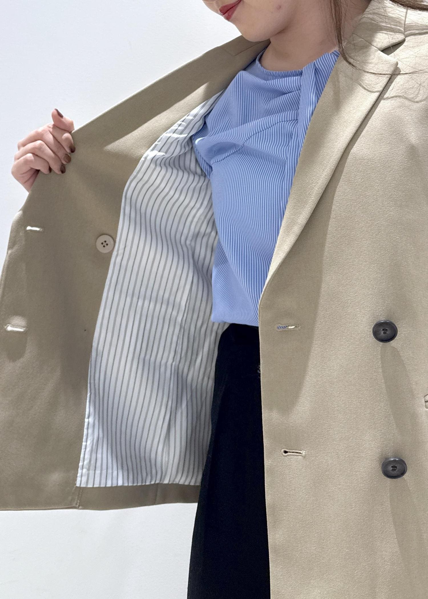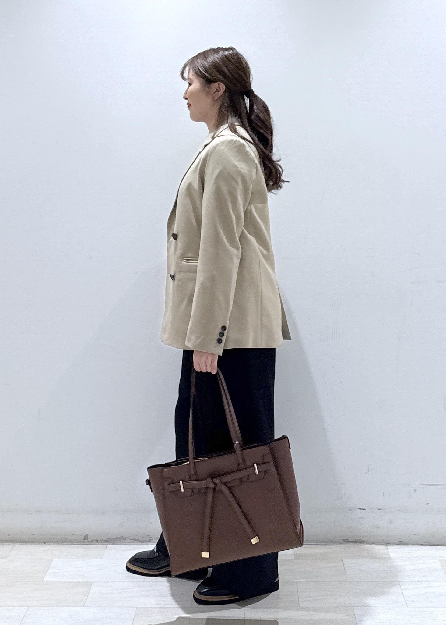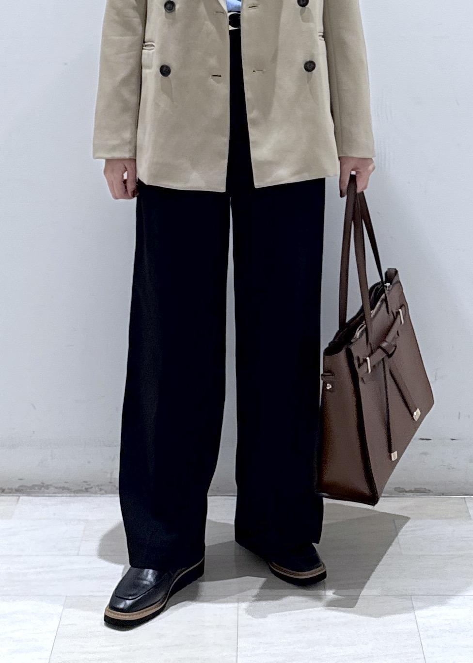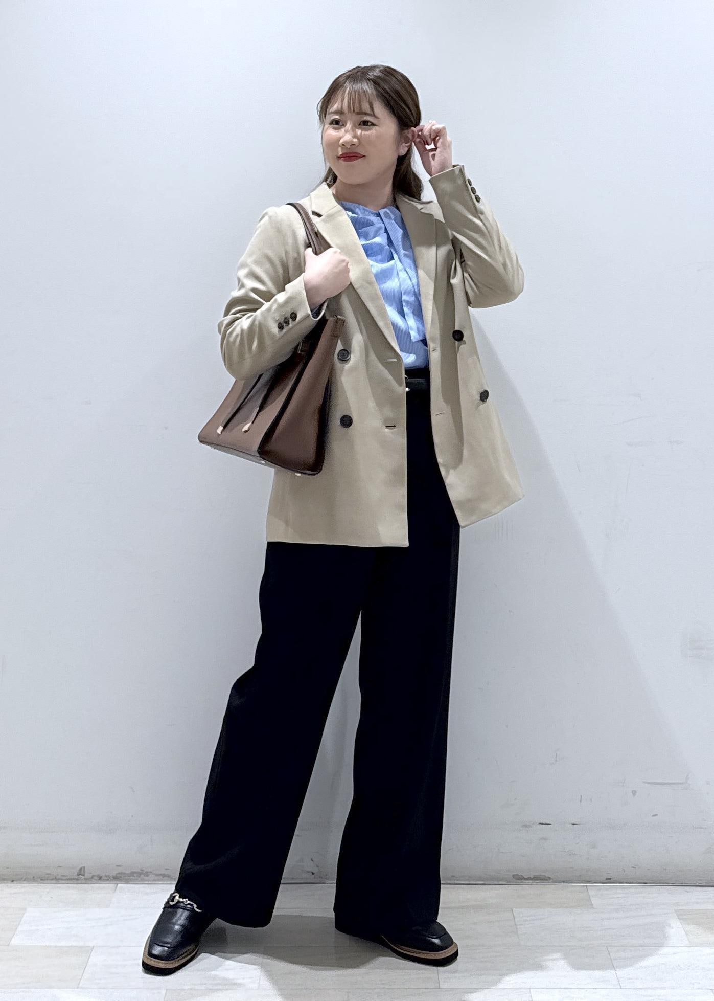 今回はウーリッシュジャケットを使用した、オフィスでも使える綺麗めなコーディネートにしてみました。ベージュとブラックで、一見シンプルに見えますが、差し色のブルーのブラウスと合わせることによって顔まわりを明るくスッキリとした印象にさせています。