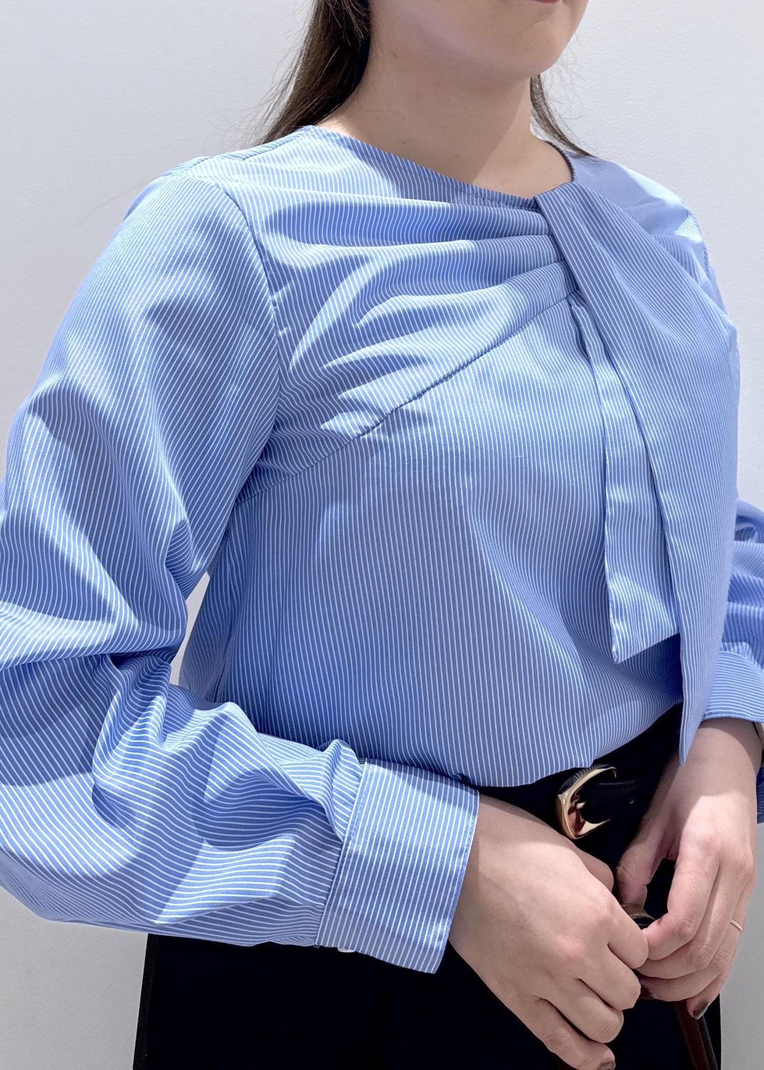 VISフロントねじりデザインブラウスブルー系 / F¥3,842レビューリボン付きのボウタイブラウス⭐︎ポリエステル素材なので、シワ感もつきにくく顔周りもスッキリとして見えました◎ちょうどジャケットやカーディガンを着た時に、ボウタイの部分が見えるので可愛いです!