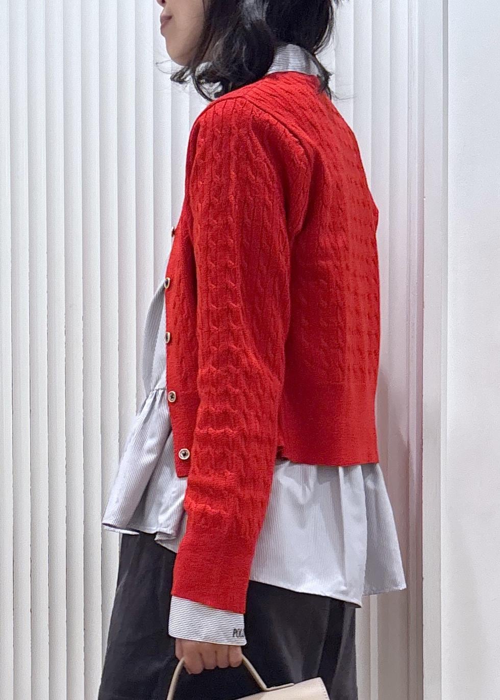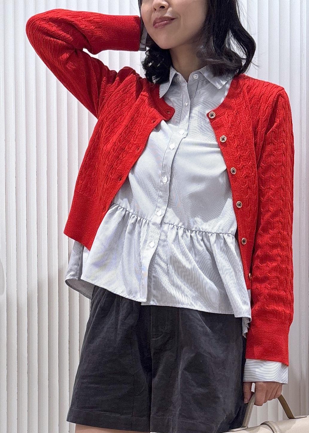 ペプラムのシャツとカーディガンは重ねて着ても、肩がけにしても可愛いですよ。