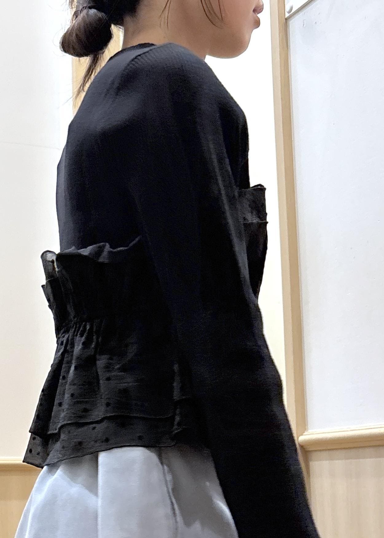 ニット生地は伸びが良く、ほどよい厚みなので秋から冬のトップスとしてしっかりあたたかく着用できます。