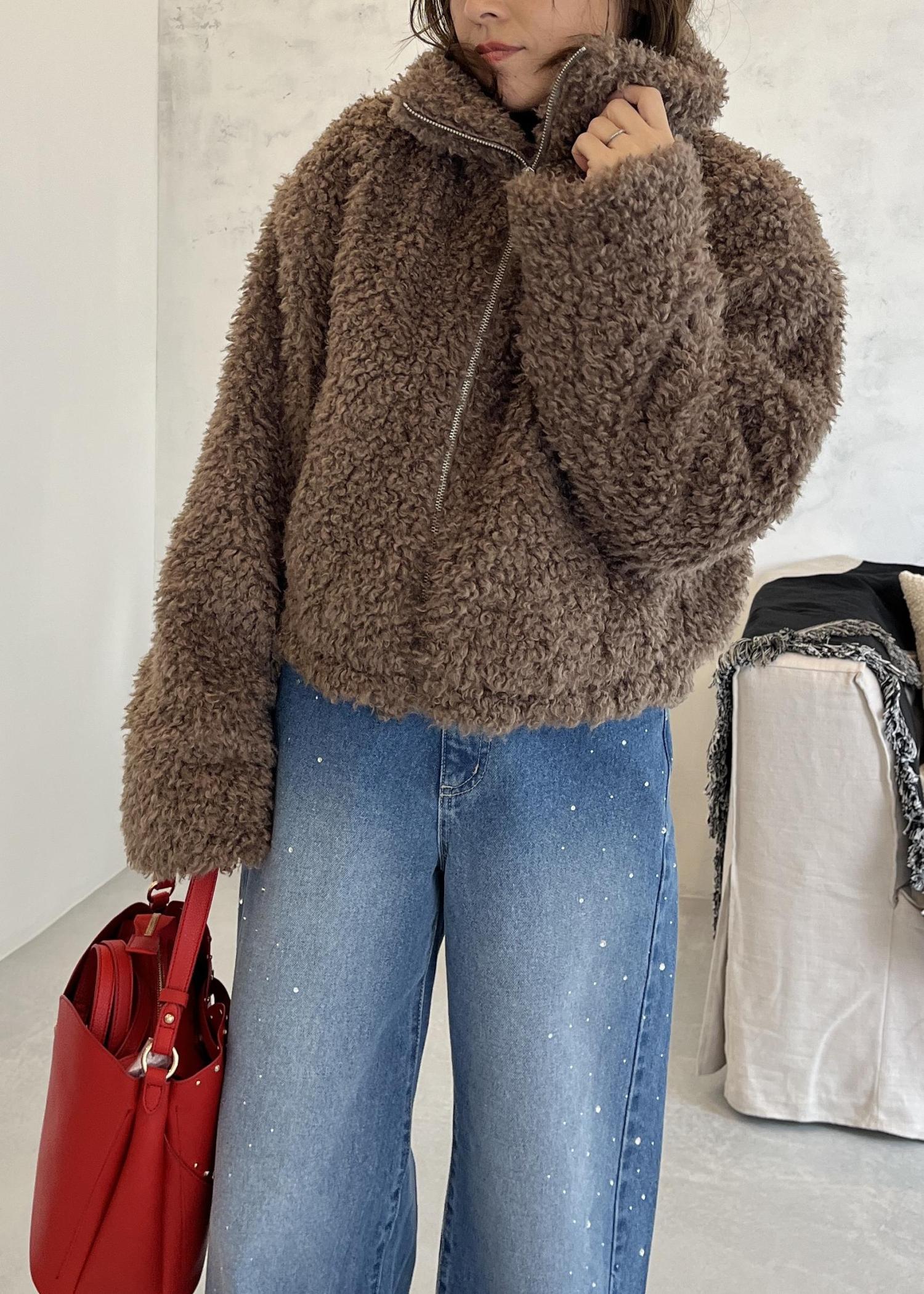 VISブローチ付きアソートファーブルゾンブラウン / F¥14,080レビュー152cmでFサイズ着用し、着丈は腰に少しかかるくらいの短め丈。小柄さんにも合わせやすい長さです。ふわふわモコモコの素材感で季節感◎やや大きく見えるサイズ感なので、インナーは細身なもので、ボトムにはボリュームをつけるのが骨ナチュラルさんにはお勧めなスタイリングです。遊び心あるアウターはプラスアイテムとして持っておきたいです!