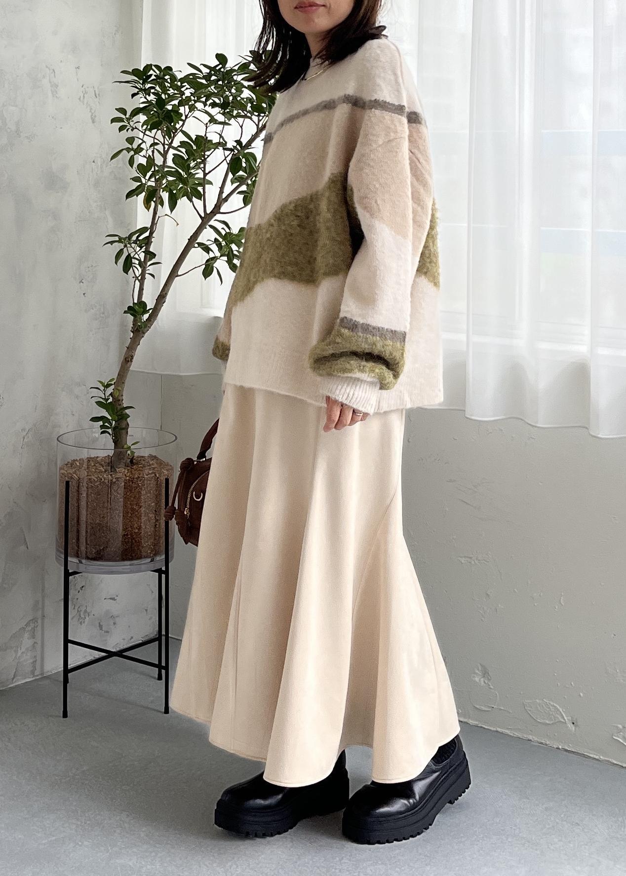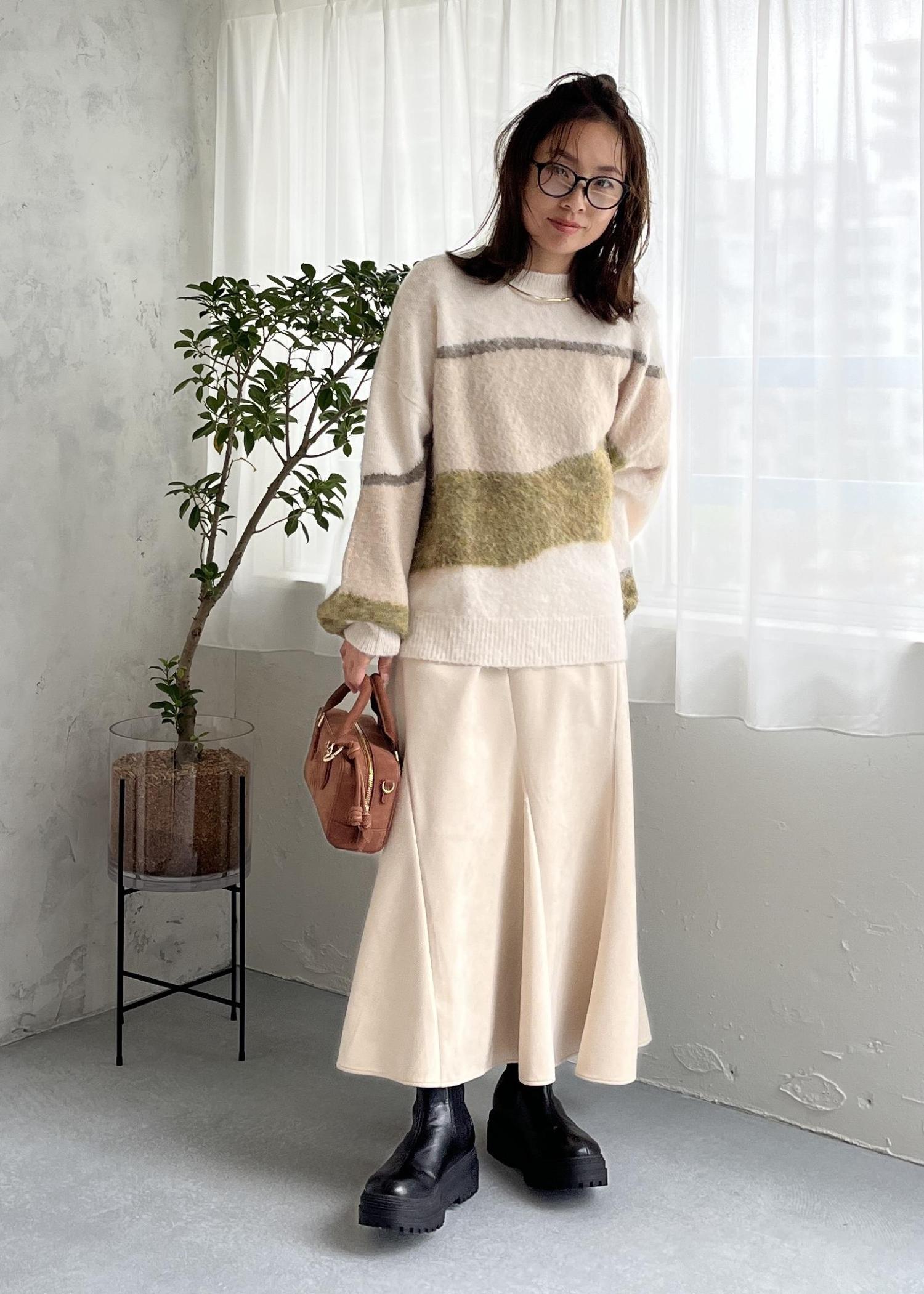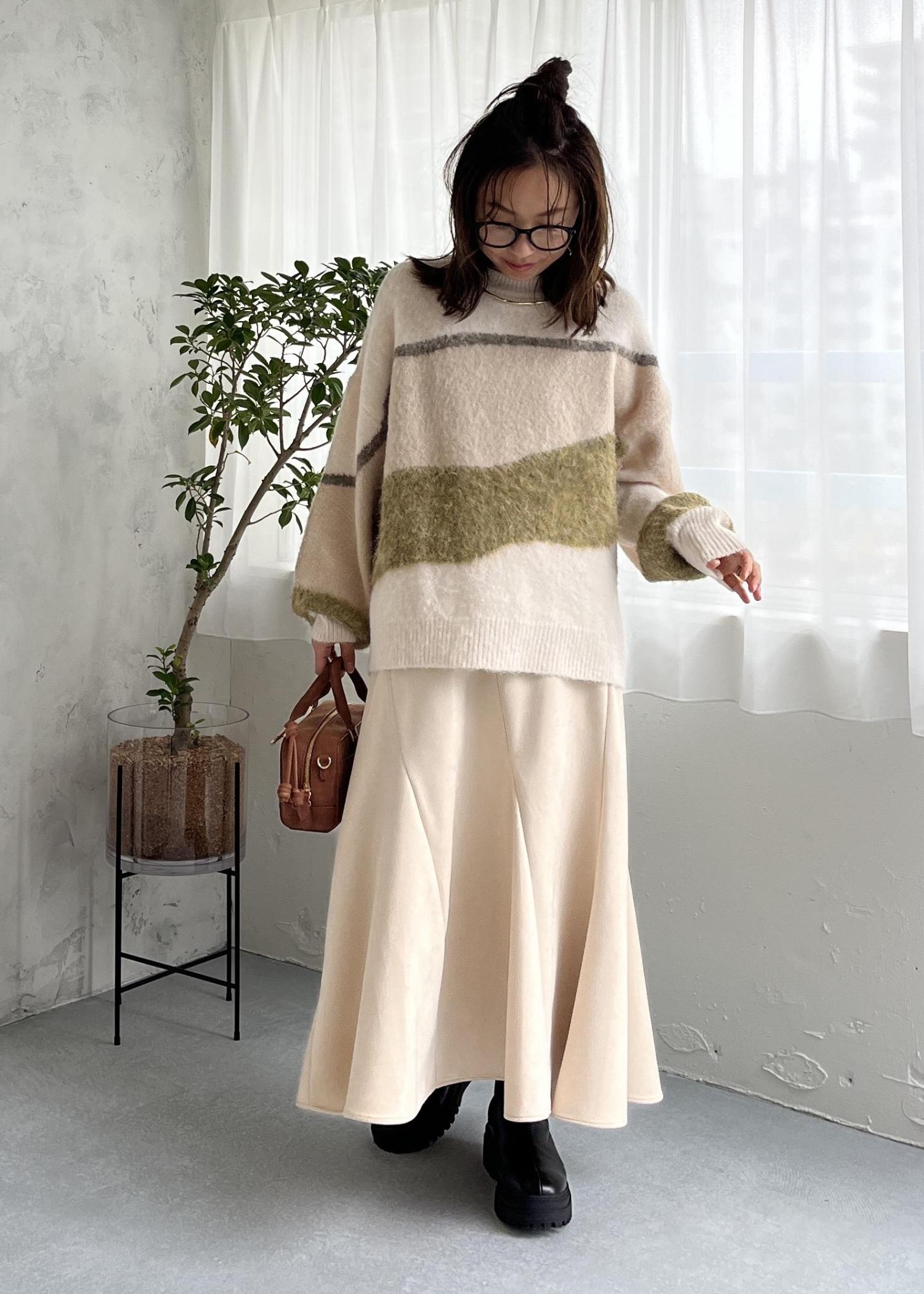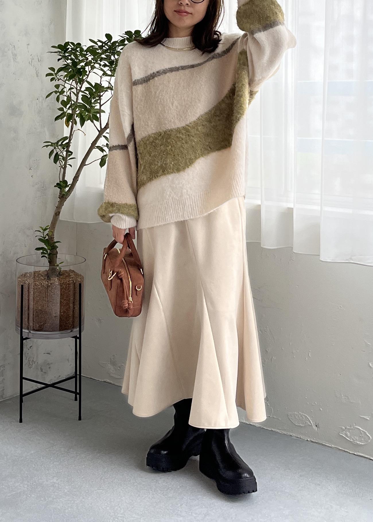ふんわりグラデーションのオーバーニットを主役に、フェイクスウェードのマーメードスカートで動きをプラス。