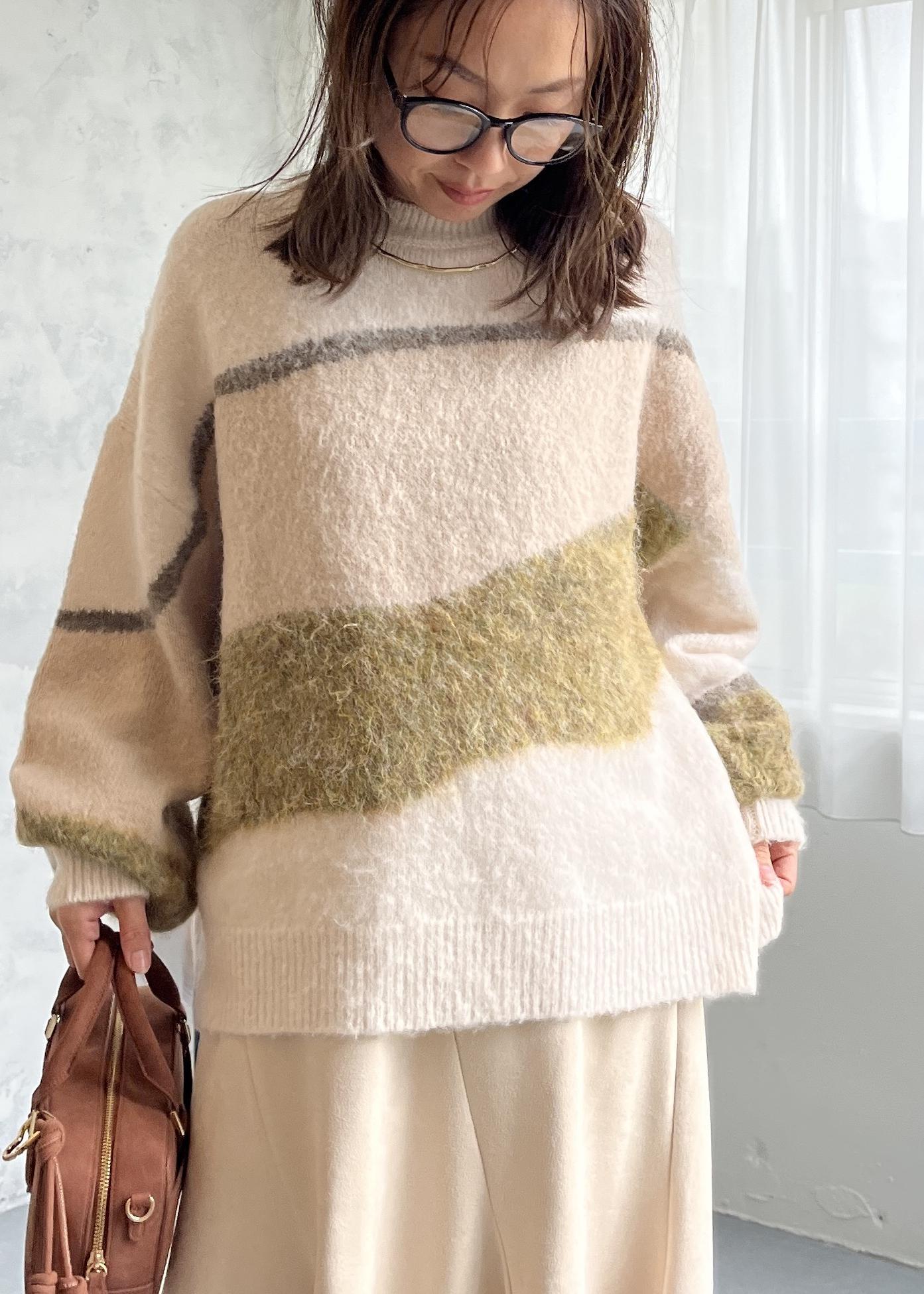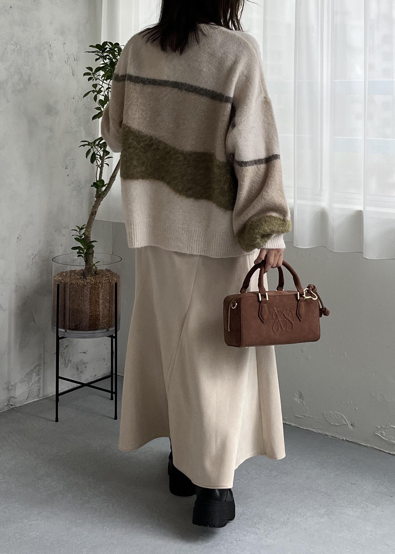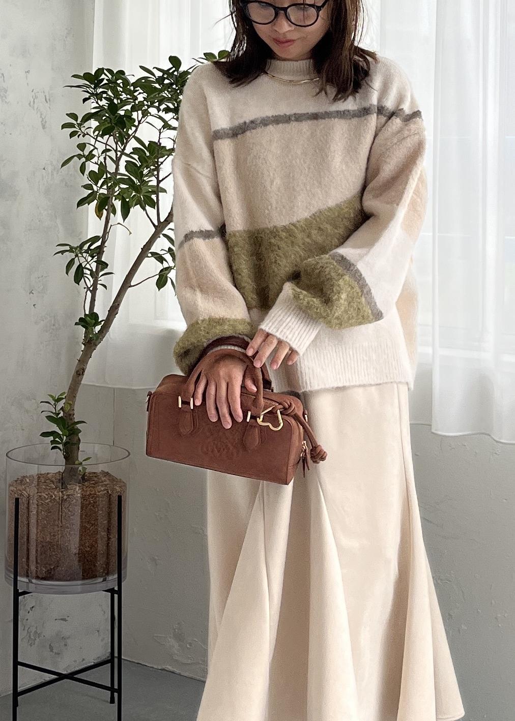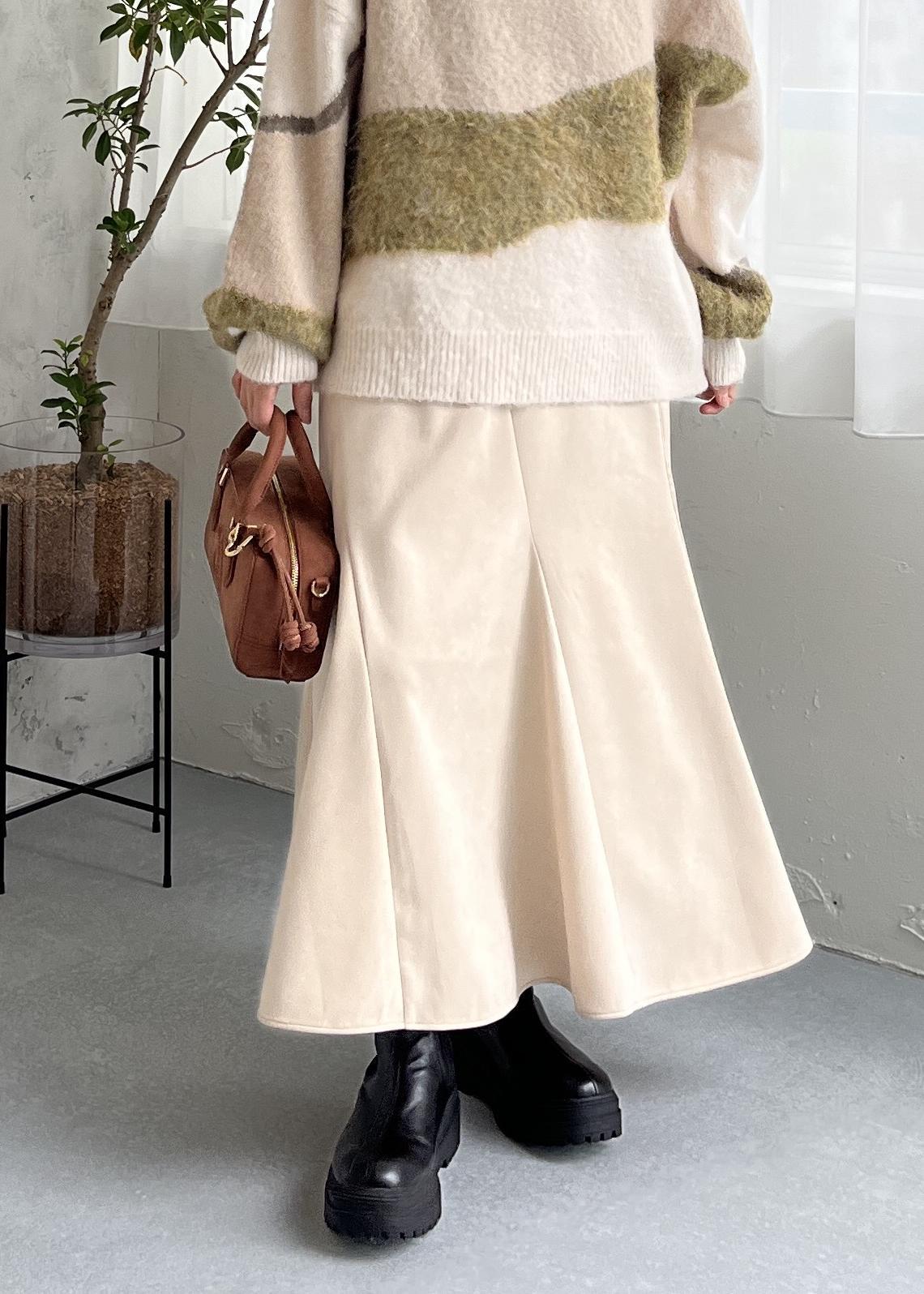 ふんわりグラデーションのオーバーニットを主役に、フェイクスウェードのマーメードスカートで動きをプラス。