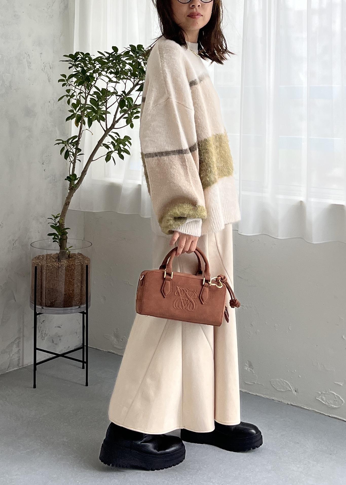 トーンを白系でまとめつつ、ブーツの黒とスウェードバッグのブラウンで秋らしい引き締めを。