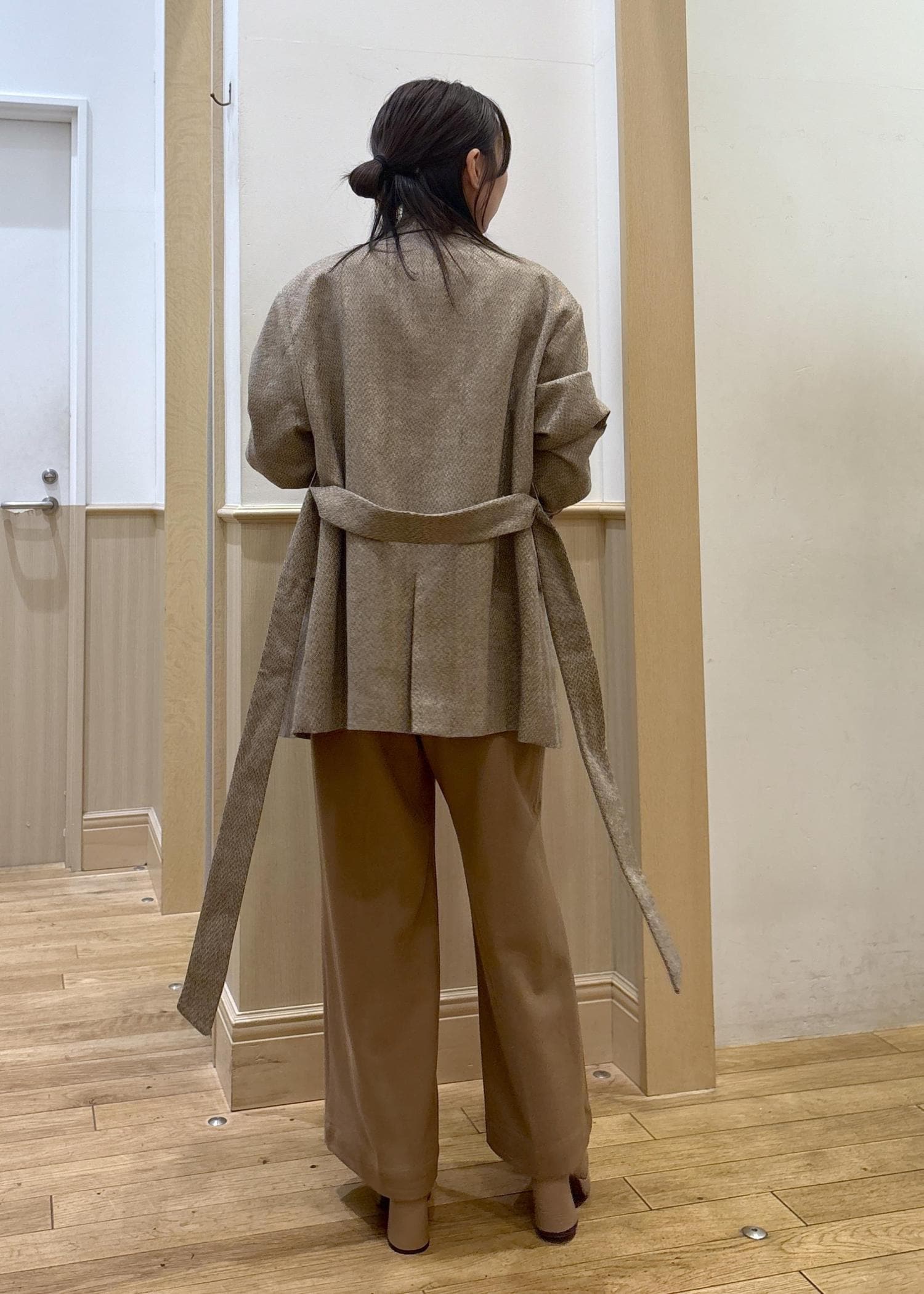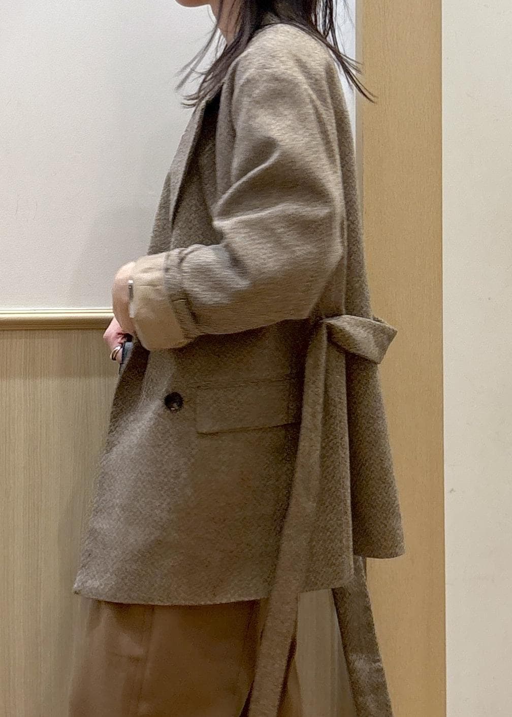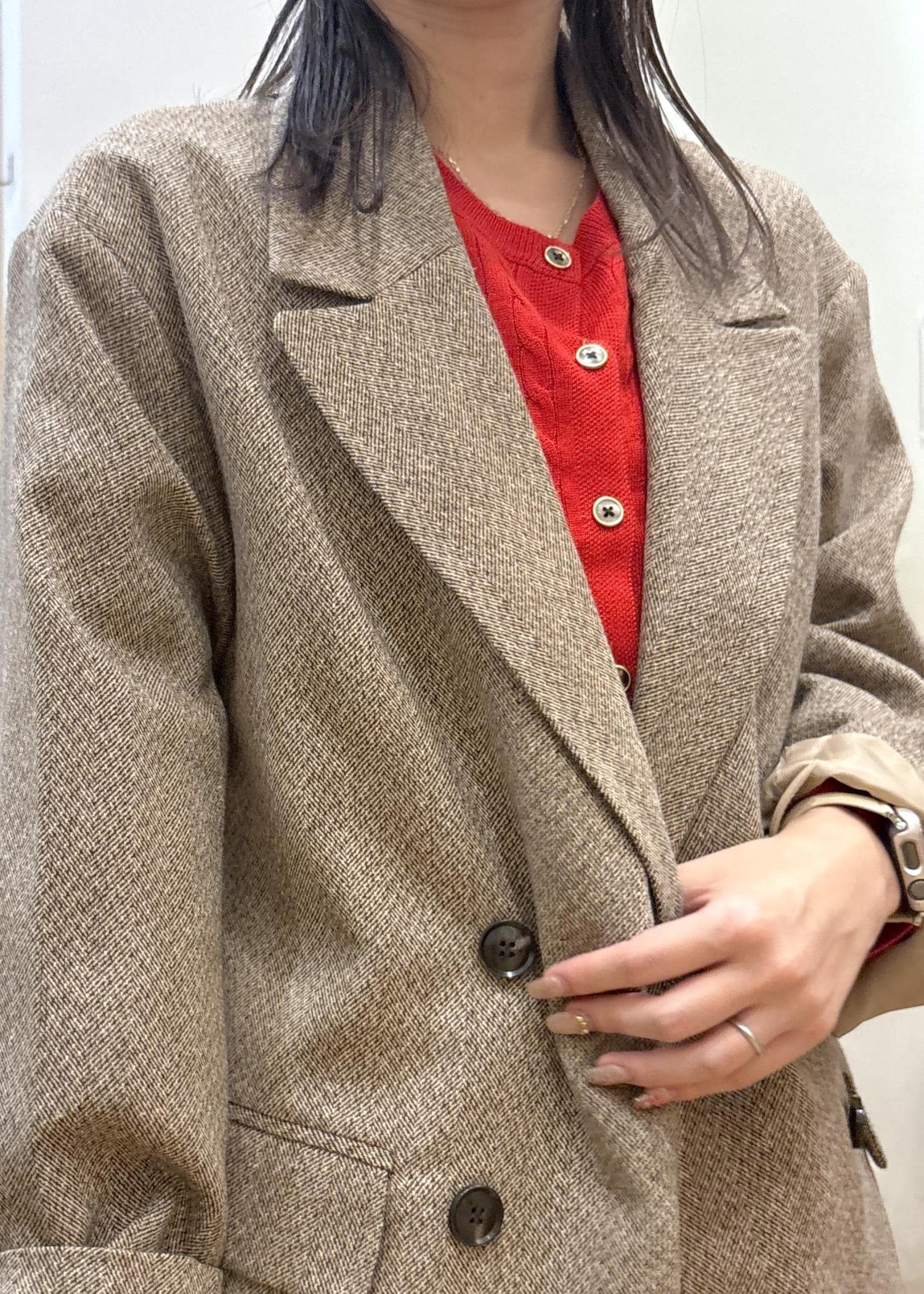 VISヘリンボーンツイードベルテッドジャケット/セットアップ対応ベージュ系 / F¥9,999レビュー生地が裏地付きでしっかりしていますが、軽くて着用しやすく、秋冬のお出かけ用の室内着としてもかさばらず、暑すぎずな素材でした。