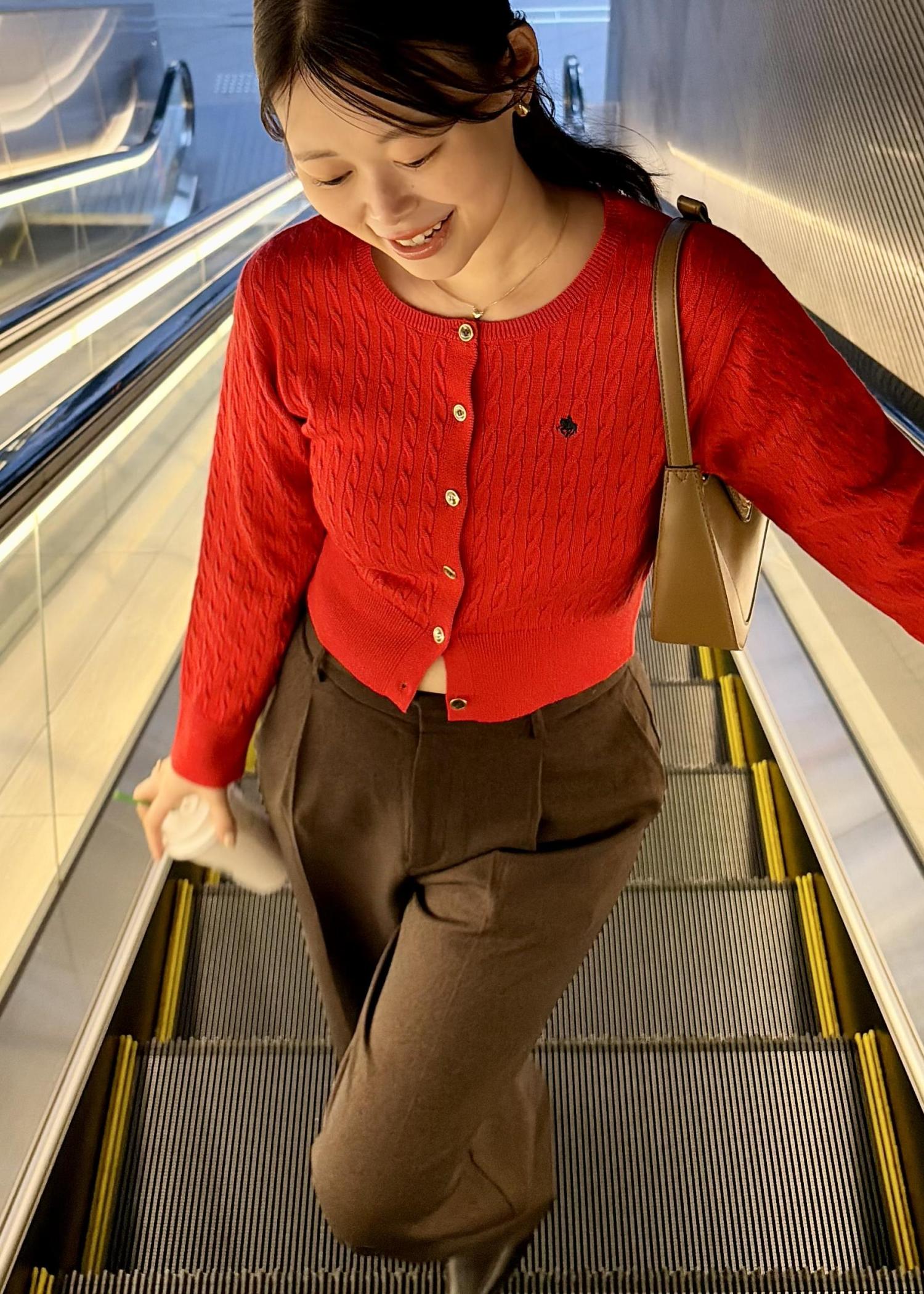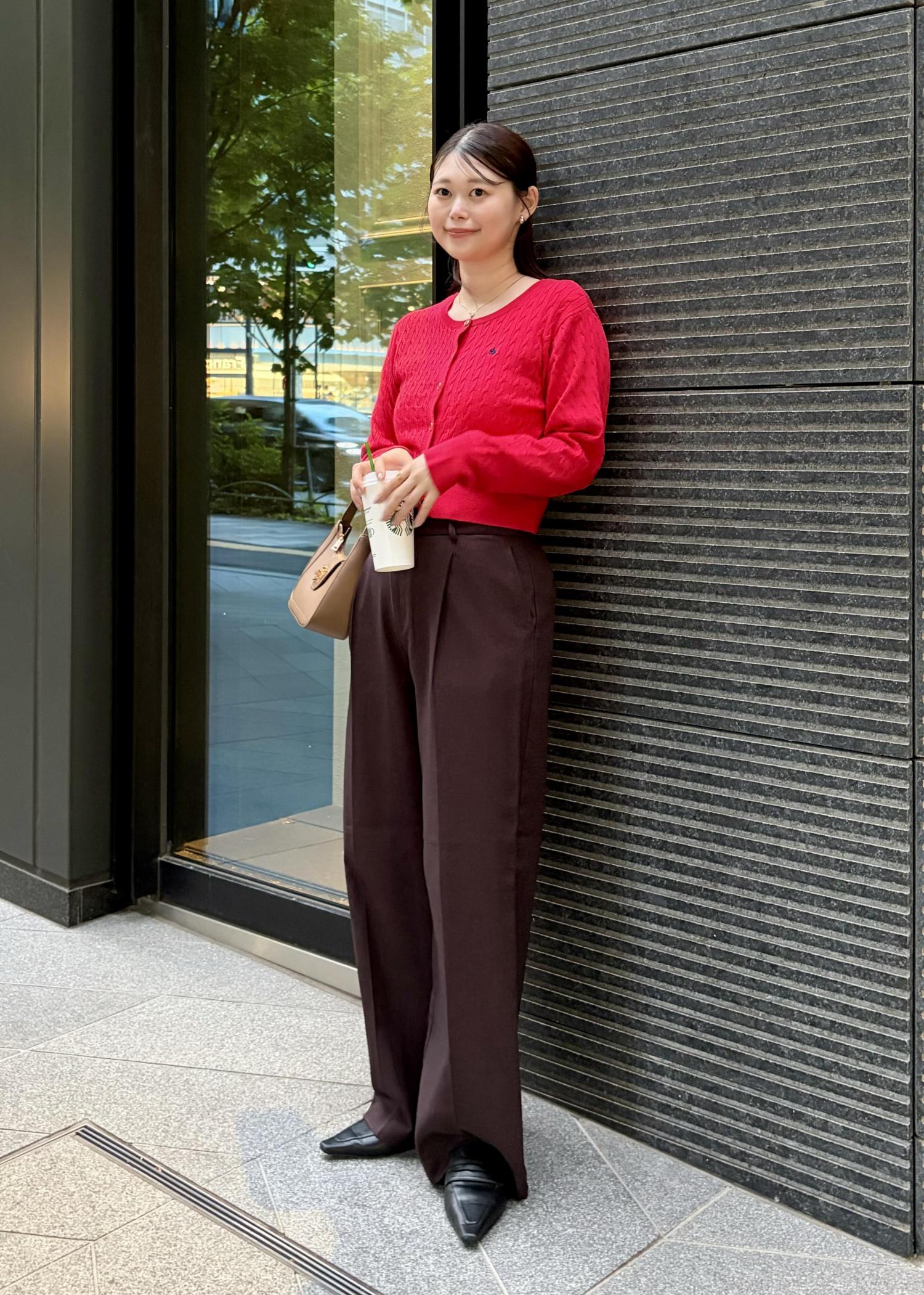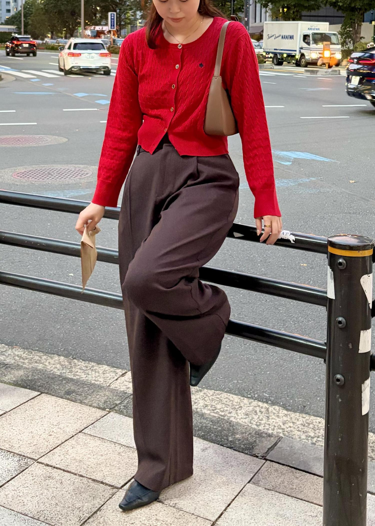 POLOの新色カーディガンは赤に、ブラウンカラーのワイドパンツを合わせ、秋に着たいスタイリングに◎