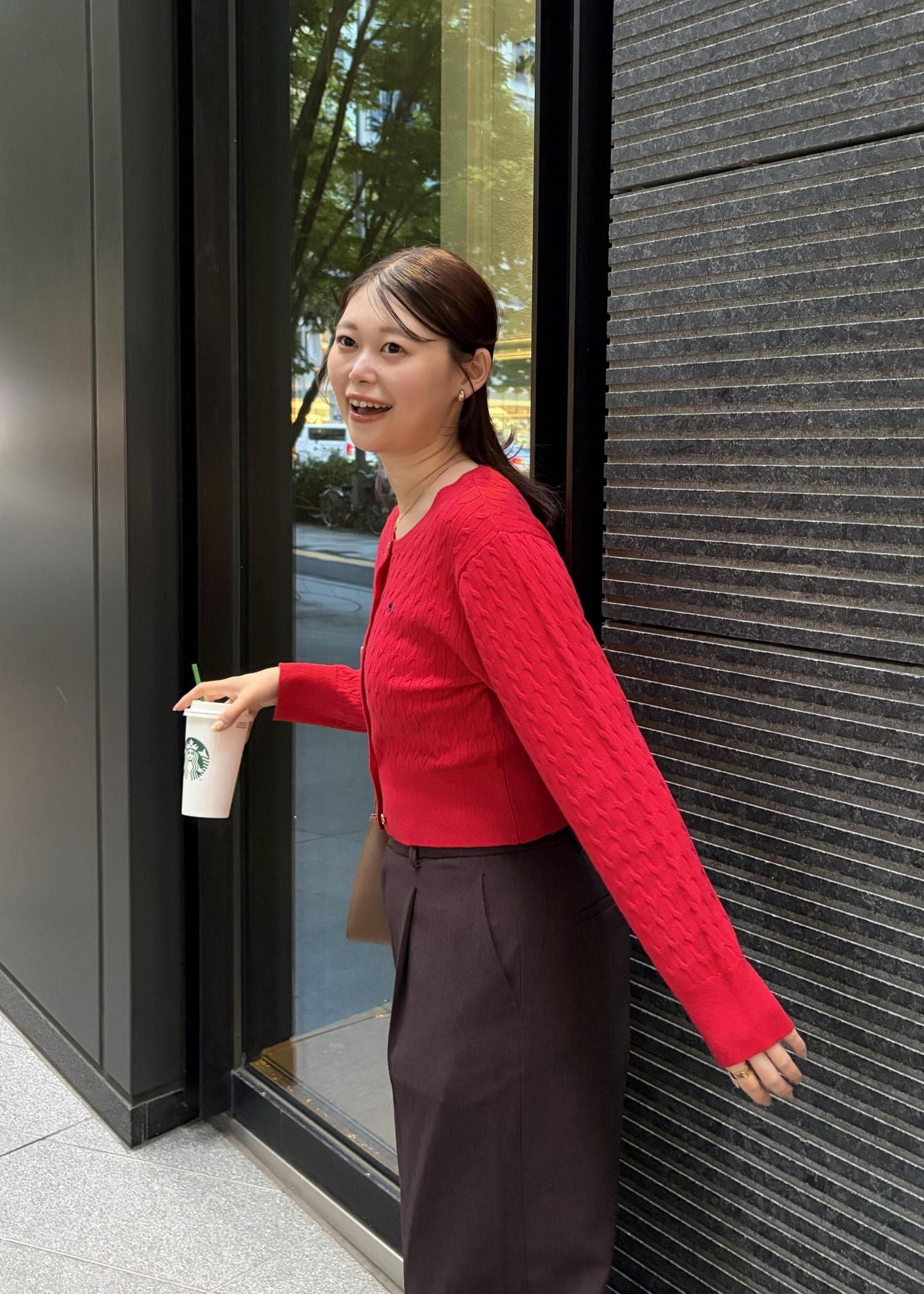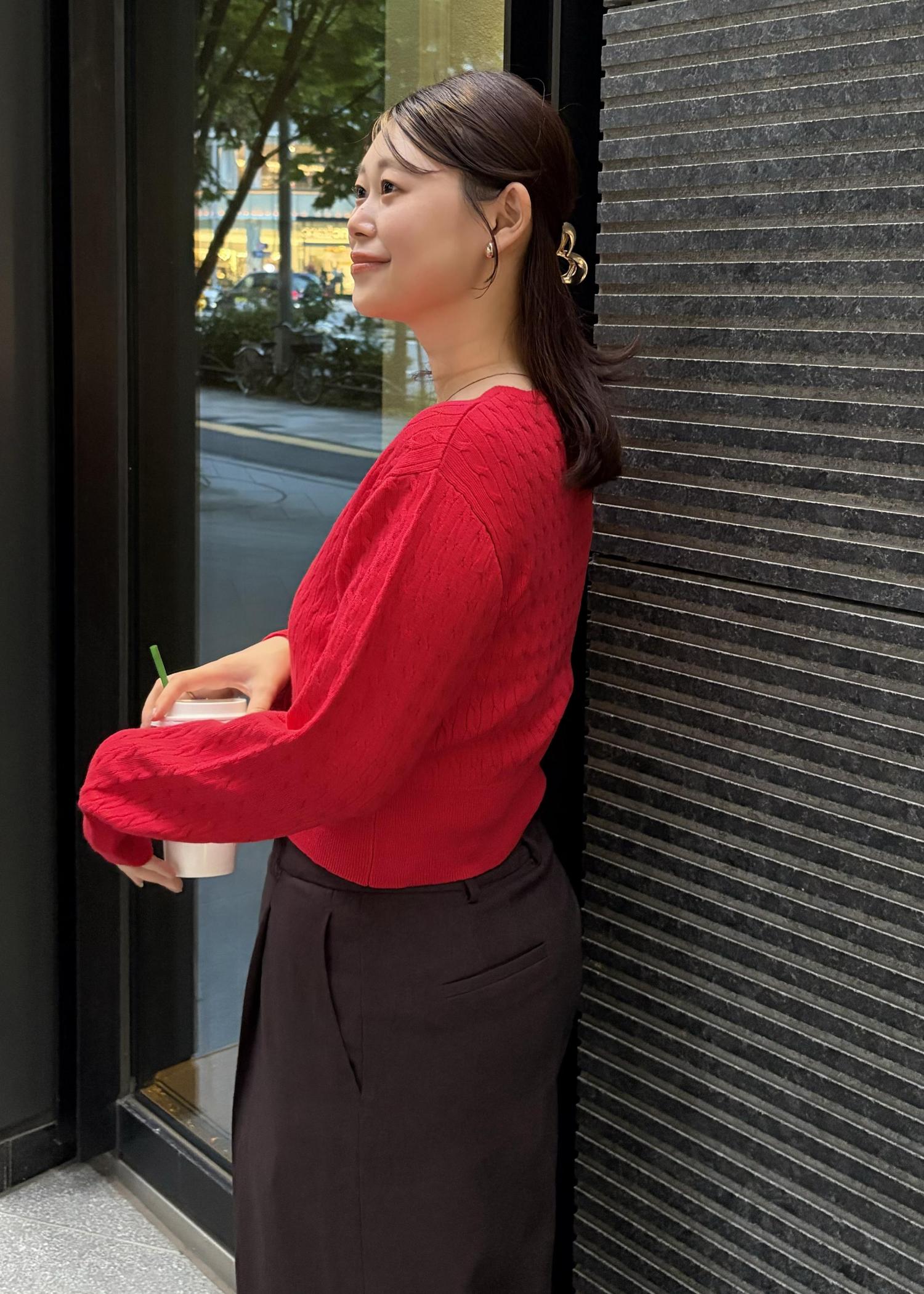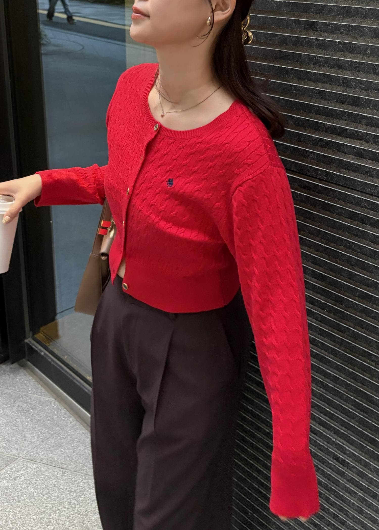 VIS【POLO BCS】VIS別注ミニケーブルノーカラーニットカーディガンレッド / F¥6,930レビューコンパクトなサイズ感と薄手なケーブル素材なので、秋口1枚でも着用ができます◎