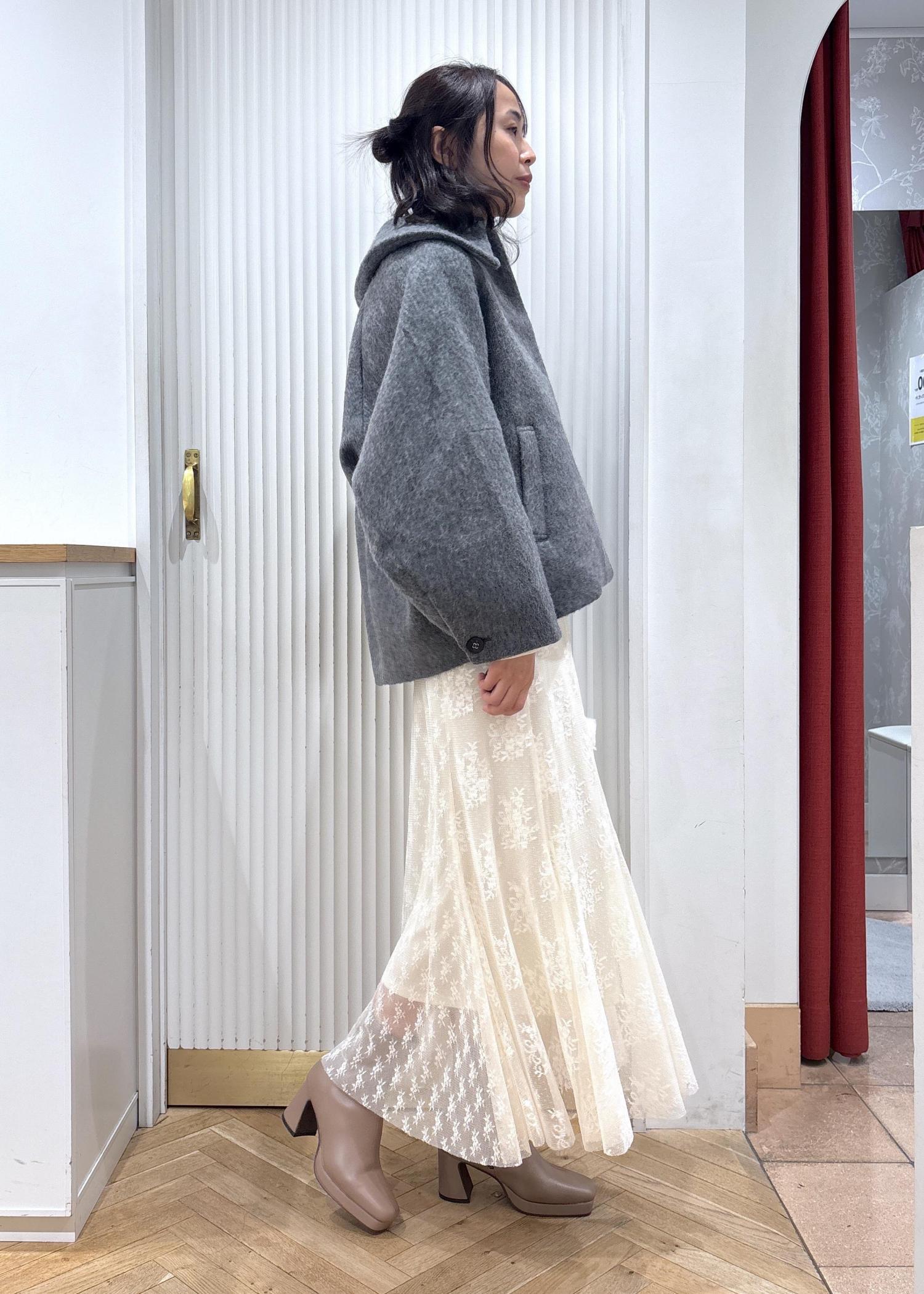 ビッグカラーのコートをレーススカートと合わせたフェミニンコーディネート♡
