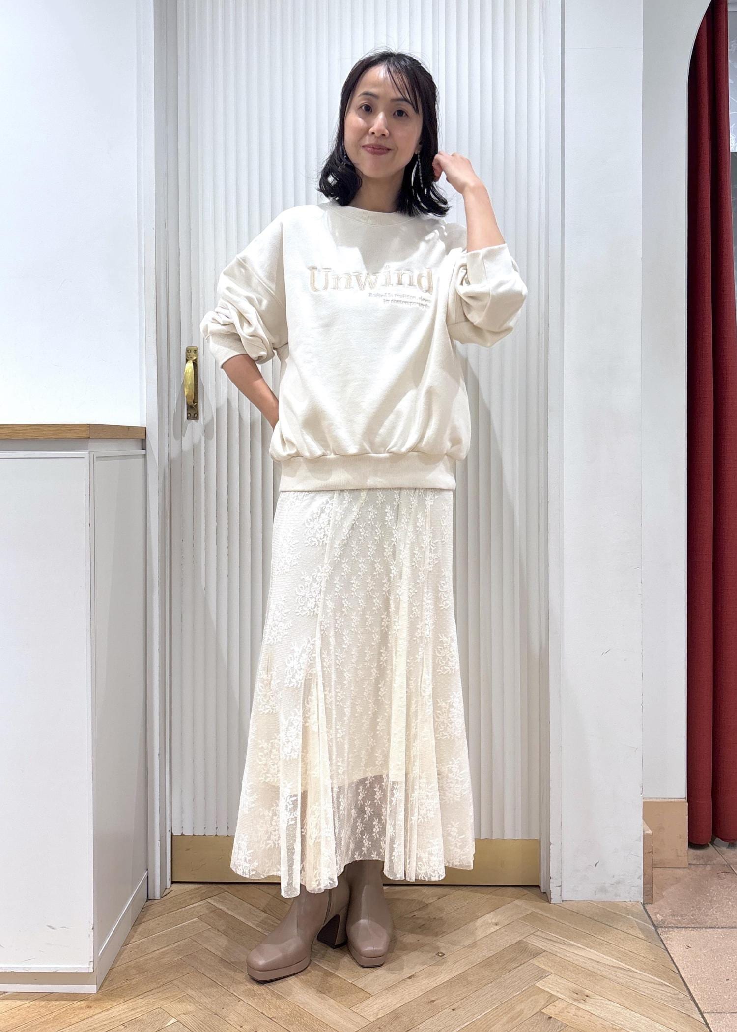 甘すぎないようにインナーはスウェットでまとめて、ワントーンで合わせました。