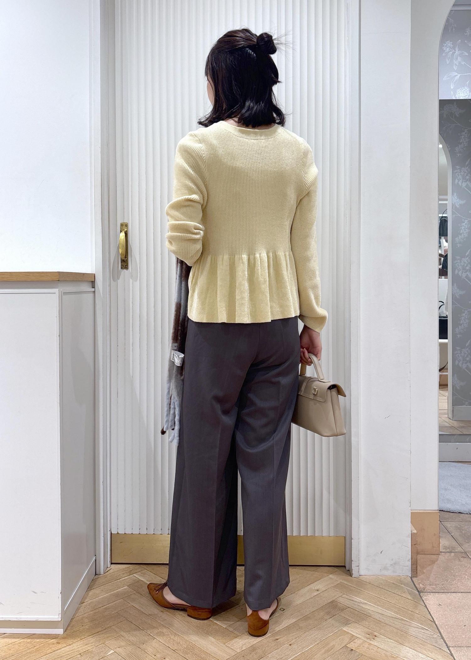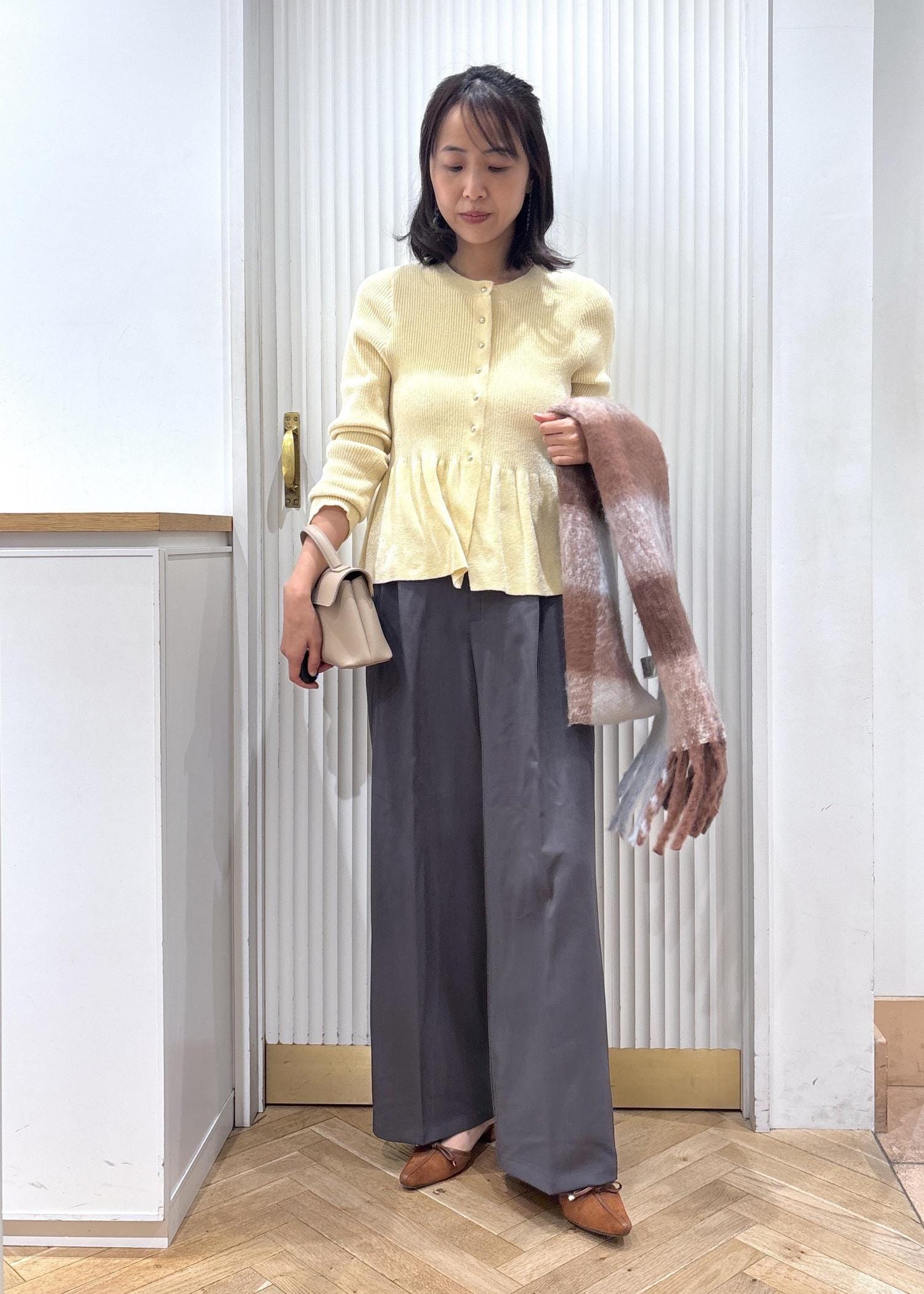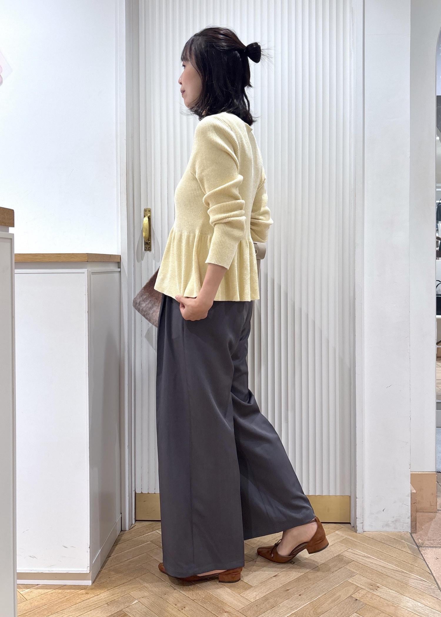 イエローのペプラムカーディガンにグレーのパンツで合わせたきちんとコーディネートです。