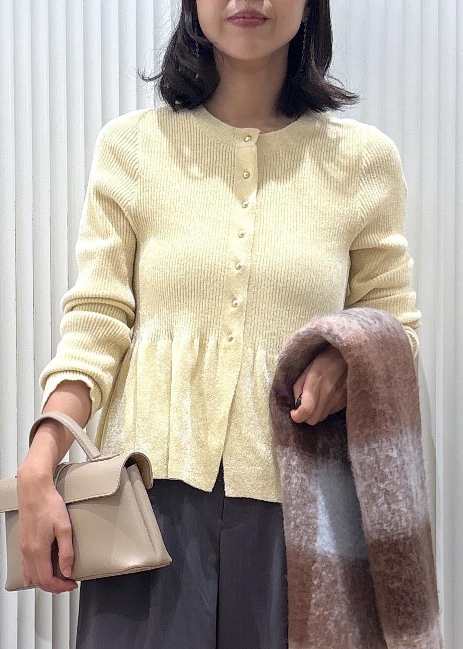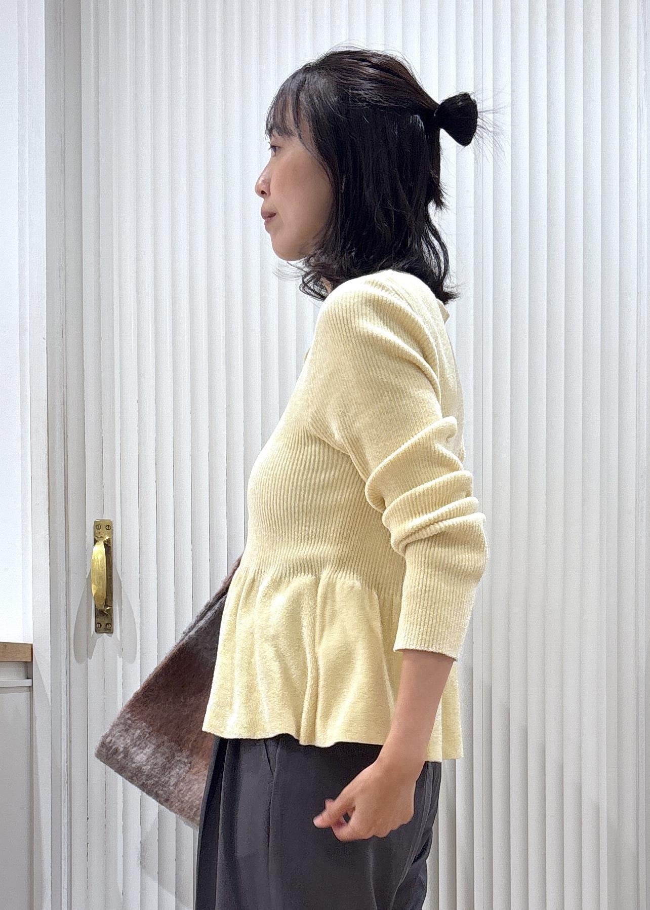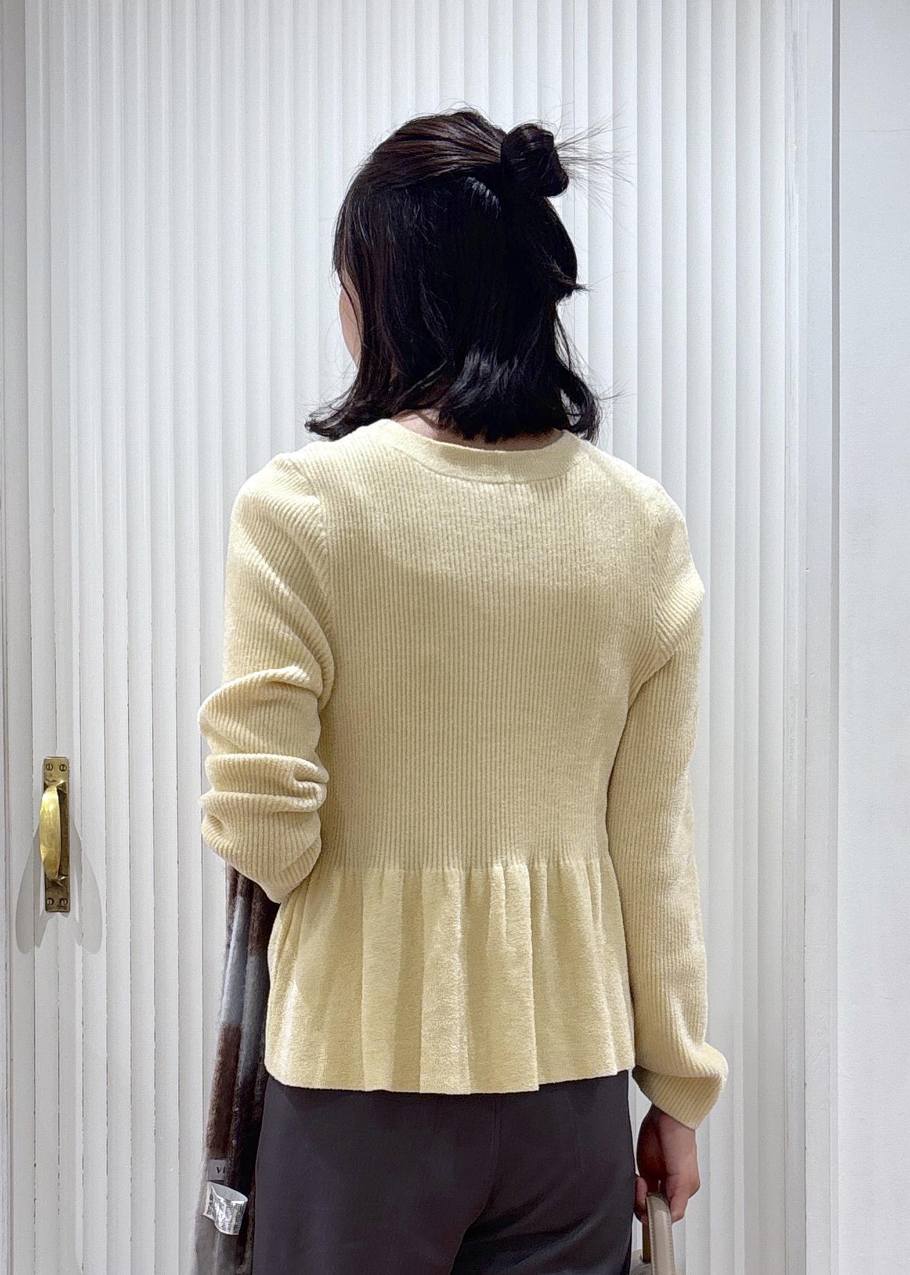イエローのペプラムカーディガンにグレーのパンツで合わせたきちんとコーディネートです。