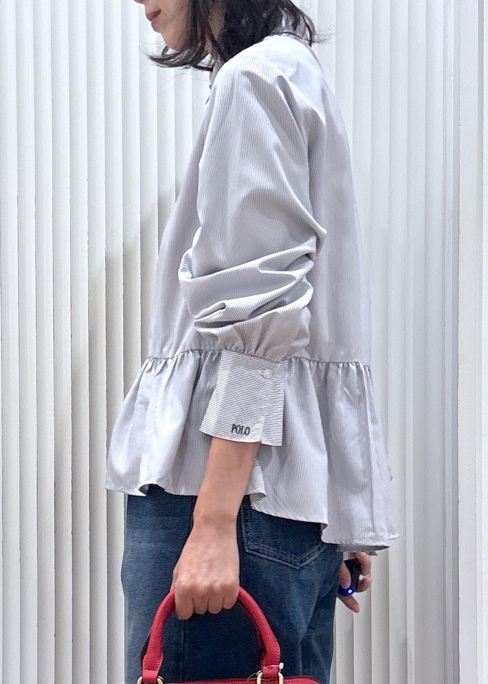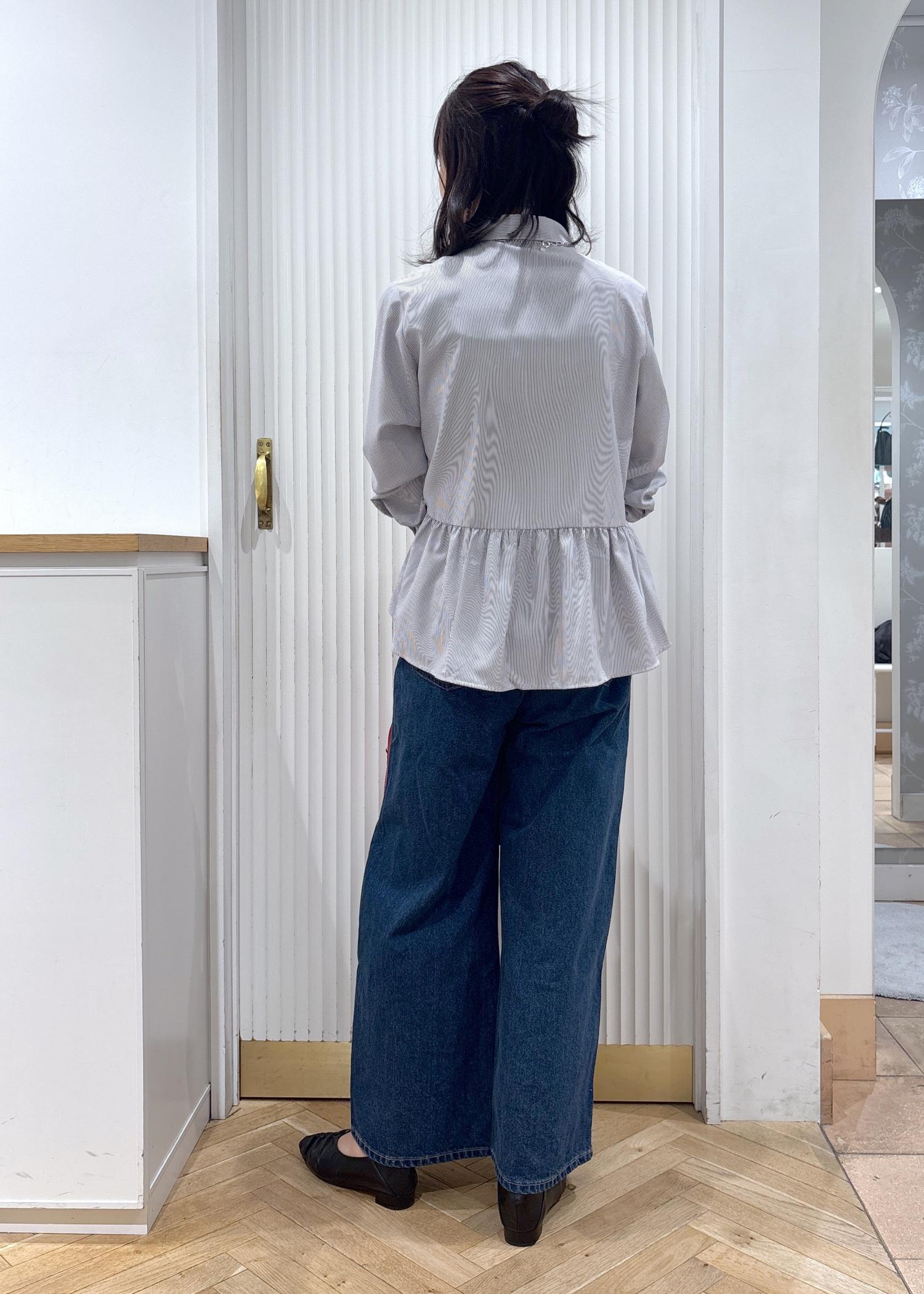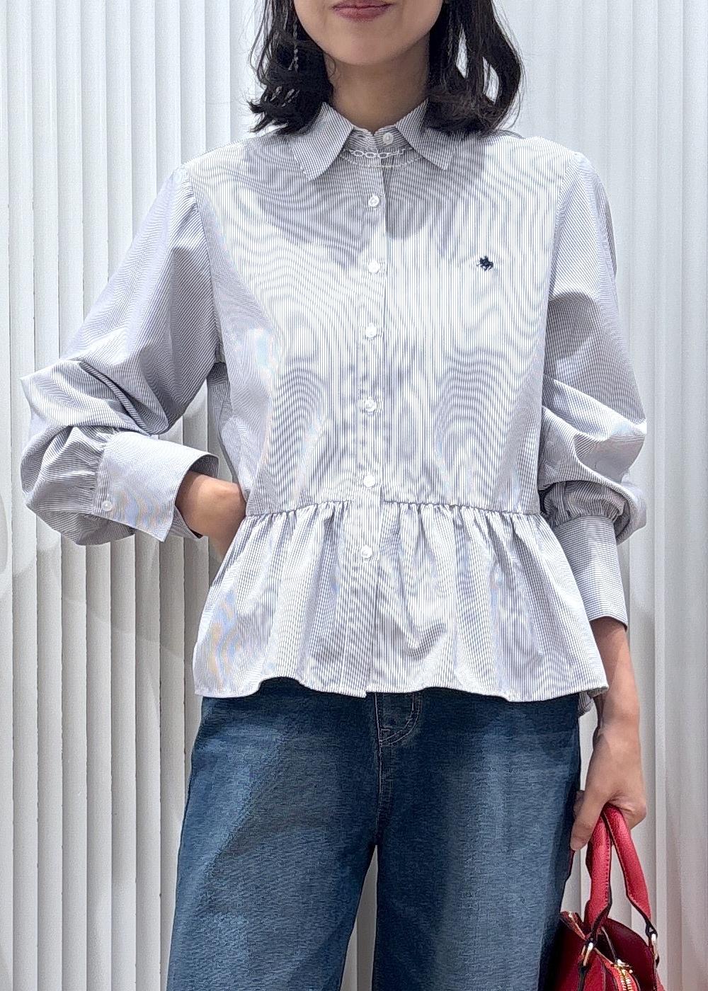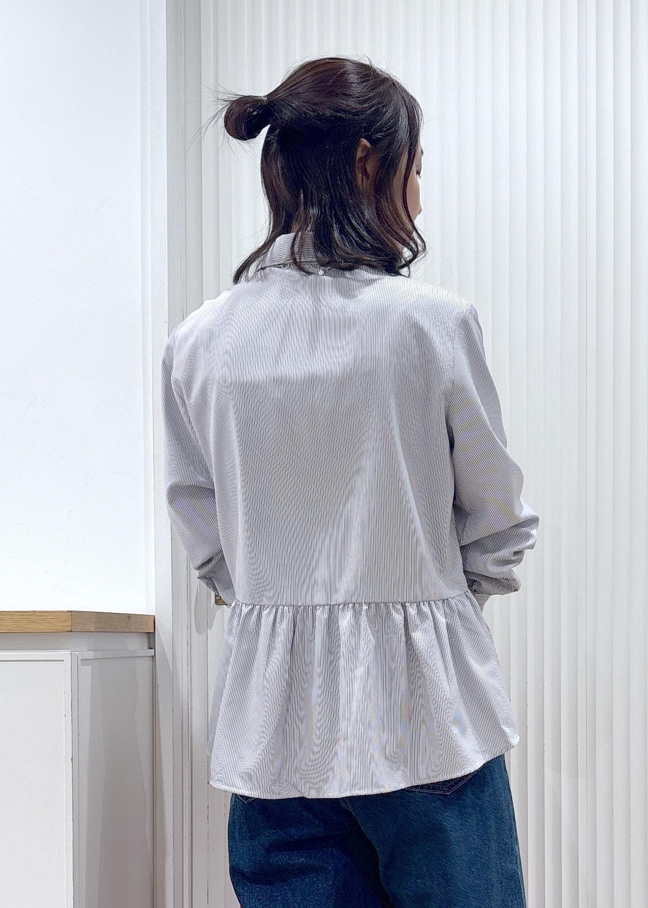 シンプルながらもペプラムのデザインのシャツは滑らかな素材で着心地抜群ですよ。
