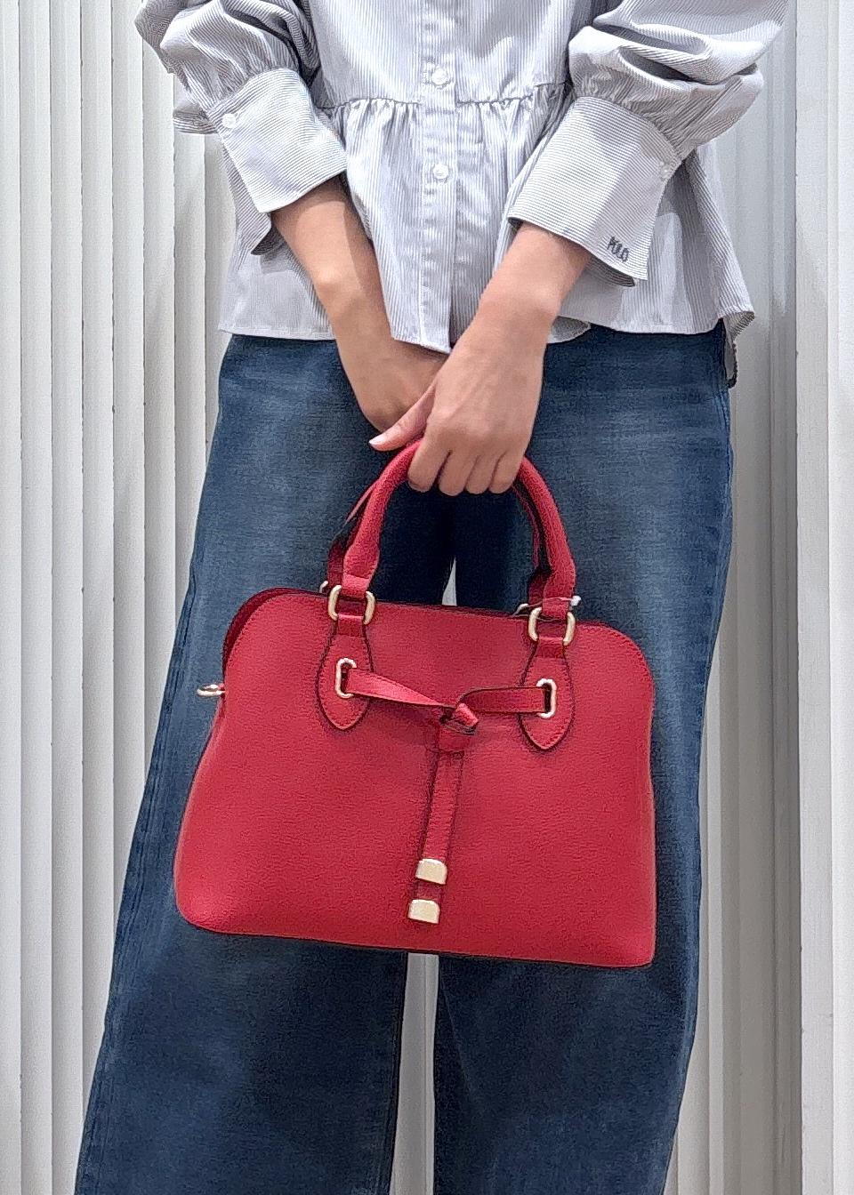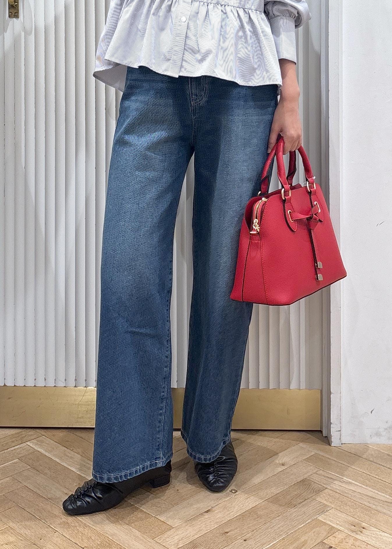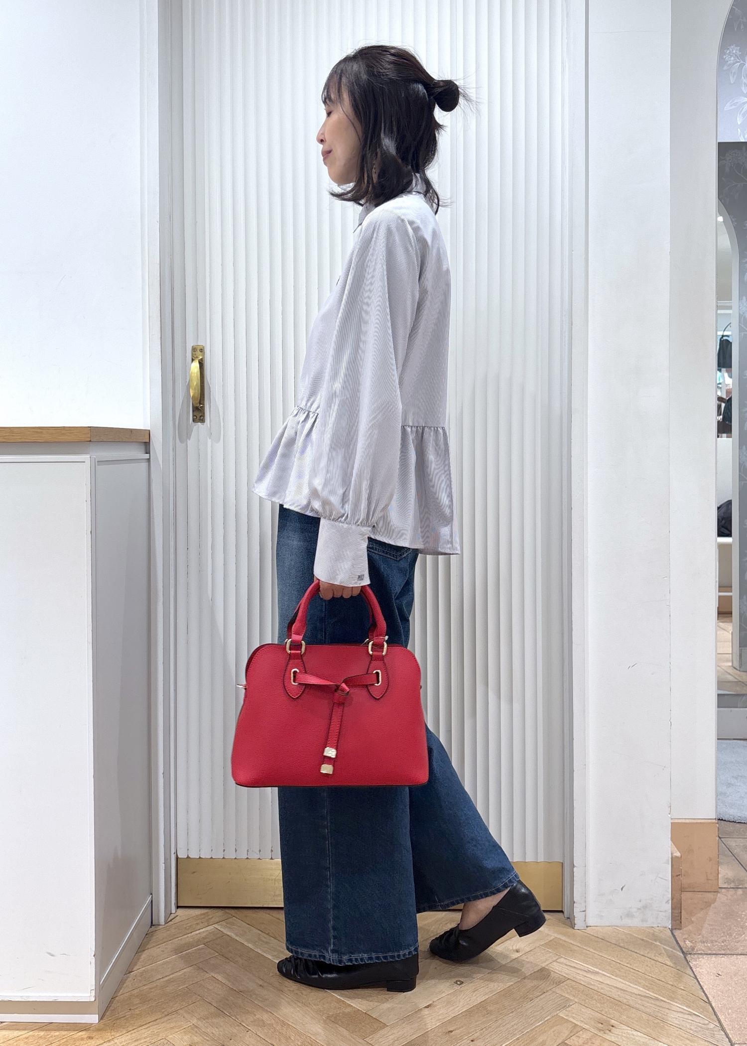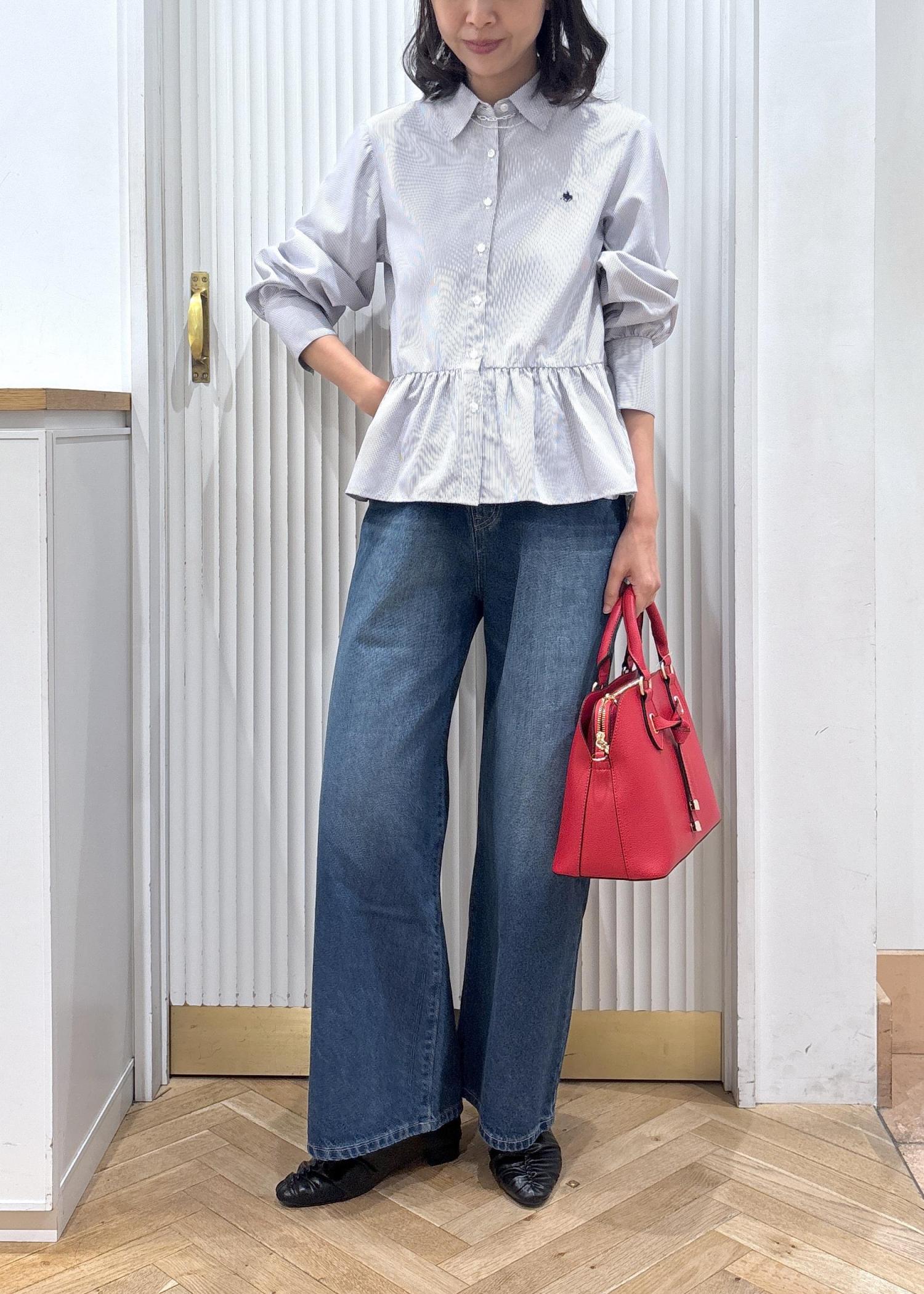 シャツ×デニムのシンプルなスタイリングに赤のバッグを差し色しました。